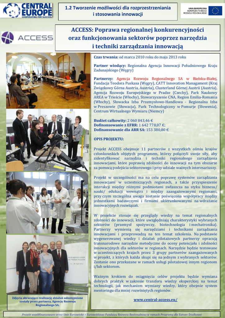 1.2 Tworzenie możliwości dla rozprzestrzeniania i stosowania innowacji ACCESS: Poprawa regionalnej konkurencyjności oraz funkcjonowania sektorów poprzez narzędzia i techniki zarządzania innowacją Czas trwania: od marca 2010 roku do maja 2013 roku Partner wiodący: Regionalna Agencja Innowacji Południowego Kraju Zadunajskiego (Węgry) Partnerzy: Agencja Rozwoju Regionalnego SA w Bielsku-Białej, Fundacja Teodora Puskasa (Węgry), CATT Innovation Managament (Kraj Związkowy Górna Austria, Austria), Clusterland Górnej Austrii (Austria), Agencja Rozwoju Europejskiego w Pradze (Czechy), Park Naukowy AREA w Trieście (Włochy), Stowarzyszenie CNA, Region Emilia-Romania (Włochy), Słowacka Izba Przemysłowo-Handlowa - Regionalna Izba w Preszowie (Słowacja), Park Technologiczny w Pomurje (Słowenia), Centrum Wirtualnego Wymiaru (Niemcy) Budżet całkowity: 2 060 843,46 € Dofinansowanie z EFRR: 1 642 778,07 €; Dofinansowanie dla ARR SA: 153 380,80 € OPIS PROJEKTU: Projekt ACCESS obejmuje 11 partnerów z wszystkich ośmiu krajów członkowskich objętych programem, którzy połączyli swoje siły, aby zidentyfikować narzędzia i techniki regionalnego zarządzania innowacjami, które poprawią zdolności do innowacji na tym obszarze za pomocą podejścia sektorowego i przy udziale ważnych interesariuszy. Projekt w szczególności ma na celu poprawę systemów zarządzania innowacjami w uczestniczących regionach, a także przyspieszenie interakcji między różnymi podmiotami zwłaszcza na styku biznesu/ nauki/ edukacji wewnątrz i między zaangażowanymi regionami, przy czym szczególna uwaga zostanie poświęcona współpracy między jednostkami badawczymi i firmami ukierunkowanymi na wdrażanie innowacyjnych rozwiązań. W projekcie stosuje się przeglądy wiedzy na temat regionalnych zdolności do innowacji, które uwzględniają charakterystyki wybranych sektorów (przemysł spożywczy, biotechnologia i mechatronika). Partnerzy wymienią się narzędziami i technikami zarządzania innowacjami i przeprowadzą na ten temat szkolenia. Na podstawie wygenerowanej wiedzy i działań pilotażowych partnerzy opracują transnarodowe narzędzie metodyczne do oceny potencjału i zdolności innowacyjnych dla sektorów w regionach. Narzędzie będzie testowane w uczestniczących krajach przez 3 grupy partnerów zaangażowanych w projekt, z których każda skupi się na jednym z wybranych sektorów. Zostanie ono przekazane w ramach usługi pilotażowej innym regionom i/lub sektorom. Ważnym krokiem do osiągnięcia celów projektu będzie wymiana dobrych praktyk w zakresie transferu wiedzy eksperckiej na temat technologii, jak mechanizm wymiany wiedzy, który obejmie system mentoringu dla mniej rozwiniętych regionów. Zdjęcia obrazujące realizację działań udostępnione zostały przez partnera, Agencję Rozwoju Regionalnego SA. www.central-access.eu/ Projekt współfinansowany przez Unię Europejską z Europejskiego Funduszu Rozwoju Regionalnego w ramach Programu dla Europy Środkowej