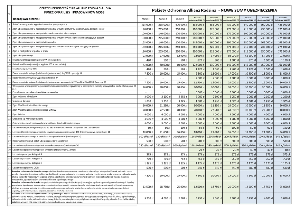 OFERTY UBEZPIECZEŃ TUiR ALLIANZ POLSKA S.A. DLA FUNKCJONARIUSZY I PRACOWNIKÓW MOSG Lp. Rodzaj świadczenia : Pakiety Ochronne Allianz Rodzina - NOWE SUMY UBEZPIECZENIA Wariant I Wariant II Wariant III Wariant I Wariant II Wariant III Wariant I Wariant II Wariant III dodatkowe NNW (5) dodatkowe NNW (5) dodatkowe NNW (5) dodatkowe NNW (6) dodatkowe NNW (6) dodatkowe NNW (6) 1. Śmierć w następstwie wypadku komunikacyjnego w pracy 315 000 zł 335 000 zł 410 000 zł 335 000 zł 355 000 zł 430 000 zł 340 000 zł 360 000 zł 435 000 zł 2. Zgon Ubezpieczonego w następstwie wypadku w ruchu LĄDOWYM jako kierujący, pasażer i pieszy 190 000 zł 205 000 zł 250 000 zł 210 000 zł 225 000 zł 270 000 zł 215 000 zł 230 000 zł 275 000 zł 3. Zgon Ubezpieczonego w następstwie zawału serca lub udaru mózgu 100 000 zł 140 000 zł 170 000 zł 100 000 zł 140 000 zł 170 000 zł 100 000 zł 140 000 zł 170 000 zł 4. Zgon Ubezpieczonego w następstwie wypadku w ruchu POWIETRZNYM jako kierujący lub pasażer 190 000 zł 205 000 zł 250 000 zł 210 000 zł 225 000 zł 270 000 zł 215 000 zł 230 000 zł 275 000 zł 5. Zgon Ubezpieczonego w następstwie wypadku 125 000 zł 140 000 zł 170 000 zł 145 000 zł 160 000 zł 190 000 zł 150 000 zł 165 000 zł 195 000 zł 6. Zgon Ubezpieczonego w następstwie wypadku w ruchu WODNYM jako kierujący lub pasażer 190 000 zł 205 000 zł 250 000 zł 210 000 zł 225 000 zł 270 000 zł 215 000 zł 230 000 zł 275 000 zł 7. Zgon w następstwie wypadku w pracy 190 000 zł 205 000 zł 250 000 zł 210 000 zł 225 000 zł 270 000 zł 215 000 zł 230 000 zł 275 000 zł 8. Zgon Ubezpieczonego 62 000 zł 67 000 zł 82 000 zł 62 000 zł 67 000 zł 82 000 zł 62 000 zł 67 000 zł 82 000 zł 9. Inwalidztwo Ubezpieczonego w NNW (%uszczerbek) 420 zł 500 zł 600 zł 820 zł 900 zł 1 000 zł 920 zł 1 000 zł 1 100 zł 42 000 zł 50 000 zł 60 000 zł 122 000 zł 130 000 zł 140 000 zł 142 000 zł 150 000 zł 160 000 zł 420 zł 500 zł 600 zł 1 220 zł 1 300 zł 1 400 zł 1 420 zł 1 500 zł 1 600 zł 7 500 zł 10 000 zł 15 000 zł 9 500 zł 12 000 zł 17 000 zł 10 500 zł 13 000 zł 18 000 zł 10. Pełne inwalidztwo (podwójna wypłata 100 % uszczerbku) 11. Inwalidztwo powyżej 90% 12. Zawał serca/udar mózgu (świadczenie jednorazowe) ŁĄCZNIE z pozycją 35 13. Koszty leczenia w wyniku wypadku na terenie RP 14. Zawał serca/udar mózgu (świadczenie jednorazowe w pakiecie NNW do 30 lat) ŁĄCZNIE Z pozycją 35 Wystąpienie u Ubezpieczonego niezdolności do samodzielnej egzystencji w nastepstwie choroby lub wypadku (renta płatna przez 60 m-c) 16. Przeszkolenie zawodowe inwalidów po wypadku 15. 2 000 zł 2 000 zł 2 000 zł 3 000 zł 3 000 zł 3 000 zł 7 500 zł - 10 000 zł - 15 000 zł 12 500 zł 15 000 zł 20 000 zł 12 500 zł 15 000 zł 20 000 zł 30 000 zł 30 000 zł 30 000 zł 30 000 zł 30 000 zł 30 000 zł 30 000 zł 30 000 zł 30 000 zł 5 000 zł 5 000 zł 5 000 zł 5 000 zł 5 000 zł 5 000 zł 2 250 zł - - - - 17. Zgon rodziców lub teściów 2 000 zł 2 100 zł 2 250 zł 2 000 zł 2 100 zł 2 250 zł 2 000 zł 2 100 zł 18. Urodzenie Dziecka 1 000 zł 1 250 zł 1 325 zł 1 000 zł 1 250 zł 1 325 zł 1 000 zł 1 250 zł 1 325 zł 19. Zgon Współmałżonka Ubezpieczonego 10 000 zł 11 250 zł 20 000 zł 10 000 zł 11 250 zł 20 000 zł 10 000 zł 11 250 zł 20 000 zł 20. Zgon Współmałżonka Ubezpieczonego w NNW 20 000 zł 22 500 zł 40 000 zł 20 000 zł 22 500 zł 40 000 zł 20 000 zł 22 500 zł 40 000 zł 21. Zgon Dziecka 4 000 zł 4 000 zł 4 000 zł 4 000 zł 4 000 zł 4 000 zł 4 000 zł 4 000 zł 4 000 zł 22. Urodzenie się Martwego Dziecka 4 000 zł 4 000 zł 4 000 zł 4 000 zł 4 000 zł 4 000 zł 4 000 zł 4 000 zł 4 000 zł 23. Osierocenie - świadczenie wypłacane każdemu dziecku Ubezpieczonego 4 000 zł 5 000 zł 6 000 zł 4 000 zł 5 000 zł 6 000 zł 4 000 zł 5 000 zł 6 000 zł 50 zł 60 zł 100 zł 50 zł 60 zł 100 zł 50 zł 60 zł 100 zł 18 000 zł 21 600 zł 36 000 zł 18 000 zł 21 600 zł 36 000 zł 18 000 zł 21 600 zł 36 000 zł 100 zł/dzień 130 zł/dzień 200 zł/dzień 120 zł/dzień 150 zł/dzień 220 zł/dzień 140 zł/dzień 190 zł/dzień 240 zł/dzień 500 zł 500 zł 500 zł 500 zł 500 zł 500 zł 500 zł 500 zł 500 zł 220 zł/dzień 260 zł/dzień 500 zł/dzień 240 zł/dzień 280 zł/dzień 520 zł/dzień 260 zł/dzień 300 zł/dzień 540 zł/dzień - - - 24. Leczenie Ubezpieczonego w szpitalu do 180 dnia świadczenie za każdy dzień (od 1 do 180 dni) 25. Leczenie Ubezpieczonego w szpitalu trwające nieprzerwanie ponad 180 dni jednorazowo zamiast poz. 24 26. Leczenie ubezpieczonego w szpitalu w następstwie NNW (zamiast poz 24) 27. Rekonwalescencja lub pobyt Ubezpieczonego w sanatorium 29. Leczenie w szpitalu w następstwie wypadku przy pracy (zamiast poz 24) 30. Leczenie w szpitalu w następstwie wypadku przy pracy pow. 180 dni 31. Leczenie operacyjne kategorii A 375 zł 375 zł 375 zł 20 zł 20 zł 20 zł 40 zł 40 zł 40 zł 375 zł 375 zł 375 zł 375 zł 375 zł 375 zł 32. Leczenie operacyjne kategorii B 750 zł 750 zł 750 zł 750 zł 750 zł 750 zł 750 zł 750 zł 750 zł 33. Leczenie operacyjne kategorii C 1 125 zł 1 125 zł 1 125 zł 1 125 zł 1 125 zł 1 125 zł 1 125 zł 1 125 zł 1 125 zł 500 zł 500 zł 500 zł 540 zł 540 zł 540 zł 580 zł 580 zł 580 zł 7 500 zł 10 000 zł 15 000 zł 7 500 zł 10 000 zł 15 000 zł 7 500 zł 10 000 zł 15 000 zł 12 500 zł 18 750 zł 25 000 zł 12 500 zł 18 750 zł 25 000 zł 12 500 zł 18 750 zł 25 000 zł 3 750 zł 4 000 zł 5 000 zł 3 750 zł 4 000 zł 5 000 zł 3 750 zł 4 000 zł 5 000 zł 34. Leczenie w szpitalu na OIOM Poważne zachorowania Ubezpieczonego: złośliwa choroba nowotworowa, zawał serca, udar mózgu, niewydolność nerek, całkowita utrata wzroku, stwardnienie rozsiane, zabiegi kardiochirurgiczne,operacja aorty, przeszczep wątroby, trzustki, płuca, szpiku kostnego, całkowita utrata 35. słuchu, cał