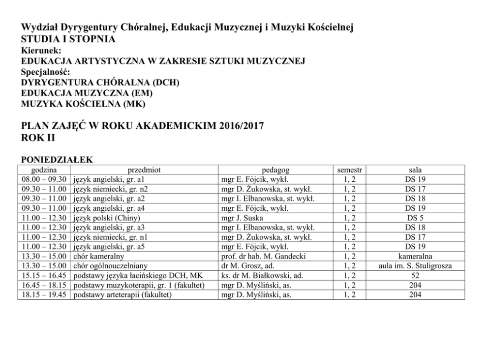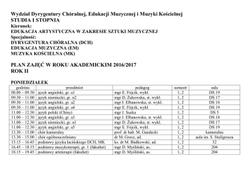 Wydział Dyrygentury Chóralnej, Edukacji Muzycznej i Muzyki Kościelnej STUDIA I STOPNIA Kierunek: EDUKACJA ARTYSTYCZNA W ZAKRESIE SZTUKI MUZYCZNEJ Specjalność: DYRYGENTURA CHÓRALNA (DCH) EDUKACJA MUZYCZNA (EM) MUZYKA KOŚCIELNA (MK) PLAN ZAJĘĆ W ROKU AKADEMICKIM 2016/2017 ROK II PONIEDZIAŁEK godzina 08.00 – 09.30 09.30 – 11.00 09.30 – 11.00 09.30 – 11.00 11.00 – 12.30 11.00 – 12.30 11.00 – 12.30 11.00 – 12.30 13.30 – 15.00 13.30 – 15.00 15.15 – 16.45 16.45 – 18.15 18.15 – 19.45 przedmiot język angielski, gr. a1 język niemiecki, gr. n2 język angielski, gr. a2 język angielski, gr. a4 język polski (Chiny) język angielski, gr. a3 język niemiecki, gr. n1 język angielski, gr. a5 chór kameralny chór ogólnouczelniany podstawy języka łacińskiego DCH, MK podstawy muzykoterapii, gr. 1 (fakultet) podstawy arteterapii (fakultet) pedagog mgr E. Fójcik, wykł. mgr D. Żukowska, st. wykł. mgr I. Elbanowska, st. wykł. mgr E. Fójcik, wykł. mgr J. Suska mgr I. Elbanowska, st. wykł. mgr D. Żukowska, st. wykł. mgr E. Fójcik, wykł. prof. dr hab. M. Gandecki dr M. Grosz, ad. ks. dr M. Białkowski, ad. mgr D. Myśliński, as. mgr D. Myśliński, as. semestr 1, 2 1, 2 1, 2 1, 2 1, 2 1, 2 1, 2 1, 2 1, 2 1, 2 1, 2 1, 2 1, 2 sala DS 19 DS 17 DS 18 DS 19 DS 5 DS 18 DS 17 DS 19 kameralna aula im. S. Stuligrosza 52 204 204 WTOREK godzina 08.00 – 09.30 09.30 – 11.00 11.00 – 12.30 09.30 – 11.00 11.00 – 12.30 13.00 – 14.30 15.15 – 16.00 16.45 – 17.30 17.30 – 19.00 przedmiot analiza form i stylów muz. DCH, MK kształcenie słuchu gr. 1 kształcenie słuchu gr. 2 czytanie nut głosem gr. 1 czytanie nut głosem gr. 2 liturgika MK* propedeutyka improwizacji organowej MK instrumenty szkolne (fakultet) podstawy muzykoterapii, gr. 2 (fakultet) pedagog mgr A. Chwastek, as. dr A. Kędzierska, ad. dr A. Kędzierska, ad. dr A. Kędzierska, ad. dr A. Kędzierska, ad. ks. prof. dr hab. A. Filaber dr W. Gawiejnowicz, ad. mgr M. Andrys, as. mgr D. Myśliński, as. semestr 1, 2 1 1 2 2 1, 2 1, 2 1, 2 1, 2 sala 204 396 396 396 396 52 184 204 204 pedagog ks. prof. dr hab. A. Filaber ks. dr M. Białkowski, ad. semestr 1, 2 1, 2 sala 52 kameralna mgr M. Andrys, as. 1, 2 204 mgr M. Andrys, as. 1, 2 204 semestr 1 1 2 1, 2 1, 2 sala ŚRODA godzina przedmiot 08.00 – 09.30 prawodawstwo muzyki liturgicznej MK* 14.15 – 15.45 zespół chorałowy z metodyką MK projekty twórcze w edukacji muzycznej 16.00 – 17.30 grupa 1 (fakultet) projekty twórcze w edukacji muzycznej 17.30 – 19.00 grupa 2 (fakultet) CZWARTEK godzina 08.00 – 09.30 09.30 – 11.00 10.15 – 11.00 13.30 – 15.00 15.00 – 16.30 przedmiot organoznawstwo MK metodyka edukacji muzycznej EM ćwiczenia z metodyki edukacji muz. EM chór kameralny chór ogólnouczelniany pedagog dr W. Gawiejnowicz, ad. dr T. Śnitko, doc. dr T. Śnitko, doc. prof. dr hab. M. Gandecki dr M. Grosz, ad. 204 204 aula im. S. Stuligrosza aula im. S. Stuligrosza PIĄTEK godzina przedmiot pedagog 11.45 – 13.15 pedagogika EM (I i II etap edukacyjny) dr T. Śnitko, doc. 13.30 – 15.00 zespół dla praktyk studenckich z metodyką dr M. Majchrzak, ad. 15.15 – 16.45 historia muzyki mgr A. Chwastek, as. *zajęcia odbywają się co dwa tygodnie semestr 1, 2 1, 2 1, 2 sala 204 aula im. S. Stuligrosza 52