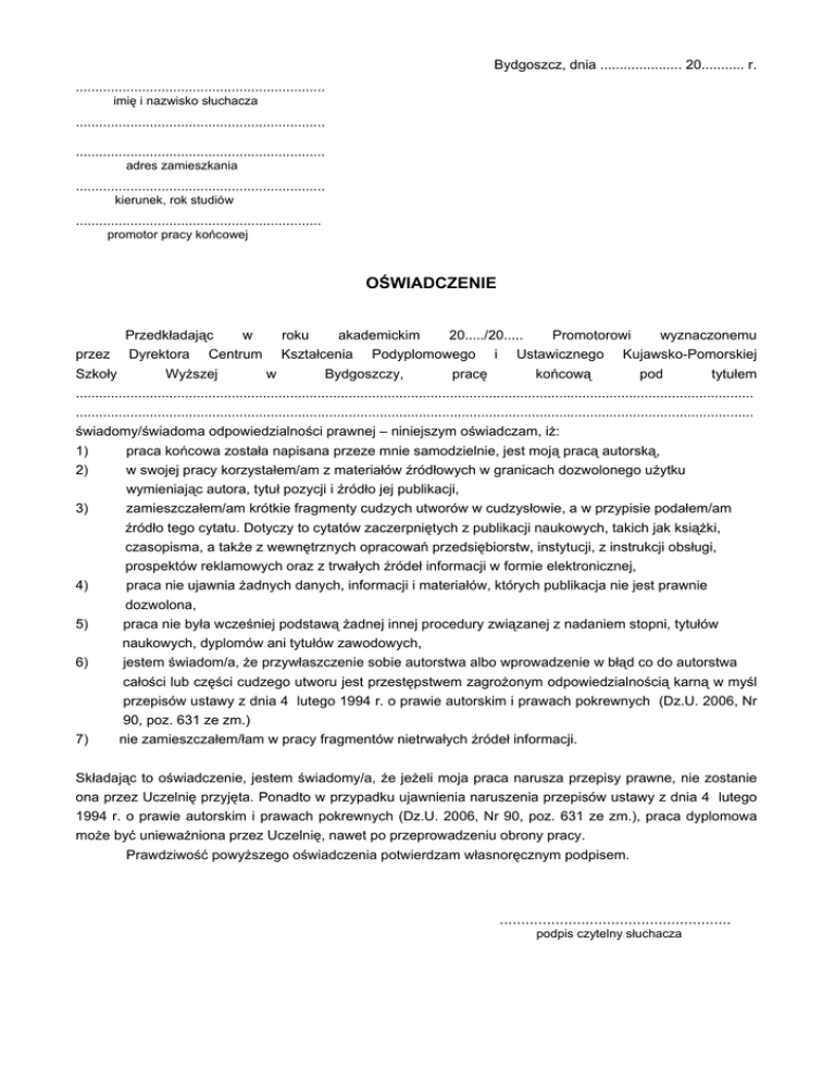 Bydgoszcz, dnia ..................... 20........... r. ................................................................ imię i nazwisko słuchacza ................................................................ ................................................................ adres zamieszkania ................................................................ kierunek, rok studiów ............................................................... promotor pracy końcowej OŚWIADCZENIE Przedkładając w roku akademickim 20...../20..... Promotorowi wyznaczonemu przez Dyrektora Centrum Kształcenia Podyplomowego i Ustawicznego Kujawsko-Pomorskiej Szkoły Wyższej w Bydgoszczy, pracę końcową pod tytułem .............................................................................................................................................................................. .............................................................................................................................................................................. świadomy/świadoma odpowiedzialności prawnej – niniejszym oświadczam, iż: 1) praca końcowa została napisana przeze mnie samodzielnie, jest moją pracą autorską, 2) w swojej pracy korzystałem/am z materiałów źródłowych w granicach dozwolonego użytku wymieniając autora, tytuł pozycji i źródło jej publikacji, 3) zamieszczałem/am krótkie fragmenty cudzych utworów w cudzysłowie, a w przypisie podałem/am źródło tego cytatu. Dotyczy to cytatów zaczerpniętych z publikacji naukowych, takich jak książki, czasopisma, a także z wewnętrznych opracowań przedsiębiorstw, instytucji, z instrukcji obsługi, prospektów reklamowych oraz z trwałych źródeł informacji w formie elektronicznej, 4) praca nie ujawnia żadnych danych, informacji i materiałów, których publikacja nie jest prawnie dozwolona, 5) praca nie była wcześniej podstawą żadnej innej procedury związanej z nadaniem stopni, tytułów naukowych, dyplomów ani tytułów zawodowych, 6) jestem świadom/a, że przywłaszczenie sobie autorstwa albo wprowadzenie w błąd co do autorstwa całości lub części cudzego utworu jest przestępstwem zagrożonym odpowiedzialnością karną w myśl przepisów ustawy z dnia 4 lutego 1994 r. o prawie autorskim i prawach pokrewnych (Dz.U. 2006, Nr 90, poz. 631 ze zm.) 7) nie zamieszczałem/łam w pracy fragmentów nietrwałych źródeł informacji. Składając to oświadczenie, jestem świadomy/a, że jeżeli moja praca narusza przepisy prawne, nie zostanie ona przez Uczelnię przyjęta. Ponadto w przypadku ujawnienia naruszenia przepisów ustawy z dnia 4 lutego 1994 r. o prawie autorskim i prawach pokrewnych (Dz.U. 2006, Nr 90, poz. 631 ze zm.), praca dyplomowa może być unieważniona przez Uczelnię, nawet po przeprowadzeniu obrony pracy. Prawdziwość powyższego oświadczenia potwierdzam własnoręcznym podpisem. ...................................................... podpis czytelny słuchacza