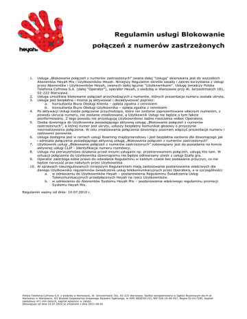Regulamin usługi Blokowanie połączeń z numerów zastrzeżonych 1. Usługa „Blokowanie połączeń z numerów zastrzeżonych” zwana dalej "Usługą" skierowana jest do wszystkich Abonentów Heyah Mix i Użytkowników Heyah. Niniejszy Regulamin określa zasady i zakres korzystania z Usługi przez Abonentów i Użytkowników Heyah, zwanych dalej łącznie "Użytkownikami". Usługę świadczy Polska Telefonia Cyfrowa S.A. (dalej "Operator"), operator Heyah, z siedzibą w Warszawie przy Al. Jerozolimskich 181, 02-222 Warszawa. 2. Usługa umożliwia blokowanie połączeń przychodzących z numerów, których prezentacja numeru została ukryta. 3. Usługa jest bezpłatna i można ją aktywować i dezaktywować poprzez: a. Konsultanta Biura Obsługi Klienta – opłata zgodna z cennikiem b. Konsultanta Biura Obsługi Użytkownika – opłata zgodna z cennikiem 4. Po aktywacji Usługi każde połączenie przychodzące, które nie zostanie zaprezentowane własnym numerem, z powodu ukrycia numeru, nie zostanie zrealizowane, a Użytkownik Usługi nie będzie o tym fakcie poinformowany. Z tego powodu nie przysługują Użytkownikowi żadne roszczenia wobec Operatora. 5. Osoba dzwoniąca do Użytkownika posiadającego aktywną usługę „Blokowanie połączeń z numerów zastrzeżonych”, a której numer jest ukryty, usłyszy bezpłatny komunikat głosowy o przyczynie niezrealizowania połączenia. W celu zrealizowania połączenia dzwoniący powinien włączyć prezentacje numeru i zadzwonić ponownie. 6. Usługa dostępna jest w ramach usługi Roaming międzynarodowy i jest bezpłatna zarówno dla dzwoniącego jak i adresata połączenia posiadającego aktywną usługę „Blokowania połączeń z numerów zastrzeżonych”. 7. Użytkownik usługi „Blokowanie połączeń z numerów zastrzeżonych” zobowiązany jest do posiadania na koncie aktywnej usługi CLIP - Identyfikacja numeru rozmówcy. 8. Usługa ma pierwszeństwo działania przed innymi usługami np. przekierowaniem połączeń, usługą Kto tam. W sytuacji połączenia do Użytkownika dzwoniącemu nie będzie odtwarzany utwór z usługi Szafa gra. 9. Operator zastrzega sobie prawo do odwołania Regulaminu w każdym czasie bez podawania przyczyn, co nie będzie naruszać praw nabytych przez Użytkownika. 10. W sprawach nieuregulowanych niniejszym Regulaminem mają zastosowanie postanowienia właściwych dla danego Użytkownika regulaminów świadczenia usług telekomunikacyjnych przez Operatora, a w szczególności: a. w odniesieniu do Użytkowników Heyah – postanowienia Regulaminu Świadczenia Usług Telekomunikacyjnych przedpłaconych Heyah na rzecz Użytkowników. b. w odniesieniu do Abonentów Systemu Heyah Mix – postanowienia właściwego regulaminu promocji Systemu Heyah Mix. Regulamin ważny od dnia: 14.07.2010 r. Polska Telefonia Cyfrowa S.A. z siedzibą w Warszawie, Al. Jerozolimskie 181, 02-222 Warszawa. Spółka zarejestrowana w Sądzie Rejonowym dla m.st. Warszawy w Warszawie, XII Wydział Gospodarczy Krajowego Rejestru Sądowego, nr KRS 0000391193, NIP 526-10-40-567, Regon 011417295, Kapitał zakładowy 471 mln złotych, kapitał wpłacony w całości. Obowiązuje od dnia 14.07.2010 ze zmianami z dnia 2011-08-01