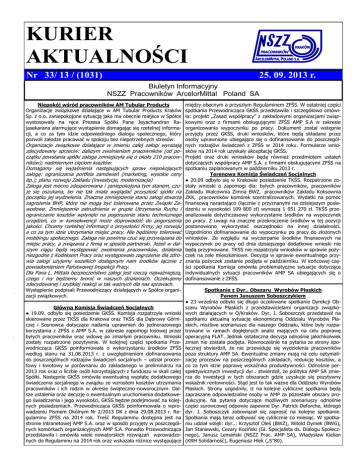 KURIER AKTUALNOŚCI Nr 33/ 13 / (1031) 25. 09. 2013 r. Biuletyn Informacyjny NSZZ Pracowników ArcelorMittal Poland SA Niepokój wśród pracowników AM Tubular Products Organizacje związkowe działające w AM Tubular Products Kraków Sp. z o.o. zaniepokojone sytuacją jaka ma obecnie miejsce w Spółce wystosowały na ręce Prezesa Spółki Pana Jeyachandran Rajasekarana alarmujące wystąpienie domagając się rzetelnej informacji, a co za tym idzie odpowiedniego dialogu społecznego, który pozwoli załodze pracować w spokoju bez niepotrzebnych stresów: między obecnym a przyszłym Regulaminem ZFŚS. W ostatniej części spotkania Przewodnicząca GKŚS przedstawiła i szczegółowo omówiła: projekt „Zasad współpracy” z zakładowymi organizacjami związkowymi oraz z firmami obsługującymi ZFŚS AMP S.A w zakresie organizowania wypoczynku po pracy. Dokument został wstępnie przyjęty przez GKŚS, druki wniosków, które będą składane przez osoby uprawnione ubiegające się o dofinansowanie do poszczególnych rodzajów świadczeń z ZFŚS w 2014 roku. Formularze wniosków na 2014 rok uzyskały akceptację GKŚS. Projekt oraz druki wniosków będą również przedmiotem ustaleń dotyczących współpracy AMP S.A. z firmami obsługującymi ZFŚS na spotkaniu zaplanowanym w październiku 2013 r. Terenowa Komisja Świadczeń Socjalnych ● 20.09 odbyło się w Krakowie posiedzenie TKŚS. Rozpatrzone zostały wnioski o zapomogi dla: byłych pracowników, pracowników Zakładu Walcownia Zimna BWZ, pracowników Zakładu Koksownia ZKK, pracowników komórek scentralizowanych. Wydatki na pomoc finansową narastająco (łącznie z przyznanymi na dzisiejszym posiedzeniu w wysokości 109 800 zł) wynoszą 1 051 270 zł. TKŚS przeanalizowała dotychczasowe wykorzystanie środków na wypoczynek po pracy. Z uwagi na znaczne przekroczenie środków w tej pozycji postanowiono wykorzystać oszczędności na innej działalności. Uzgodniono dofinansowanie do wypoczynku po pracy do złożonych wniosków. Ze względu na wyczerpanie środków finansowych na wypoczynek po pracy od dnia dzisiejszego dodatkowe wnioski nie będą przyjmowane. TKSS nie rozpatrzyła wniosków w sprawie pożyczek na cele mieszkaniowe. Decyzja w sprawie ewentualnego przyznania pożyczek zostanie podjęta w październiku. W końcowej części spotkania Komisja omówiła problematyczne sytuacje dotyczące indywidualnych sytuacji pracowników AMP SA ubiegających się o dofinansowanie z ZFŚS. Wystąpienie podpisali Przewodniczący działających w Spółce organizacji związkowych. Spotkanie z Dyr.. Obszaru Wyrobów Płaskich Panem Januszem Soboszczykiem ● 23 września odbyło się długo oczekiwane spotkanie Dyrekcji Obszaru Wyrobów Płaskich z przedstawicielami organizacji związkowych działających w O/Kraków. Dyr. J. Soboszczyk przedstawił na spotkaniu aktualną sytuację ekonomiczną Oddziału Wyrobów Płaskich, możliwe scenariusze dla naszego Oddziału, które były rozpatrywane w ramach dogłębnych analiz mających na celu poprawę operacyjną FLAT. Jednak ostateczna decyzja odnośnie jakichkolwiek zmian nie została podjęta. Równocześnie na pytania ze strony społecznej stwierdził, że nie przewiduje się wydzielenia pracowników poza struktury AMP SA. Ewentualne zmiany mają na celu optymalizację procesów na poszczególnych zakładach, redukcję kosztów, a co za tym idzie poprawę wskaźnika produktywności. Odnośnie perspektywicznych inwestycji dyr.. stwierdził, że polityka AMP SA zmierza do inwestycji w tych obszarach gdzie uzyskuje się pozytywny wskaźnik rentowności. Stąd jest to tak ważne dla Oddziału Wyrobów Płaskich. Strony uzgodniły, iż na kolejne cykliczne spotkania będą zapraszane odpowiedzialne osoby w AMP za pozostałe obszary produkcyjne. Na pytania dotyczące możliwych scenariuszy odnośnie części surowcowej odpowie zapewne Dyr. Patrick Deforche, którego dyr. J. Soboszczyk zobowiązał się zaprosić na kolejne spotkanie. Spotkania mają teraz odbywać się cyklicznie co miesiąc. W spotkaniu udział wzięli: dyr..: Krzysztof Oleś (BWZ), Witold Dymek (BWG), Jan Staniewski, Cezary Koziński (Gł. Specjalista ds. Dialogu Społecznego), Janusz Lemański (NSZZ Prac. AMP SA), Władysław Kielian (KRH Solidarność), Eugeniusz Hlek („S”80). Organizacje związkowe działające w imieniu całej załogi wyrażają zdecydowany sprzeciw: dalszym zwolnieniom pracowników (od początku powstania spółki załoga zmniejszyła się o około 210 pracowników); nadmiernym cięciom kosztów. Domagamy się wyjaśnienia następujących spraw niepokojących załogę: ograniczania portfela zamówień (marketing, wysokie ceny itp.); planu rozwoju Zakładu (inwestycje, modernizacja) Załoga jest mocno zdesperowana i zaniepokojona tym stanem, czuje sie oszukana, bo nie tak miała wyglądać przyszłość spółki na początku jej wydzielenia. Znaczne zmniejszenie stanu załogi stwarza zagrożenia BHP, które nie mogą być tolerowane przez Związki Zawodowe. Zmniejszenie zatrudnienia w grupie Utrzymania Ruchu i ograniczanie kosztów wpłynęło na pogorszenie stanu technicznego urządzeń, co w konsekwencji może doprowadzić do pogorszenia jakości. Chcemy rzetelnej informacji o przyszłości firmy, jej rozwoju a co za tym idzie utrzymania miejsc pracy. Nie będziemy tolerować mobbingu społecznego. Załoga nie powinna czuć się przywiązana do miejsc pracy, a związania z firmą w sposób partnerski. Jeżeli w dalszym ciągu będą występować zwolnienia pracowników, działania niezgodne z Kodeksem Pracy oraz występowało zagrożenie dla zdrowia załogi użyjemy wszelkich dostępnym nam środków łącznie z powiadomieniem Państwowej Inspekcji Pracy. Dla Pana L. Mittala bezpieczeństwo załogi jest rzeczą najważniejszą, czego i my będziemy bronić w naszych działaniach. Oczekujemy zdecydowanej i szybkiej reakcji w tak ważnych dla nas sprawach. Główna Komisja Świadcz