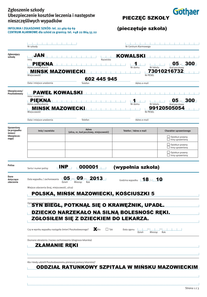 Zgłoszenie szkody Ubezpieczenie kosztów leczenia i następstw nieszczęśliwych wypadków PIECZĘĆ SZKOŁY (pieczętuje szkoła) INFOLINIA I ZGŁASZANIE SZKÓD: tel. 22 469 69 69 CENTRUM ALARMOWE dla szkód za granicą: tel. +48 22 864 55 22 Nr szkody Zgłaszający szkodę Imię Nr Centrum Alarmowego JAN Nazwisko PIĘKNA KOWALSKI 1 Adres zamieszkania Nr domu MIŃSK MAZOWIECKI Miejscowość Ubezpieczony/ Poszkodowany Telefon 300 73010216732 Adres e-mail PAWEŁ KOWALSKI Imię i nazwisko PIĘKNA 1 Adres zamieszkania Nr domu MIŃSK MAZOWECKI Data i miejsce urodzenia Kod pocztowy 300 99120505054 Nr PESEL Telefon Adres e-mail Adres (ulica, nr, kod pocztowy, miejscowość) Imię i nazwisko 05 Nr lokalu Miejscowość Uprawniony (w przypadku śmierci Ubezpieczonego) Kod pocztowy Nr PESEL 602 445 945 Data i miejsce urodzenia 05 Nr lokalu Telefon / Adres e-mail Charakter uprawnionego Opiekun prawny Inny uprawniony Opiekun prawny Inny uprawniony Opiekun prawny Inny uprawniony Polisa Dane dotyczące zdarzenia Seria i numer polisy INP Data wypadku / zachorowania 05 Dzień 000001 09 Miesiąc (wypełnia szkoła) 2013 Godzina wypadku Rok 18 10 Miejsce zdarzenia (kraj, miejscowość, ulica) POLSKA, MIŃSK MAZOWIECKI, KOŚCIUSZKI 5 SYN BIEGŁ, POTKNĄŁ SIĘ O KRAWĘŻNIK, UPADŁ. Opis okoliczności zdarzenia DZIECKO NARZEKAŁO NA SILNĄ BOLESNOŚĆ RĘKI. ZGŁOSIŁEM SIĘ Z DZIECKIEM DO LEKARZA. Czy w wyniku wypadku nastąpiła śmierć Poszkodowanego? XNie Tak Data zgonu Dzień Miesiąc Rok Doznane obrażenia /nazwa zachorowania (diagnoza lekarska) ZŁAMANIE RĘKI Kto i kiedy udzielił Poszkodowanemu pierwszej pomocy lekarskiej? ODDZIAŁ RATUNKOWY SZPITALA W MIŃSKU MAZOWIECKIM Strona 1 z 3 Nazwy i adresy placówek medycznych w których Ubezpieczony leczył się w związku ze zgłaszanym obecnie wypadkiem / zachorowaniem. (ewentualnie wymienić) Nazwy i adresy placówek medycznych, w których Ubezpieczony leczył się przed wypadkiem / zachorowaniem, którego dotyczy zgłoszenie. Czy na miejscu zdarzenia obecna była (proszę o wpisanie adresu jednostki obecnej na miejscu zdarzenia)? Policja Straż miejska Straż pożarna Pogotowie ratunkowe Inne (jaka instytucja?) Adres (ewentualnie wskazać) Adres Adres Adres Adres Czy zdarzenie związane było z: wypadkiem komunikacyjnym innymi przyczynami wykonywaniem pracy zarobkowej wyczynowym uprawianiem sportu (ewentualnie wskazać) Czy Poszkodowany w chwili wypadku znajdował się pod wpływem alkoholu, narkotyków lub innych środków odurzających? Świadkowie zdarzenia Imię Nr domu Miejscowość Telefon Kod pocztowy Adres e-mail Nazwisko Nr domu Adres zamieszkania Miejscowość Koszty leczenia Nr lokalu Nr PESEL Imię Nr dowodu tożsamości Tak Nazwisko Adres zamieszkania Nr dowodu tożsamości XNie Nr lokalu Kod pocztowy Nr PESEL Telefon W kwocie zostały opłacone osobiście przez Ubezpieczonego W kwocie zostały opłacone przez Centrum Alarmowe W kwocie zostały opłacone przez znajomego lub członka rodziny W kwocie pozostają do zapłaty na rzecz wystawcy rachunku Adres e-mail (ewentualnie wymienić) Strona 2 z 3 Oprócz roszczeń dotyczących kosztów leczenia i następstw nieszczęśliwych wypadków dodatkowo zgłaszam roszczenia z: Zwrot opłaconych kosztów / wypłaty świadczenia W jaki sposób Gothaer TU S.A. ma dokonać zwrotu opłaconych kosztów lub wypłaty świadczenia? przelewem bankowym na konto (polecamy przelew bankowy) Imię Nazwisko na konto nr Ulica Nr domu Miejscowość Nr lokalu Kod pocztowy przekazem pocztowym na adres Imię Nazwisko Ulica Nr domu Miejscowość Nr lokalu Kod pocztowy odbiór gotówki w banku Imię Nazwisko Nr PESEL Nr dowodu tożsamości Czy w związku z tym zdarzeniem przysługuje Panu(i) świadczenie z tytułu innej umowy ubezpieczenia? (jakiej?) Załączona dokumentacja lekarska Oświadczenie Ubezpieczonego Oświadczam, ze powyższe informacje podałem/am zgodnie z prawda i według najlepszej wiedzy. Każde niezgodne z prawda oświadczenie lub inne działania mające na celu wprowadzenie w błąd Gothaer TU S.A. może spowodować utratę prawa do uzyskania świadczenia. Potwierdzam zgodność danych w zgłoszeniu z polisą Zwalniam leczących mnie lekarzy z obowiązku zachowania tajemnicy lekarskiej i wyrażam zgodę na udostępnianie Gothaer TU S.A. informacji i dokumentacji medycznej z mojego leczenia przez placówki medyczne / lekarzy zgodnie z art. 22 ust. 3 z dnia 22 maja 2003r. o działalności ubezpieczeniowej. Nr agenta / pośrednika Data i czytelny podpis Uprawnionego Spółka GOTHAER TOWARZYSTWO UBEZPIECZEŃ S.A. ul. Wołoska 22A, 02-675 Warszawa; tel.: 22 469 69 69, fax: 22 469 69 70; e-mail: [email protected], www.gothaer.pl 2013.09.15 JAN KOWALSKI Data i czytelny podpis Ubezpieczonego / Opiekuna prawnego Sąd Rejonowy dla m.st. Warszawy Wydział XIII Gospodarczy Krajowego Rejestru Sądowego, KRS 00000 33882; Kapitał zakładowy: 76 344 964 zł wpłacony w całości; NIP: 524-030-23-93; REGON: 010594552 Strona 3 z 3