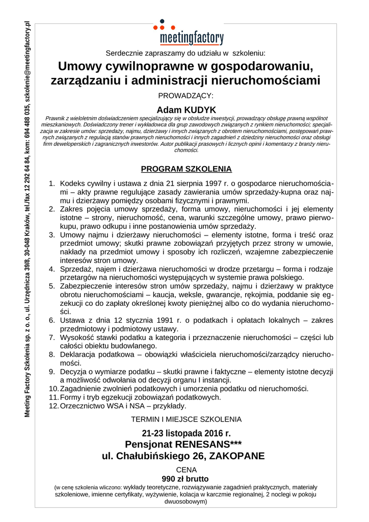 Meeting Factory Szkolenia sp. z o. o., ul. Urzędnicza 39/8, 30-048 Kraków, tel./fax 12 292 64 84, kom: 694 488 035, [email protected] Serdecznie zapraszamy do udziału w szkoleniu: Umowy cywilnoprawne w gospodarowaniu, zarządzaniu i administracji nieruchomościami PROWADZĄCY: Adam KUDYK Prawnik z wieloletnim doświadczeniem specjalizujący się w obsłudze inwestycji, prowadzący obsługę prawną wspólnot mieszkaniowych. Doświadczony trener i wykładowca dla grup zawodowych związanych z rynkiem nieruchomości; specjalizacja w zakresie umów: sprzedaży, najmu, dzierżawy i innych związanych z obrotem nieruchomościami, postępowań prawnych związanych z regulacją stanów prawnych nieruchomości i innych zagadnień z dziedziny nieruchomości oraz obsługi firm deweloperskich i zagranicznych inwestorów. Autor publikacji prasowych i licznych opinii i komentarzy z branży nieruchomości. PROGRAM SZKOLENIA 1. Kodeks cywilny i ustawa z dnia 21 sierpnia 1997 r. o gospodarce nieruchomościami – akty prawne regulujące zasady zawierania umów sprzedaży-kupna oraz najmu i dzierżawy pomiędzy osobami fizycznymi i prawnymi. 2. Zakres pojęcia umowy sprzedaży, forma umowy, nieruchomości i jej elementy istotne – strony, nieruchomość, cena, warunki szczególne umowy, prawo pierwokupu, prawo odkupu i inne postanowienia umów sprzedaży. 3. Umowy najmu i dzierżawy nieruchomości – elementy istotne, forma i treść oraz przedmiot umowy; skutki prawne zobowiązań przyjętych przez strony w umowie, nakłady na przedmiot umowy i sposoby ich rozliczeń, wzajemne zabezpieczenie interesów stron umowy. 4. Sprzedaż, najem i dzierżawa nieruchomości w drodze przetargu – forma i rodzaje przetargów na nieruchomości występujących w systemie prawa polskiego. 5. Zabezpieczenie interesów stron umów sprzedaży, najmu i dzierżawy w praktyce obrotu nieruchomościami – kaucja, weksle, gwarancje, rękojmia, poddanie się egzekucji co do zapłaty określonej kwoty pieniężnej albo co do wydania nieruchomości. 6. Ustawa z dnia 12 stycznia 1991 r. o podatkach i opłatach lokalnych – zakres przedmiotowy i podmiotowy ustawy. 7. Wysokość stawki podatku a kategoria i przeznaczenie nieruchomości – części lub całości obiektu budowlanego. 8. Deklaracja podatkowa – obowiązki właściciela nieruchomości/zarządcy nieruchomości. 9. Decyzja o wymiarze podatku – skutki prawne i faktyczne – elementy istotne decyzji a możliwość odwołania od decyzji organu I instancji. 10. Zagadnienie zwolnień podatkowych i umorzenia podatku od nieruchomości. 11. Formy i tryb egzekucji zobowiązań podatkowych. 12. Orzecznictwo WSA i NSA – przykłady. TERMIN I MIEJSCE SZKOLENIA 21-23 listopada 2016 r. Pensjonat RENESANS*** ul. Chałubińskiego 26, ZAKOPANE CENA 990 zł brutto (w cenę szkolenia wliczono: wykłady teoretyczne, rozwiązywanie zagadnień praktycznych, materiały szkoleniowe, imienne certyfikaty, wyżywienie, kolacja w karczmie regionalnej, 2 noclegi w pokoju dwuosobowym) Meeting Factory Szkolenia sp. z o. o., ul. Urzędnicza 39/8, 30-048 Kraków, tel./fax 12 292 64 84, kom: 694 488 035, [email protected] Umowy cywilnoprawne w gospodarowaniu, zarządzaniu i administracji nieruchomościami: Zakopane 21-23.11.2016 r Nazwa firmy (dane jak do faktury):.................................................................................................................. Adres:................................................................................................................................................................. NIP:.....................................................................tel.:........................................................................................... fax.:.....................................................................e-mail:..................................................................................... Lp. Imię i nazwisko STANOWISKO Tel. kontaktowy 1. 2. 3 miejsce: Pensjonat RENESANS***, ul. Chałubińskiego 26, ZAKOPANE termin: 21 – 23 LISTOPADA 2016 kwota: □ 990 zł brutto za osobę x liczba osób ..... = .............. zł (wybierz opcję udziału) (wliczono dwa noclegi w pokoju dwuosobowym, materiały szkoleniowe, imienne certyfikaty, wyżywienie, indywidualne konsultacje z ekspertem) □ dopłata do pokoju jednoosobowego – 200 zł brutto (osoba) suma: należność: (osoba zgłaszająca należność zobowiązuje się przekazać na konto Meeting Factory Szkolenia sp. z o. o.:) ................. PLN; słownie ............................................................................ Bank Pekao 33 1240 4533 1111 0010 6838 8299 w tytule przelewu proszę wpisać: Z2111 WARUNKI UCZESTNICTWA: ■ przesłanie faksem lub e-mailem wypełnionej karty zgłoszenia ■ przesłanie zgłoszenia udziału w szkoleniu stanowi zgodę na wystawienie faktury i zobowiązanie się do uiszczenia opłaty za szkolenie ■ wpłata na konto Meeting Factory Szkolenia sp. z o. o. należności za uczestnictwo przed szkoleniem ■ brak wpłaty nie jest jednoznaczny z rezygnacją z udziału ■ rezygnacja możliwa jest najpóźniej na 7 dni przed seminarium wyłącznie w formie pisemnej ■ Szkolenie może nie dojść do skutku w ww. terminie, jeśli nie zgłosi się odpowiednia ilość uczestników ■ Zapoznaliśmy się i akceptujemy warunki płatności oraz uczestnictwa w szkoleniu organizowanym przez Meeting Factory Szkolenia sp. z o. o. ■ wyrażamy zgodę na przetwarzanie danych osobowych do celów organizacyjnych i marketingowych przez firmę Meeting Factory Szkolenia sp. z o. o. ........................................... (pieczątka firmowa osoby zgłaszającej) S ........................................... (data i czytelny podpis) WIĘCEJ INFORMACJI POD NR TEL. ORGANIZATORA: 12 292 64 84 e-mail: [email protected], tel./fax: 12 292 64 84, tel. kom: 694 488 035