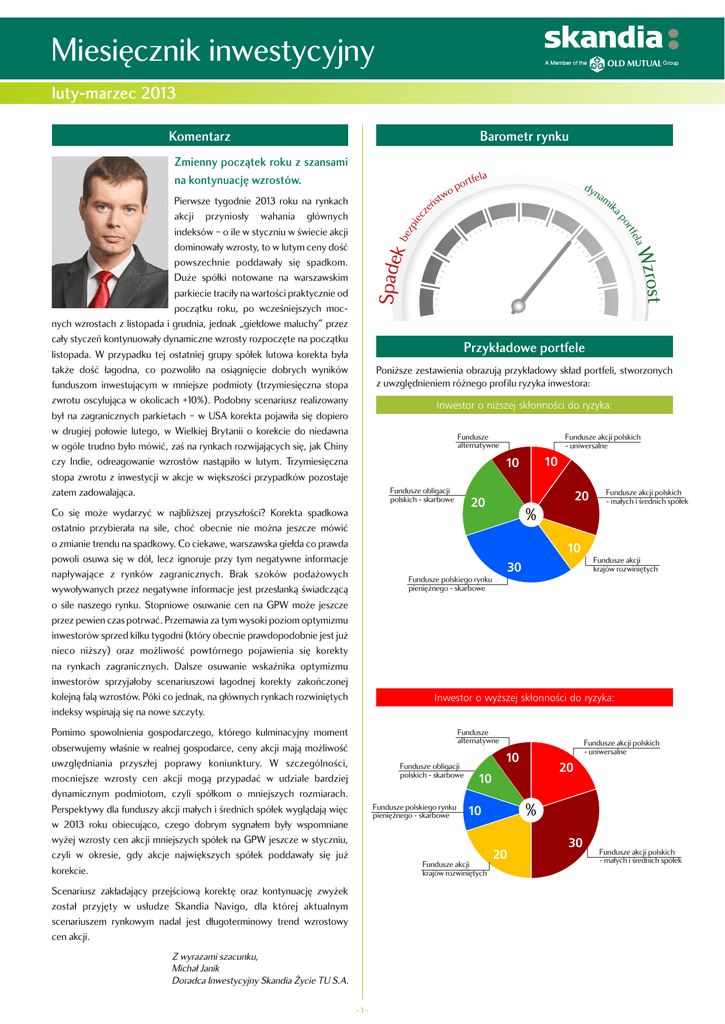 Miesięcznik inwestycyjny luty-marzec 2013 Komentarz Barometr rynku Zmienny początek roku z szansami na kontynuację wzrostów. dyn am ik st Wzro Spadek fela o rt bez pie cz eń ap Pierwsze tygodnie 2013 roku na rynkach akcji przyniosły wahania głównych indeksów – o ile w styczniu w świecie akcji dominowały wzrosty, to w lutym ceny dość powszechnie poddawały się spadkom. Duże spółki notowane na warszawskim parkiecie traciły na wartości praktycznie od początku roku, po wcześniejszych mocnych wzrostach z listopada i grudnia, jednak „giełdowe maluchy” przez cały styczeń kontynuowały dynamiczne wzrosty rozpoczęte na początku listopada. W przypadku tej ostatniej grupy spółek lutowa korekta była także dość łagodna, co pozwoliło na osiągnięcie dobrych wyników funduszom inwestującym w mniejsze podmioty (trzymiesięczna stopa zwrotu oscylująca w okolicach +10%). Podobny scenariusz realizowany był na zagranicznych parkietach – w USA korekta pojawiła się dopiero w drugiej połowie lutego, w Wielkiej Brytanii o korekcie do niedawna w ogóle trudno było mówić, zaś na rynkach rozwijających się, jak Chiny czy Indie, odreagowanie wzrostów nastąpiło w lutym. Trzymiesięczna stopa zwrotu z inwestycji w akcje w większości przypadków pozostaje zatem zadowalająca. ela ortf p o stw 1 Przykładowe portfele Poniższe zestawienia obrazują przykładowy skład portfeli, stworzonych z uwzględnieniem różnego profilu ryzyka inwestora: Inwestor o ni˝szej skłonnoÊci do ryzyka: Fundusze alternatywne Fundusze akcji polskich - uniwersalne 10 10 Fundusze obligacji polskich - skarbowe Co się może wydarzyć w najbliższej przyszłości? Korekta spadkowa ostatnio przybierała na sile, choć obecnie nie można jeszcze mówić o zmianie trendu na spadkowy. Co ciekawe, warszawska giełda co prawda powoli osuwa się w dół, lecz ignoruje przy tym negatywne informacje napływające z rynków zagranicznych. Brak szoków podażowych wywoływanych przez negatywne informacje jest przesłanką świadczącą o sile naszego rynku. Stopniowe osuwanie cen na GPW może jeszcze przez pewien czas potrwać. Przemawia za tym wysoki poziom optymizmu inwestorów sprzed kilku tygodni (który obecnie prawdopodobnie jest już nieco niższy) oraz możliwość powtórnego pojawienia się korekty na rynkach zagranicznych. Dalsze osuwanie wskaźnika optymizmu inwestorów sprzyjałoby scenariuszowi łagodnej korekty zakończonej kolejną falą wzrostów. Póki co jednak, na głównych rynkach rozwiniętych indeksy wspinają się na nowe szczyty. 20 20 Fundusze akcji polskich - małych i średnich spółek % 10 Fundusze akcji krajów rozwiniętych 30 Fundusze polskiego rynku pieniężnego - skarbowe Inwestor o wy˝szej skłonnoÊci do ryzyka: Pomimo spowolnienia gospodarczego, którego kulminacyjny moment obserwujemy właśnie w realnej gospodarce, ceny akcji mają możliwość uwzględniania przyszłej poprawy koniunktury. W szczególności, mocniejsze wzrosty cen akcji mogą przypadać w udziale bardziej dynamicznym podmiotom, czyli spółkom o mniejszych rozmiarach. Perspektywy dla funduszy akcji małych i średnich spółek wyglądają więc w 2013 roku obiecująco, czego dobrym sygnałem były wspomniane wyżej wzrosty cen akcji mniejszych spółek na GPW jeszcze w styczniu, czyli w okresie, gdy akcje największych spółek poddawały się już korekcie. Fundusze alternatywne Fundusze obligacji polskich - skarbowe Fundusze polskiego rynku pieniężnego - skarbowe % 10 Fundusze akcji krajów rozwiniętych Z wyrazami szacunku, Michał Janik Doradca Inwestycyjny Skandia Życie TU S.A. -1- 20 10 20 Scenariusz zakładający przejściową korektę oraz kontynuację zwyżek został przyjęty w usłudze Skandia Navigo, dla której aktualnym scenariuszem rynkowym nadal jest długoterminowy trend wzrostowy cen akcji. Fundusze akcji polskich - uniwersalne 10 30 Fundusze akcji polskich - małych i średnich spółek Miesięcznik inwestycyjny luty-marzec 2013 Stopa zwrotu Wyniki funduszy Ubezpieczeniowy Fundusz Kapitałowy Skandia 28.02.2013 (2m) Kod Fundusze dost´pne w aktualnej ofercie Skandii w lutym* Stopa zwrotu Ubezpieczeniowy Fundusz Kapitałowy Skandia 28.02.2013 (2m) Kod Waluta Waluta wewn. w PLN 3m 12 m w PLN w PLN I, Fundusze akcji krajów rozwijajàcych si´ Fundusze akcji polskich – du˝ych spółek Investor Akcji Du˝ych Spółek DWS3 Skarbiec FIO Subfundusz Akcji Skarbiec-Akcja SKAR3 Fundusze akcji polskich - małych i Êrednich spółek Aviva Investors FIO Subfundusz Aviva Investors Małych Spółek CU1 Noble Funds FIO Subfundusz Noble Fund Akcji NB4 Małych i Ârednich Spółek UniFundusze FIO Subfundusz UniAkcje Małych i Ârednich spółek UNK6 Fundusze akcji polskich - uniwersalne Aviva Investors FIO Subfundusz Aviva Investors Polskich Akcji CU3 ING3 ING Parasol FIO ING Subfundusz Akcji Legg Mason Akcji FIO KAHA2 Noble Funds FIO Subfundusz Noble Fund Akcji NB3 QUERCUS Parasolowy SFIO Subfundusz Quercus Agresywny QUE1 Novo FIO Subfundusz Novo Akcji SEB3 UNK3 UniFundusze FIO Subfundusz UniKorona Akcje Fundusze akcji – Europa – kraje rozwijajàce si´ Arka BZ WBK FIO Subfundusz Arka BZ WBK Akcji Ârodkowej i Wschodniej Europy ARKA1 ING5 ING Parasol FIO ING Subfundusz Rosja EUR BlackRock Global Funds - Emerging Europe Fund ML3 Fundusze akcji – Âwiat – kraje rozwijajàce si´ HSBC GIF Chinese Equity HSBC1 HSBC GIF Global Emerging Markets Equity HSBC3 HSBC GIF Indian Equity HSBC4 BlackRock Global Funds - Latin American Fund ML7 Noble Funds SFIO Subfundusz Noble Fund Africa NB6 Schroder ISF Emerging Markets SCH3 Templeton Emerging Markets Fund TEMP1 Templeton Asian Growth Fund TEMP3 TEMP4 Templeton BRIC Fund Templeton Frontier Markets TEMP7 PLN -3,66% -3,66% 2,65% 8,00% PLN -3,64% -3,64% 3,07% 13,32% PLN 5,33% 5,33% 8,98% 5,16% PLN 3,04% 3,04% 6,67% 8,80% PLN 5,57% 5,57% 9,10% 5,16% PLN 2,17% 2,17% 6,05% 10,53% PLN -2,10% -2,10% 5,14% 13,13% PLN -1,37% -1,37% 4,12% 6,3