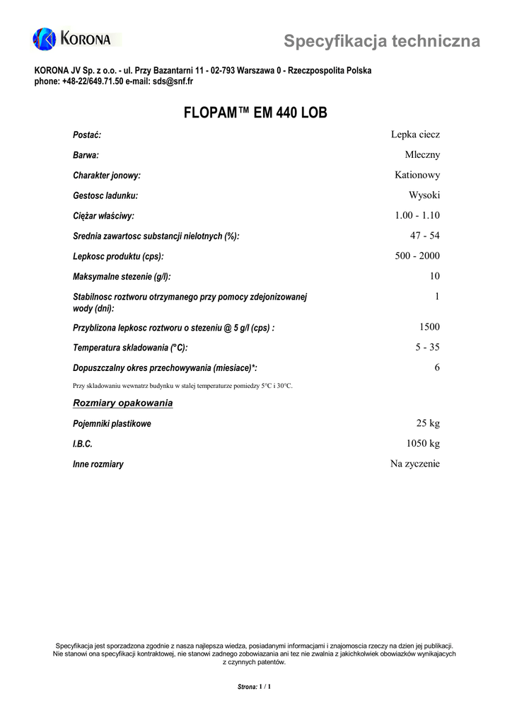 Specyfikacja techniczna KORONA JV Sp. z o.o. - ul. Przy Bazantarni 11 - 02-793 Warszawa 0 - Rzeczpospolita Polska phone: +48-22/649.71.50 e-mail: [email protected] FLOPAM™ EM 440 LOB Postaü : Lepka ciecz Barwa: Mleczny Charakter jonowy: Kationowy Gestosc ladunku: Wysoki CiĊ Ī ar wá aĞ ciwy: 1.00 - 1.10 Srednia zawartosc substancji nielotnych (%): Lepkosc produktu (cps): 47 - 54 500 - 2000 Maksymalne stezenie (g/l): 10 Stabilnosc roztworu otrzymanego przy pomocy zdejonizowanej wody (dni): Przyblizona lepkosc roztworu o stezeniu @ 5 g/l (cps) : Temperatura skladowania (°C): 1 1500 5 - 35 Dopuszczalny okres przechowywania (miesiace)*: 6 Przy skladowaniu wewnatrz budynku w stalej temperaturze pomiedzy 5°C i 30°C. Rozmiary opakowania Pojemniki plastikowe 25 kg I.B.C. 1050 kg Inne rozmiary Na zyczenie Specyfikacja jest sporzadzona zgodnie z nasza najlepsza wiedza, posiadanymi informacjami i znajomoscia rzeczy na dzien jej publikacji. Nie stanowi ona specyfikacji kontraktowej, nie stanowi zadnego zobowiazania ani tez nie zwalnia z jakichkolwiek obowiazków wynikajacych z czynnych patentów. Strona: 1 / 1