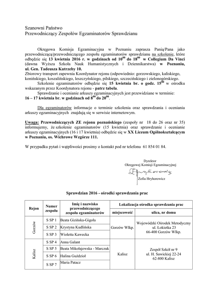 Szanowni Państwo Przewodniczący Zespołów Egzaminatorów Sprawdzianu Okręgowa Komisja Egzaminacyjna w Poznaniu zaprasza Panią/Pana jako przewodniczącą/przewodniczącego zespołu egzaminatorów sprawdzianu na szkolenie, które odbędzie się 13 kwietnia 2016 r. w godzinach od 1000 do 1800 w Collegium Da Vinci (dawna Wyższa Szkoła Nauk Humanistycznych i Dziennikarstwa) w Poznaniu, ul. Gen. Tadeusza Kutrzeby 10. Zbiorowy transport zapewnia Koordynator rejonu (odpowiednio: gorzowskiego, kaliskiego, konińskiego, koszalińskiego, leszczyńskiego, pilskiego, szczecińskiego i zielonogórskiego. Szkolenie egzaminatorów odbędzie się 15 kwietnia br. o godz. 1500 w ośrodku wskazanym przez Koordynatora rejonu - patrz tabela. Sprawdzanie i ocenianie arkuszy egzaminacyjnych jest przewidziane w terminie: 16 – 17 kwietnia br. w godzinach od 800 do 2000. Dla egzaminatorów informacje o terminie szkolenia oraz sprawdzania i oceniania arkuszy egzaminacyjnych znajdują się w serwisie internetowym. Uwaga: Przewodniczących ZE rejonu poznańskiego (zespoły nr 18 do 26 oraz nr 35) informujemy, że szkolenie egzaminatorów (15 kwietnia) oraz sprawdzanie i ocenianie arkuszy egzaminacyjnych (16 i 17 kwietnia) odbędzie się w XX Liceum Ogólnokształcącym w Poznaniu, os. Wichrowe Wzgórze 111. W przypadku pytań i wątpliwości prosimy o kontakt pod nr telefonu 61 854 01 84. Dyrektor Okręgowej Komisji Egzaminacyjnej Zofia Hryhorowicz Sprawdzian 2016 - ośrodki sprawdzania prac Gorzów Rejon Numer zespołu Imię i nazwisko przewodniczącego zespołu egzaminatorów Lokalizacja ośrodka sprawdzania prac miejscowość ulica, nr domu Gorzów Wlkp. Wojewódzki Ośrodek Metodyczny ul. Łokietka 23 66-400 Gorzów Wlkp. Kalisz Zespół Szkół nr 9 ul. H. Sawickiej 22-24 62-800 Kalisz S SP 1 Beata Gizińska-Gigoła S SP 2 Krystyna Kudlińska S SP 3 Wioletta Kawecka Kalisz S SP 4 Anna Galant S SP 5 Beata Mikołajewska - Marczuk S SP 6 Halina Guździoł S SP 7 Maria Patacz Konin S SP 8 Olga Wagner-Zaskórska S SP 9 Elżbieta Paluch Konin Centrum Doskonalenia Nauczycieli ul. Sosnowa 14 62-510 Konin Koszalin I Liceum Ogólnokształcące ul. Komisji Edukacji Narodowej 1 75-070 Koszalin Leszno I Liceum Ogólnokształcące ul. Karola Kurpińskiego 1 64-100 Leszno Piła Zespół Szkół nr 2 ul. Królowej Jadwigi 2 64-920 Piła Koszalin S SP 10 Bożena Wybrańska S SP 11 Mariola Rink-Przybylska S SP 12 Katarzyna Ponikowska Piła Leszno S SP 13 Mariusz Kropinski S SP 14 Mariola Robaczyńska S SP 15 Witold Prałat S SP 16 Joanna Bednarz S SP 17 Sylwia Dzikowska S SP 18 Grażyna Szulc S SP 19 Hanna Bielawska S SP 20 Małgorzata Stępak-Oleszak Poznań S SP 21 Anna Florkowska S SP 22 Lidia Konieczna-Mazur Poznań S SP 23 Roma Mazurek S SP 24 Jadwiga Urban XX Liceum Ogólnokształcące os. Wichrowe Wzgórze 111 61-674 Poznań S SP 25 Małgorzata Drojecka S SP 26 Olga Jakubczyk Zielona Góra S SP 35 Elżbieta Berendt Poznań - zespół specjalny S SP 27 Mieczysława Boratyńska S SP 28 Lilla Świąder Zielona Góra Zespół Szkół Akademickich ul. Szosa Kisielińska 18 65-247 Zielona Góra Szczecin Zespół Szkół nr 5 ul. Hoża 3 71-699 Szczecin S SP 29 Anna Radczyc-Grzelak Szczecin S SP 30 Anna Głowacka S SP 31 S SP 32 S SP 33 S SP 34 Hanna Guzik Hanna Hryniuk Beata Jagodzińska Joanna Maciejowska