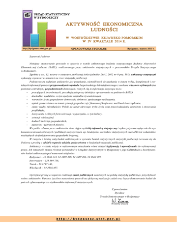 Szanowni Państwo Niniejsze opracowanie powstało w oparciu o wyniki ankietowego badania statystycznego Badanie Aktywności Ekonomicznej Ludności (BAEL), realizowanego przez ankieterów statystycznych – pracowników Urzędu Statystycznego w Bydgoszczy. Zgodnie z art. 12. ustawy o statystyce publicznej (tekst jednolity Dz.U. 2012 nr 0 poz. 591), ankieterzy statystyczni wykonują czynności w imieniu i na rzecz statystyki publicznej. Podstawowym zadaniem ankieterów jest pozyskanie, niemożliwych do uzyskania w innym trybie, kompletnych i rzetelnych informacji poprzez przeprowadzenie wywiadu bezpośredniego lub telefonicznego z osobami w losowo wybranych (na poziomie centralnym) gospodarstwach domowych i rolnych. Są to informacje dotyczące m.in.: pracujących, bezrobotnych, poszukujących pracy (niniejsze opracowanie na podstawie BAEL), dochodów, wydatków, w tym spożycia artykułów żywnościowych, warunków życia gospodarstw domowych, ubóstwa i społecznego wykluczenia, opinii społeczeństwa na temat sytuacji gospodarczej i finansowej kraju oraz możliwości oszczędzania, stanu wiedzy mieszkańców Polski na temat zdrowego trybu życia oraz przeciwdziałaniu chorobom i stosowania profilaktyki, korzystania z różnych form rekreacji i wypoczynku, w tym kultury, sytuacji edukacyjnej, hodowli zwierząt gospodarskich, zasiewów i zebranych plonów. Wszystkie zebrane przez ankieterów dane objęte są ścisłą tajemnicą statystyczną i wykorzystywane wyłącznie do wykonania zestawień zbiorczych i publikacji statystycznych, np. biuletynów, roczników statystycznych oraz obliczeń wskaźników niezbędnych do funkcjonowania gospodarki krajowej. W związku z istotną rolą badań ankietowych w systemie badań statystycznych statystyki publicznej zwracam się do Państwa z prośbą o udział i wsparcie udziału społeczeństwa w badaniach statystyki publicznej. Ankieterzy w czasie wizyty w wylosowanym mieszkaniu winni okazać legitymację i upoważnienie do wykonywanej pracy. Ich tożsamość można również potwierdzić w Urzędzie Statystycznym w Bydgoszczy i jego Oddziałach u koordynatorów badań ankietowych pod numerami telefonów: Bydgoszcz – 52 3669 333, 52 3669 408, 52 3669 482, 52 3669 389, Inowrocław – 533 304 738, Toruń – 56 6117 146, Włocławek – 54 2356 457. Uprzejmie proszę o wsparcie realizacji zadań publicznych nałożonych na polską statystykę publiczną i przychylność wobec ankieterów. Państwa życzliwe nastawienie pozwoli na efektywną realizację zadań oraz lepsze dostosowanie badań do potrzeb zgłaszanych przez użytkowników informacji statystycznych. Z poważaniem Dyrektor Urzędu Statystycznego w Bydgoszczy Wioletta Zwara http://bydgoszcz.stat.gov.pl Aktywność ekonomiczna ludności w IV kwartale 2014 r. Przedmiotem Badania Aktywności Ekonomicznej Ludności, prowadzonego od 1992 r. przez wszystkie urzędy statystyczne w Polsce, jest fakt wykonywania, posiadania bądź poszukiwania pracy w badanym tygodniu przez osoby w wieku 15 lat i więcej. Badanie prowadzone jest metodą reprezentacyjną w cyklu kwartalnym, a jego wyniki uogólniane są na populację generalną. W każdym z 13 tygodni kwartału badana jest 1/13 część próby mieszkań, dzięki czemu możemy obserwować zmiany na rynku pracy w okresie całego kwartału. Za ludność aktywną zawodowo (tzw. siłę roboczą) uważa się wszystkie osoby uznane za pracujące lub bezrobotne, zgodnie z definicjami podanymi poniżej. Do pracujących zaliczono wszystkie osoby w wieku 15 lat i więcej, które w okresie badanego tygodnia: wykonywały przez co najmniej 1 godzinę jakąkolwiek pracę przynoszącą dochód lub zarobek, tzn. były zatrudnione w charakterze pracownika najemnego, pracowały we własnym lub dzierżawionym gospodarstwie rolnym albo prowadziły własną działalność gospodarczą poza rolnictwem, pomagały (bez wynagrodzenia) w prowadzeniu rodzinnego gospodarstwa rolnego lub rodzinnej działalności gospodarczej poza rolnictwem, miały pracę, ale jej nie wykonywały: – z powodu choroby, urlopu macierzyńskiego lub wypoczynkowego, – z innych powodów, przy czym długość przerwy w pracy wynosiła: - do 3 miesięcy, - powyżej 3 miesięcy, ale osoby te były pracownikami najemnymi i w tym czasie otrzymywały co najmniej 50% dotychczasowego wynagrodzenia. Do pracujących – zgodnie z międzynarodowymi standardami – zaliczani byli również uczniowie, z którymi zakłady pracy lub osoby fizyczne zawarły umowę o naukę zawodu lub przyuczenie do określonej pracy, jeżeli otrzymywali wynagrodzenie. Ze względu na przyjęte założenia metodologiczne badania, liczba pracujących uzyskana w wyniku BAEL nie obejmuje niektórych kategorii osób, które są wliczane do pracujących w sprawozdawczości z zakresu zatrudnienia, m.in.: pracujących, mieszkających w hotelach pracowniczych, pracujących za granicą na rzecz polskich pracodawców. Do kategorii bezrobotnych zostały zaliczone osoby w wieku 15–74 lata, które spełniły jednocześnie trzy warunki: w okresie badanego tygodnia nie były osobami pracującymi (według powyższych kryteriów), aktywnie poszukiwały pracy, tzn. podjęły konkretne działania w ciągu 4 tygodni (wliczając jako ostatni tydzień badany), aby znaleźć pracę, były gotowe (zdolne) podjąć pracę w ciągu dwóch tygodni następujących po tygodniu badanym. Do bezrobotnych zostały zaliczone także osoby, które nie poszukiwały pracy, ponieważ miały pracę załatwioną i oczekiwały na jej rozpoczęcie przez okres nie dłuższy niż 3 miesiące oraz były gotowe tę pracę podjąć. Ludność bierna zawodowo to osoby w wieku 15 lat i więcej, które nie zostały zaklasyfikowane jako pracujące lub bezrobotne, tzn. osoby, które w badanym tygodniu: nie pracowały, nie miały pracy i jej nie poszukiwały, nie pracowały, poszukiwały pracy, ale nie były zdolne (gotowe) do jej podjęcia w ciągu 2 tygodni następujących po t