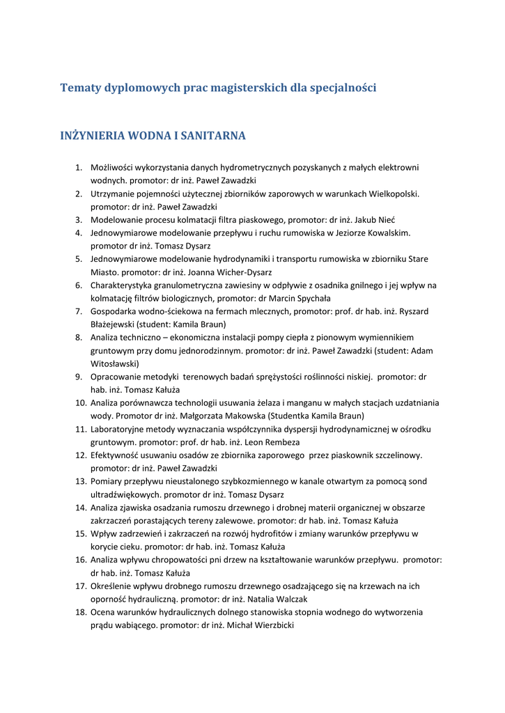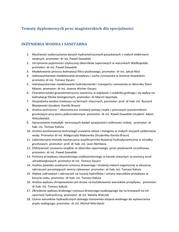 Tematy dyplomowych prac magisterskich dla specjalności INŻYNIERIA WODNA I SANITARNA 1. Możliwości wykorzystania danych hydrometrycznych pozyskanych z małych elektrowni wodnych. promotor: dr inż. Paweł Zawadzki 2. Utrzymanie pojemności użytecznej zbiorników zaporowych w warunkach Wielkopolski. promotor: dr inż. Paweł Zawadzki 3. Modelowanie procesu kolmatacji filtra piaskowego, promotor: dr inż. Jakub Nied 4. Jednowymiarowe modelowanie przepływu i ruchu rumowiska w Jeziorze Kowalskim. promotor dr inż. Tomasz Dysarz 5. Jednowymiarowe modelowanie hydrodynamiki i transportu rumowiska w zbiorniku Stare Miasto. promotor: dr inż. Joanna Wicher-Dysarz 6. Charakterystyka granulometryczna zawiesiny w odpływie z osadnika gnilnego i jej wpływ na kolmatację filtrów biologicznych, promotor: dr Marcin Spychała 7. Gospodarka wodno-ściekowa na fermach mlecznych, promotor: prof. dr hab. inż. Ryszard Błażejewski (student: Kamila Braun) 8. Analiza techniczno – ekonomiczna instalacji pompy ciepła z pionowym wymiennikiem gruntowym przy domu jednorodzinnym. promotor: dr inż. Paweł Zawadzki (student: Adam Witosławski) 9. Opracowanie metodyki terenowych badao sprężystości roślinności niskiej. promotor: dr hab. inż. Tomasz Kałuża 10. Analiza porównawcza technologii usuwania żelaza i manganu w małych stacjach uzdatniania wody. Promotor dr inż. Małgorzata Makowska (Studentka Kamila Braun) 11. Laboratoryjne metody wyznaczania współczynnika dyspersji hydrodynamicznej w ośrodku gruntowym. promotor: prof. dr hab. inż. Leon Rembeza 12. Efektywnośd usuwaniu osadów ze zbiornika zaporowego przez piaskownik szczelinowy. promotor: dr inż. Paweł Zawadzki 13. Pomiary przepływu nieustalonego szybkozmiennego w kanale otwartym za pomocą sond ultradźwiękowych. promotor dr inż. Tomasz Dysarz 14. Analiza zjawiska osadzania rumoszu drzewnego i drobnej materii organicznej w obszarze zakrzaczeo porastających tereny zalewowe. promotor: dr hab. inż. Tomasz Kałuża 15. Wpływ zadrzewieo i zakrzaczeo na rozwój hydrofitów i zmiany warunków przepływu w korycie cieku. promotor: dr hab. inż. Tomasz Kałuża 16. Analiza wpływu chropowatości pni drzew na kształtowanie warunków przepływu. promotor: dr hab. inż. Tomasz Kałuża 17. Określenie wpływu drobnego rumoszu drzewnego osadzającego się na krzewach na ich opornośd hydrauliczną. promotor: dr inż. Natalia Walczak 18. Ocena warunków hydraulicznych dolnego stanowiska stopnia wodnego do wytworzenia prądu wabiącego. promotor: dr inż. Michał Wierzbicki 19. Weryfikacja danych hydrologicznych wybranych posterunków wodowskazowych rzeki Warty oraz zbiornika Jeziorsko w aspekcie przejścia fali wezbraniowej. promotor: dr inż. Michał Wierzbicki 20. Weryfikacja metod wyznaczania obciążenia hydraulicznego ośrodka porowatego wstępnie oczyszczonymi ściekami, promotor: dr inż. Jakub Nied 21. Laboratoryjne metody wyznaczania współczynnika kinetyki kolmatacji filtra piaskowego, promotor: dr inż. Jakub Nied 22. Wpływ przyjęcia dolnego warunku brzegowego na odwzorowanie transformacji przepływu przez hipotetyczny polder przyrzeczny. Promotor pracy: prof. dr hab. inż. Bogdan J. Wosiewicz 23. Analiza pracy polderu Majdany dla fal powodziowych z 1997 i 2010 roku. Promotor pracy: dr inż. Ireneusz Laks