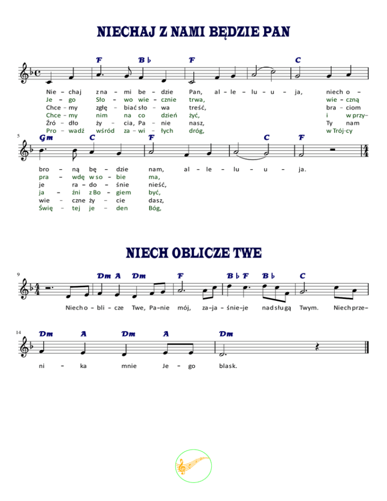 NIECHAJ Z NAMI BĘDZIE PAN F Nie Je Chce Chce Źró Pro 5 chaj go my my dło wadź z na Sło zgłę nim ży wśród Gm B♭ mi be wo wie biać sło na co cia, Pa za wi Pan, trwa, treść, żyć, nasz, dróg, C bro pra je ja wie Świę F C dzie cznie wa dzień nie łych al lu le F ną wdę ra źni czne tej dzie bie śnie giem cie den nam, ma, nieść, być, dasz, Bóg, bę w so do z Bo ży je al le lu u ja, niech wie bra i Ty w Trój o czną ciom w przy nam cy C F u ja. B♭ C 4 4 NIECH OBLICZE TWE 9 Dm A 4 4 Niech o 14 Dm ni A bli Dm B♭ F F cze Twe, Pa nie mój, za ja Niech prze śnie je Dm A ka mnie Je go blask. nad słu gą Twym. Dm C