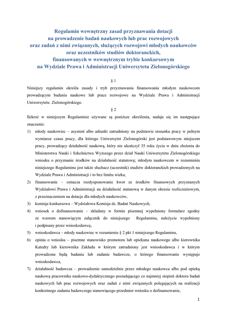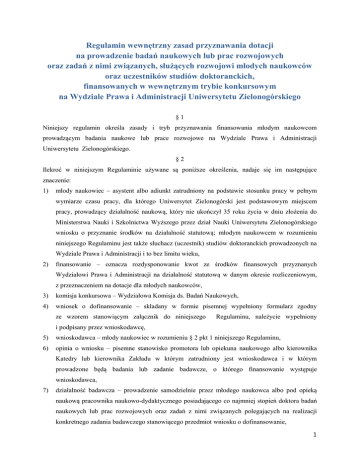 Regulamin wewnętrzny zasad przyznawania dotacji na prowadzenie badań naukowych lub prac rozwojowych oraz zadań z nimi związanych, służących rozwojowi młodych naukowców oraz uczestników studiów doktoranckich, finansowanych w wewnętrznym trybie konkursowym na Wydziale Prawa i Administracji Uniwersytetu Zielonogórskiego §1 Niniejszy regulamin określa zasady i tryb przyznawania finansowania młodym naukowcom prowadzącym badania naukowe lub prace rozwojowe na Wydziale Prawa i Administracji Uniwersytetu Zielonogórskiego. §2 Ilekroć w niniejszym Regulaminie używane są poniższe określenia, nadaje się im następujące znaczenie: 1) młody naukowiec – asystent albo adiunkt zatrudniony na podstawie stosunku pracy w pełnym wymiarze czasu pracy, dla którego Uniwersytet Zielonogórski jest podstawowym miejscem pracy, prowadzący działalność naukową, który nie ukończył 35 roku życia w dniu złożenia do Ministerstwa Nauki i Szkolnictwa Wyższego przez dział Nauki Uniwersytetu Zielonogórskiego wniosku o przyznanie środków na działalność statutową; młodym naukowcem w rozumieniu niniejszego Regulaminu jest także słuchacz (uczestnik) studiów doktoranckich prowadzonych na Wydziale Prawa i Administracji i to bez limitu wieku, 2) finansowanie – oznacza rozdysponowanie kwot ze środków finansowych przyznanych Wydziałowi Prawa i Administracji na działalność statutową w danym okresie rozliczeniowym, z przeznaczeniem na dotacje dla młodych naukowców, 3) komisja konkursowa – Wydziałowa Komisja ds. Badań Naukowych, 4) wniosek o dofinansowanie – składany w formie pisemnej wypełniony formularz zgodny ze wzorem stanowiącym załącznik do niniejszego Regulaminu, należycie wypełniony i podpisany przez wnioskodawcę, 5) wnioskodawca – młody naukowiec w rozumieniu § 2 pkt 1 niniejszego Regulaminu, 6) opinia o wniosku – pisemne stanowisko promotora lub opiekuna naukowego albo kierownika Katedry lub kierownika Zakładu w którym zatrudniony jest wnioskodawca i w którym prowadzone będą badania lub zadanie badawcze, o którego finansowanie występuje wnioskodawca, 7) działalność badawcza – prowadzenie samodzielnie przez młodego naukowca albo pod opieką naukową pracownika naukowo-dydaktycznego posiadającego co najmniej stopień doktora badań naukowych lub prac rozwojowych oraz zadań z nimi związanych polegających na realizacji konkretnego zadania badawczego stanowiącego przedmiot wniosku o dofinansowanie, 1 8) Wydział – Wydział Prawa i Administracji Uniwersytetu Zielonogórskiego, 9) Regulamin dotacji – Regulamin realizacji zadań badawczych w ramach dotacji na działalność statutową na Uniwersytecie Zielonogórskim – załącznik do zarządzenia nr 40 Rektora Uniwersytetu Zielonogórskiego z dnia 16.04.2013 r., 10) Konkurs – postępowanie wszczęte i przeprowadzone na podstawie postanowień niniejszego Regulaminu mające na celu wyłonienie młodych naukowców, którym przyznane zostanie dofinasowanie na badania naukowe i określenie wysokości dofinansowania na konkretne zadanie badawcze. §3 1. Przydział środków wydziałowych przeznaczonych na finansowanie działalności badawczej następuje w drodze Konkursu. 2. Konkurs ogłasza właściwy prodziekan po przyznaniu Wydziałowi środków na finansowanie badań naukowych służących rozwojowi młodych naukowców. §4 1. Informacja o terminie, trybie przeprowadzania Konkursu i wynikach postępowania konkursowego jest ogłaszana na stronie www Wydziału. W ogłoszeniu podany jest co najmniej 7 dniowy termin do składania wniosków przez zainteresowanych dofinansowaniem młodych naukowców. 2. Każdy z pracowników Wydziału Prawa i Administracji ma prawo do uzyskania od ogłaszającego Konkurs informacji czy w dniu ogłoszenia Konkursu spełnia kryteria uprawniające go do uzyskania statusu młodego naukowca w rozumieniu § 1 pkt 1 niniejszego Regulaminu. §5 1. Pracownicy Wydziału spełniający kryteria uznania ich za młodych naukowców składają za pośrednictwem prodziekana ogłaszającego Konkurs do Komisji konkursowej wnioski o dofinansowanie. 2. Wnioski, przygotowane według wzoru stanowiącego załącznik nr 1 do niniejszego Regulaminu, należycie wypełnione, podpisane przez wnioskodawców i zaopatrzone w wymagane opinie mogą składać tylko pracownicy uwzględnieni we wniosku o dotację złożonym na dany rok akademicki w którym następuje dofinansowanie działalności statutowej Wydziału. §6 Wnioski rozpatruje Wydziałowa Komisja ds. Badań Naukowych. Wniosek pochodzący od wnioskodawcy niespełniającego kryteriów uznania go za młodego naukowca w rozumieniu postanowień niniejszego Regulaminu, a także nie spełniający warunków formalnych nie będzie rozpoznawany. §7 Każdy wniosek musi zostać zaopiniowany przez promotora lub opiekuna naukowego – gdy o przyznanie środków ubiega się asystent albo uczestnik studiów doktoranckich albo przez Kierownika Katedry, w której ma być realizowane zadanie badawcze, o którego dofinansowanie wnioskodawca występuje. 2 §8 1. Komisja konkursowa ocenia wnioski o dofinansowanie biorąc pod uwagę następujące kryteria oceny: dotychczasowe osiągnięcia wnioskodawcy, wartość merytoryczną zadania badawczego, sposób przygotowania wniosku, wpływ zrealizowania zadania badawczego zgłoszonego we wniosku o dofinansowanie na dalszy rozwój naukowy wnioskodawcy, znaczenie zgłoszonych do finansowania badań naukowych (zadań badawczych) dla działalności naukowej i organizacyjnej Wydziału. 2. Oceniając dotychczasowe osiągnięcia wnioskodawcy i wartość merytoryczną zgłoszonego zadania badawczego Komisja opierać się będzie na opinii opiekuna naukowego lub Kierownika Katedry, o którym mowa w § 5 niniejszego Regulaminu. 3. Komisja przyznaje punkty za spełnienie każdego z wymienionych w ust. 1 kryteriów oceny. Za spełnienie każdego z tych kryteriów przyznaje się od 0 do 20 punktów. Maksymalna i