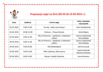 Propozycje zajęć na ferie (02-02 do 13-02-2015 r.) Data Godziny Forma zajęć Imię i nazwisko nauczyciela 02-02-2015 9.00-13.00 Turniej – piłka nożna klasy I Piotr Kwiatkowski 02-02-2015 10.00-12.00 Konkurs – Prawa Dziecka Anita Mądra 02-02-2015 9.00-11.00 03-02-2015 9.00-11.00 My na Pomorzu – spotkanie z ciekawymi ludźmi My na Pomorzu – spotkanie z ciekawymi ludźmi Joanna Jażdżewska Anna Mateja Joanna Jażdżewska Anna Mateja 03-02-2015 9.00-10.00 EEG Biofeedback Lilla Porzuczek 03-02-2015 9.00-13.00 Piłka siatkowa, piłka ręczna Joanna Swenda Barbara Kostecka 03-02-2015 8.00-14.00 Muzea i zabytki Gdańska Anna Borowicz 04-02-2015 9.00-13.00 Turniej – piłka nożna klasy II Piotr Kwiatkowski 04-02-2015 8.00-14.00 Wyjazd na łyżwy Barbara Dawidowska Janina Fularczyk-Grota 05-02-2015 9.00-11.00 Marchen Violetta Piątkowski 05-02-2015 9.00-10.00 EEG Biofeedback Lilla Porzuczek 05-02-2015 9.00-11.00 Konkurs czytelniczo-literacki Grażyna Czechowska 06-02-2015 9.00-13.00 Turniej – piłka nożna klasy III Dariusz Sobczyński 09-02-2015 9.00-13.00 Piłka ręczna Barbara Kostecka 10-02-2015 12.00-14.00 Tworzymy kalendarze w języku angielskim Justyna Juńska-Nacel 10-02-2015 12.00-14.00 Tworzymy kalendarze w języku niemieckim Michalina Lis 11-02-2015 8.00-14.00 Lodowisko i kręgle 11-02-2015 8.00-14.00 Lodowisko i kręgle Aleksandra Łapa Mariola Stubińska Barbara Dawidowska Janina Fularczyk-Grota