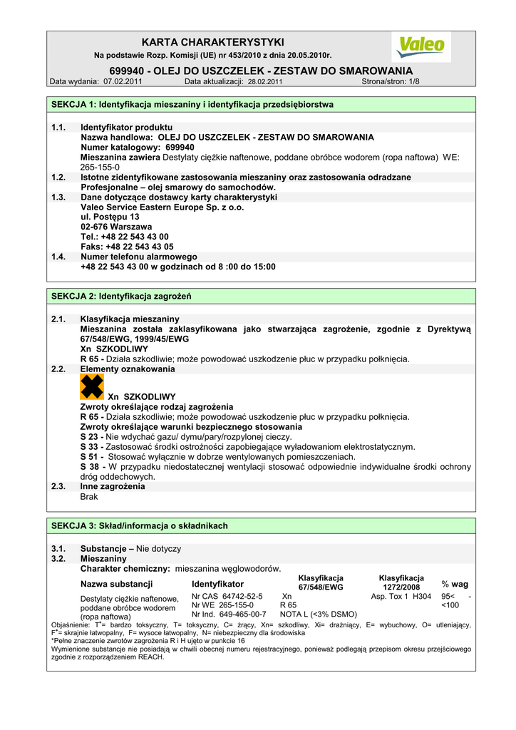 KARTA CHARAKTERYSTYKI Na podstawie Rozp. Komisji (UE) nr 453/2010 z dnia 20.05.2010r. 699940 - OLEJ DO USZCZELEK - ZESTAW DO SMAROWANIA Data wydania: 07.02.2011 Data aktualizacji: 28.02.2011 Strona/stron: 1/8 SEKCJA 1: Identyfikacja mieszaniny i identyfikacja przedsiębiorstwa 1.1. 1.2. 1.3. 1.4. Identyfikator produktu Nazwa handlowa: OLEJ DO USZCZELEK - ZESTAW DO SMAROWANIA Numer katalogowy: 699940 Mieszanina zawiera Destylaty cięŜkie naftenowe, poddane obróbce wodorem (ropa naftowa) WE: 265-155-0 Istotne zidentyfikowane zastosowania mieszaniny oraz zastosowania odradzane Profesjonalne – olej smarowy do samochodów. Dane dotyczące dostawcy karty charakterystyki Valeo Service Eastern Europe Sp. z o.o. ul. Postępu 13 02-676 Warszawa Tel.: +48 22 543 43 00 Faks: +48 22 543 43 05 Numer telefonu alarmowego +48 22 543 43 00 w godzinach od 8 :00 do 15:00 SEKCJA 2: Identyfikacja zagroŜeń 2.1. 2.2. 2.3. Klasyfikacja mieszaniny Mieszanina została zaklasyfikowana jako stwarzająca zagroŜenie, zgodnie z Dyrektywą 67/548/EWG, 1999/45/EWG Xn SZKODLIWY R 65 - Działa szkodliwie; moŜe powodować uszkodzenie płuc w przypadku połknięcia. Elementy oznakowania Xn SZKODLIWY Zwroty określające rodzaj zagroŜenia R 65 - Działa szkodliwie; moŜe powodować uszkodzenie płuc w przypadku połknięcia. Zwroty określające warunki bezpiecznego stosowania S 23 - Nie wdychać gazu/ dymu/pary/rozpylonej cieczy. S 33 - Zastosować środki ostroŜności zapobiegające wyładowaniom elektrostatycznym. S 51 - Stosować wyłącznie w dobrze wentylowanych pomieszczeniach. S 38 - W przypadku niedostatecznej wentylacji stosować odpowiednie indywidualne środki ochrony dróg oddechowych. Inne zagroŜenia Brak SEKCJA 3: Skład/informacja o składnikach 3.1. 3.2. Substancje – Nie dotyczy Mieszaniny Charakter chemiczny: mieszanina węglowodorów. Nazwa substancji Identyfikator Destylaty cięŜkie naftenowe, poddane obróbce wodorem (ropa naftowa) Nr CAS 64742-52-5 Nr WE 265-155-0 Nr Ind. 649-465-00-7 Klasyfikacja 67/548/EWG Xn R 65 NOTA L (<3% DSMO) Klasyfikacja 1272/2008 Asp. Tox 1 H304 % wag 95< <100 - Objaśnienie: T+= bardzo toksyczny, T= toksyczny, C= Ŝrący, Xn= szkodliwy, Xi= draŜniący, E= wybuchowy, O= utleniający, F+= skrajnie łatwopalny, F= wysoce łatwopalny, N= niebezpieczny dla środowiska *Pełne znaczenie zwrotów zagroŜenia R i H ujęto w punkcie 16 Wymienione substancje nie posiadają w chwili obecnej numeru rejestracyjnego, poniewaŜ podlegają przepisom okresu przejściowego zgodnie z rozporządzeniem REACH. KARTA CHARAKTERYSTYKI Na podstawie Rozp. Komisji (UE) nr 453/2010 z dnia 20.05.2010r. 699940 - OLEJ DO USZCZELEK - ZESTAW DO SMAROWANIA Data wydania: 07.02.2011 Data aktualizacji: 28.02.2011 Strona/stron: 2/8 SEKCJA 4: Środki pierwszej pomocy 4.1. 4.2. 4.3. Opis środków pierwszej pomocy Drogi naraŜenia: drogi oddechowe, drogi pokarmowe, kontakt ze skórą, kontakt z oczami. Następstwa wdychania: UłoŜyć poszkodowaną osobę w pozycji leŜącej. W przypadku wystąpienia takiej potrzeby zapewnić pomoc lekarską. Następstwa połknięcia: Przepłukać usta. Podać 1-2 szklanki wody do wypicia. U osoby przytomnej wywołać wymioty lub wykonać płukanie Ŝołądka. Zapewnić spokój, leŜenie i ciepło. W razie potrzeby zapewnić pomoc lekarską. Kontakt z oczami: Wyjąć szkła kontaktowe. Przemyć zanieczyszczone oczy większą ilością letniej wody przez 15 minut, przy wywiniętych powiekach W przypadku konieczności zapewnić pomoc okulisty. Kontakt ze skórą: Zdjąć zanieczyszczone ubranie. Oczyścić mechanicznie zanieczyszczoną skórę, przemyć duŜą ilością wody a następnie wodą z łagodnym mydłem. W przypadku takiej potrzeby zasięgnąć porady dermatologa. NajwaŜniejsze ostre i opóźnione objawy oraz skutki naraŜenia Nie są znane. Wskazania dotyczące wszelkiej natychmiastowej pomocy lekarskiej i szczególnego postępowania z poszkodowanym W miejscu pracy powinny być dostępne środki umoŜliwiające specjalistyczną i natychmiastową pomoc. Osoby udzielające pierwszej pomocy powinny posiadać rękawiczki medyczne. SEKCJA 5: Postępowanie w przypadku poŜaru 5.1. 5.2. 5.3. Środki gaśnicze Odpowiednie środki gaśnicze do gaszenia poŜarów: ditlenek węgla CO2, proszki gaśnicze, rozproszona woda. Niewłaściwe środki gaśnicze: Nie stosować zwartych strumieni wody na powierzchnię palącego się produktu. Powoduje to rozrzucanie palącej się produktu, a tym samym rozprzestrzenianie ognisk poŜaru. Szczególne zagroŜenia związane z substancją lub mieszaniną Produkty spalania: podczas spalania tworzy się tlenek i ditlenek węgla, woda. Mieszaniny wybuchowe: W sprzyjających warunkach, pary z powietrzem tworzą mieszaniny wybuchowe. Informacje dla straŜy poŜarnej Gaszenie poŜaru: Stosować standardowe metody gaszenia poŜarów chemicznych. Pojemniki naraŜone na działanie wysokiej temperatury chłodzić wodą. Usunąć z zagroŜonego obszaru. Opary strącać rozproszonymi strumieniami wody. Sprzęt ochronny straŜaków: Ubrania odporne na działanie wysokich temperatur. NiezaleŜne aparaty izolujące drogi oddechowe. Eksplozymetr. SEKCJA 6: Postępowanie w przypadku niezamierzonego uwolnienia do środowiska 6.1. Indywidualne środki ostroŜności, wyposaŜenie ochronne i procedury w sytuacjach awaryjnych Osoby udzielające pomocy powinny posiadać odzieŜ ochronną z materiału naturalnego, rękawice ochronne, szczelne okulary ochronne oraz ochrony dróg oddechowych w razie potrzeby. W przypadku niezamierzonego rozlewu nakazać opuszczenie zanieczyszczonego terenu osobom postronnym. KARTA CHARAKTERYSTYKI Na podstawie Rozp. Komisji (UE) nr 453/2010 z dnia 20.05.2010r. 699940 - OLEJ DO USZCZELEK - ZESTAW DO SMAROWANIA Data wydania: 07.02.2011 6.2. 6.3. 6.4. Data aktualizacji: 28.02.2011 Strona/stron: 3/8 W przypadku wydostania się mieszaniny do wód powierzchniowych lub podziemnych, ostrzec jej uŜytkowników. Środki ostroŜności w za
