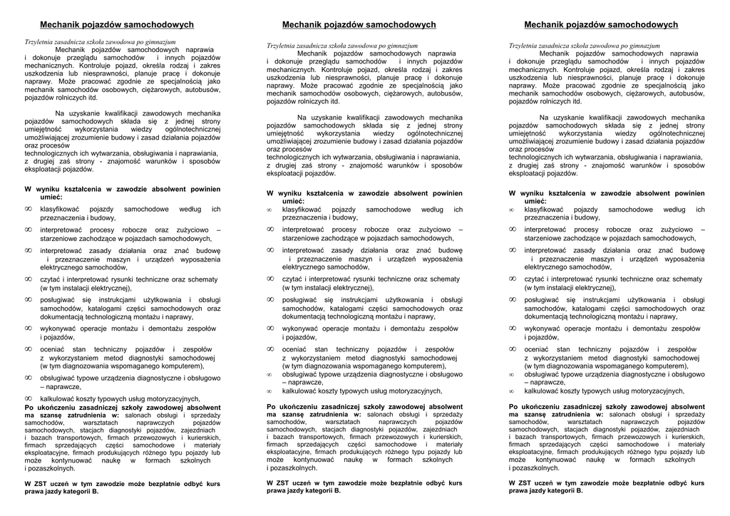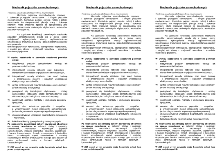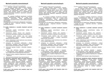 Mechanik pojazdów samochodowych Mechanik pojazdów samochodowych Trzyletnia zasadnicza szkoła zawodowa po gimnazjum Mechanik pojazdów samochodowych naprawia i dokonuje przeglądu samochodów i innych pojazdów mechanicznych. Kontroluje pojazd, określa rodzaj i zakres uszkodzenia lub niesprawności, planuje pracę i dokonuje naprawy. Może pracować zgodnie ze specjalnością jako mechanik samochodów osobowych, ciężarowych, autobusów, pojazdów rolniczych itd. Na uzyskanie kwalifikacji zawodowych mechanika pojazdów samochodowych składa się z jednej strony umiejętność wykorzystania wiedzy ogólnotechnicznej umożliwiającej zrozumienie budowy i zasad działania pojazdów oraz procesów technologicznych ich wytwarzania, obsługiwania i naprawiania, z drugiej zaś strony - znajomość warunków i sposobów eksploatacji pojazdów. W wyniku kształcenia w zawodzie absolwent powinien umieć: • • • • • • • • • klasyfikować pojazdy przeznaczenia i budowy, samochodowe według ich interpretować procesy robocze oraz zużyciowo – starzeniowe zachodzące w pojazdach samochodowych, interpretować zasady działania oraz znać budowę i przeznaczenie maszyn i urządzeń wyposażenia elektrycznego samochodów, czytać i interpretować rysunki techniczne oraz schematy (w tym instalacji elektrycznej), posługiwać się instrukcjami użytkowania i obsługi samochodów, katalogami części samochodowych oraz dokumentacją technologiczną montażu i naprawy, wykonywać operacje montażu i demontażu zespołów i pojazdów, oceniać stan techniczny pojazdów i zespołów z wykorzystaniem metod diagnostyki samochodowej (w tym diagnozowania wspomaganego komputerem), obsługiwać typowe urządzenia diagnostyczne i obsługowo – naprawcze, kalkulować koszty typowych usług motoryzacyjnych, Po ukończeniu zasadniczej szkoły zawodowej absolwent ma szansę zatrudnienia w: salonach obsługi i sprzedaży samochodów, warsztatach naprawczych pojazdów samochodowych, stacjach diagnostyki pojazdów, zajezdniach i bazach transportowych, firmach przewozowych i kurierskich, firmach sprzedających części samochodowe i materiały eksploatacyjne, firmach produkujących różnego typu pojazdy lub może kontynuować i pozaszkolnych. naukę w formach szkolnych W ZST uczeń w tym zawodzie może bezpłatnie odbyć kurs prawa jazdy kategorii B. Mechanik pojazdów samochodowych Trzyletnia zasadnicza szkoła zawodowa po gimnazjum Mechanik pojazdów samochodowych naprawia i dokonuje przeglądu samochodów i innych pojazdów mechanicznych. Kontroluje pojazd, określa rodzaj i zakres uszkodzenia lub niesprawności, planuje pracę i dokonuje naprawy. Może pracować zgodnie ze specjalnością jako mechanik samochodów osobowych, ciężarowych, autobusów, pojazdów rolniczych itd. Trzyletnia zasadnicza szkoła zawodowa po gimnazjum Mechanik pojazdów samochodowych naprawia i dokonuje przeglądu samochodów i innych pojazdów mechanicznych. Kontroluje pojazd, określa rodzaj i zakres uszkodzenia lub niesprawności, planuje pracę i dokonuje naprawy. Może pracować zgodnie ze specjalnością jako mechanik samochodów osobowych, ciężarowych, autobusów, pojazdów rolniczych itd. Na uzyskanie kwalifikacji zawodowych mechanika pojazdów samochodowych składa się z jednej strony umiejętność wykorzystania wiedzy ogólnotechnicznej umożliwiającej zrozumienie budowy i zasad działania pojazdów oraz procesów technologicznych ich wytwarzania, obsługiwania i naprawiania, z drugiej zaś strony - znajomość warunków i sposobów eksploatacji pojazdów. Na uzyskanie kwalifikacji zawodowych mechanika pojazdów samochodowych składa się z jednej strony umiejętność wykorzystania wiedzy ogólnotechnicznej umożliwiającej zrozumienie budowy i zasad działania pojazdów oraz procesów technologicznych ich wytwarzania, obsługiwania i naprawiania, z drugiej zaś strony - znajomość warunków i sposobów eksploatacji pojazdów. W wyniku kształcenia w zawodzie absolwent powinien umieć: • klasyfikować pojazdy samochodowe według ich przeznaczenia i budowy, W wyniku kształcenia w zawodzie absolwent powinien umieć: • klasyfikować pojazdy samochodowe według ich przeznaczenia i budowy, interpretować procesy robocze oraz zużyciowo – starzeniowe zachodzące w pojazdach samochodowych, interpretować procesy robocze oraz zużyciowo – starzeniowe zachodzące w pojazdach samochodowych, • • • • • • • • interpretować zasady działania oraz znać budowę i przeznaczenie maszyn i urządzeń wyposażenia elektrycznego samochodów, czytać i interpretować rysunki techniczne oraz schematy (w tym instalacji elektrycznej), posługiwać się instrukcjami użytkowania i obsługi samochodów, katalogami części samochodowych oraz dokumentacją technologiczną montażu i naprawy, wykonywać operacje montażu i demontażu zespołów i pojazdów, oceniać stan techniczny pojazdów i zespołów z wykorzystaniem metod diagnostyki samochodowej (w tym diagnozowania wspomaganego komputerem), obsługiwać typowe urządzenia diagnostyczne i obsługowo – naprawcze, kalkulować koszty typowych usług motoryzacyjnych, • • • • • • • • interpretować zasady działania oraz znać budowę i przeznaczenie maszyn i urządzeń wyposażenia elektrycznego samochodów, czytać i interpretować rysunki techniczne oraz schematy (w tym instalacji elektrycznej), posługiwać się instrukcjami użytkowania i obsługi samochodów, katalogami części samochodowych oraz dokumentacją technologiczną montażu i naprawy, wykonywać operacje montażu i demontażu zespołów i pojazdów, oceniać stan techniczny pojazdów i zespołów z wykorzystaniem metod diagnostyki samochodowej (w tym diagnozowania wspomaganego komputerem), obsługiwać typowe urządzenia diagnostyczne i obsługowo – naprawcze, kalkulować koszty typowych usług motoryzacyjnych, Po ukończeniu zasadniczej szkoły zawodowej absolwent Po