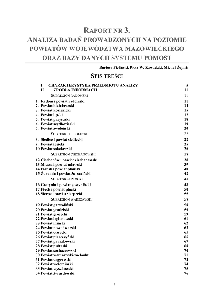 RAPORT NR 3. ANALIZA BADAŃ PROWADZONYCH NA POZIOMIE POWIATÓW WOJEWÓDZTWA MAZOWIECKIEGO ORAZ BAZY DANYCH SYSTEMU POMOST Bartosz Pieliński, Piotr W. Zawadzki, Michał Żejmis SPIS TREŚCI I. CHARAKTERYSTYKA PRZEDMIOTU ANALIZY II. ŹRÓDŁA INFORMACJI SUBREGION RADOMSKI 1. Radom i powiat radomski 2. Powiat białobrzeski 3. Powiat kozienicki 4. Powiat lipski 5. Powiat przysuski 6. Powiat szydłowiecki 7. Powiat zwoleński SUBREGION SIEDLECKI 8. Siedlce i powiat siedlecki 9. Powiat łosicki 10. Powiat sokołowski SUBREGION CIECHANOWSKI 12. Ciechanów i powiat ciechanowski 13. Mława i powiat mławski 14. Płońsk i powiat płoński 15. Żuromin i powiat żuromiński SUBREGION PŁOCKI 16. Gostynin i powiat gostyniński 17. Płock i powiat płocki 18. Sierpc i powiat sierpecki SUBREGION WARSZAWSKI 19. Powiat garwoliński 20. Powiat grodziski 21. Powiat grójecki 22. Powiat legionowski 23. Powiat miński 24. Powiat nowodworski 25. Powiat otwocki 26. Powiat piaseczyński 27. Powiat pruszkowski 28. Powiat pułtuski 29. Powiat sochaczewski 30. Powiat warszawski-zachodni 31. Powiat węgrowski 32. Powiat wołomiński 33. Powiat wyszkowski 34. Powiat żyrardowski 1 5 11 11 11 14 15 17 18 19 20 22 22 25 26 28 28 39 40 42 48 48 50 55 58 58 59 59 61 62 63 65 66 67 68 70 71 72 74 75 76 SUBREGION OSTROŁĘCKI 35. Powiat makowski 36. Ostrołęka 37. Powiat ostrołęcki 38. Powiat ostrowski 39. Powiat przasnyski M.ST. WARSZAWA III. ANALIZA DOKUMENTÓW SAMORZĄDÓW POWIATOWYCH STRATEGIE ROZWOJU POWIATÓW 1. Założenia metodologiczne 2. Analiza strategii STRATEGIE ROZWIĄZYWANIA PROBLEMÓW SPOŁECZNYCH 77 77 77 79 80 81 83 90 92 92 93 100 107 110 118 121 124 126 126 128 INNE STRATEGIE POWIATOWE SPRAWOZDANIA POWIATOWYCH URZĘDÓW PRACY OBRAZ STANU BEZROBOCIA NA LOKALNYCH RYNKACH PRACY OBRAZ STRUKTURY BEZROBOCIA NA LOKALNYCH RYNKACH PRACY OBRAZ DYNAMIKI ZJAWISK NA LOKALNYCH RYNKACH PRACY IV. PRZEGLĄD ZIDENTYFIKOWANYCH BADAŃ ANALIZA BADAŃ LOKALNYCH RYNKÓW PRACY - WPROWADZENIE ANALIZA BADAŃ LOKALNYCH RYNKÓW PRACY - BADANIA BADANIE NR 1. WARSZTATY LOKALNEGO OŻYWIENIA GOSPODARCZEGO W POWIECIE ŻUROMIŃSKIM 128 1. Przedmiot badań według obszarów problemowych 128 2. Opis metod zastosowanych w analizowanych badaniach empirycznych / tworzeniu baz danych 129 3. Zakres i rodzaj uzyskanych danych, osiągnięte wyniki 131 4. Rekomendacje pod adresem Mazowieckiego Obserwatorium Rynku Pracy 133 5. Wykaz publikacji związanych z prezentowanym badaniem 133 BADANIE NR 2. BADANIE TREŚCI MODUŁOWYCH OGŁOSZEŃ REKRUTACYJNYCH. ZAPOTRZEBOWANIE PRACODAWCÓW NA ZAWODY I KWALIFIKACJE. 134 6. Przedmiot badań według obszarów problemowych 134 7. Opis metod zastosowanych w analizowanych badaniach empirycznych / tworzeniu baz danych 135 8. Zakres i rodzaj uzyskanych danych, osiągnięte wyniki 137 9. Rekomendacje pod adresem Mazowieckiego Obserwatorium Rynku Pracy 139 10. Wykaz publikacji związanych z prezentowanym badaniem 140 BADANIE NR 3. BADANIE PRZEDSIĘBIORCÓW I PODMIOTÓW GOSPODARCZYCH. BADANIE OSÓB POSZUKUJĄCYCH PRACY. WYNIKI. 141 1. Przedmiot badań według obszarów problemowych 141 2. Opis metod zastosowanych w analizowanych badaniach empirycznych / tworzeniu baz danych 143 3. Zakres i rodzaj uzyskanych danych, osiągnięte wyniki 145 4. Rekomendacje pod adresem Mazowieckiego Obserwatorium Rynku Pracy 147 5. Wykaz publikacji związanych z prezentowanym badaniem 147 BADANIE NR 4. KOMPLEKSOWA I PROGNOSTYCZNA INFORMACJA O WARSZAWSKIM RYNKU PRACY 148 1. Przedmiot badań według obszarów problemowych 148 2. Opis metod zastosowanych w analizowanych badaniach empirycznych / tworzeniu baz danych 149 3. Zakres i rodzaj uzyskanych danych, osiągnięte wyniki 152 2 4. Rekomendacje pod adresem Mazowieckiego Obserwatorium Rynku Pracy 156 5. Wykaz publikacji związanych z prezentowanym badaniem 156 BADANIE NR 5. ANALIZA ANKIET DLA NIEPEŁNOSPRAWNYCH 157 1. Przedmiot badań według obszarów problemowych 157 2. Opis metod zastosowanych w analizowanych badaniach empirycznych / tworzeniu baz danych 158 3. Zakres i rodzaj uzyskanych danych, osiągnięte wyniki 158 4. Wykaz publikacji związanych z prezentowanym badaniem 159 BADANIE NR 6. ANALIZA ANKIET PRZEPROWADZONYCH WŚRÓD KOBIET ZAREJESTORWANYCH W POWIATOWYM URZĘDZIE PRACY W ŻUROMINIE 160 1. Przedmiot badań według obszarów problemowych 160 2. Opis metod zastosowanych w analizowanych badaniach empirycznych / tworzeniu baz danych 161 3. Zakres i rodzaj uzyskanych danych, osiągnięte wyniki 162 4. Wykaz publikacji związanych z prezentowanym badaniem 163 BADANIE NR 7. BADANIE BEZROBOTNYCH KOBIET PO 50 ROKU ŻYCIA 164 1. Przedmiot badań według obszarów problemowych 164 2. Opis metod zastosowanych w analizowanych badaniach empirycznych / tworzeniu baz danych 165 3. Zakres i rodzaj uzyskanych danych, osiągnięte wyniki 166 4. Wykaz publikacji związanych z prezentowanym badaniem 167 BADANIE NR 8. OSOBY BEZROBOTNE 45+ ZAREJESTROWANE W POWIATOWYM URZĘDZIE PRACY W ŻUROMINIE 168 1.1. Przedmiot badań według obszarów problemowych 168 1.1.5. Opis metod zastosowanych w analizowanych badaniach empirycznych tworzeniu baz danych 169 1.2. Zakres i rodzaj uzyskanych danych, osiągnięte wyniki 170 1.3. Wykaz publikacji związanych z prezentowanym badaniem 172 BADANIE NR 9. SUBIEKTYWNE BARIERY EDUKACYJNE. BADANIE CZYNNIKÓW BLOKUJĄCYCH „INWESTYCJE EDUKACYJNE” BEZROBOTNYCH. 173 1. Przedmiot badań według obszarów problemowych 173 2. Opis metod zastosowanych w analizowanych badaniach empirycznych / tworzeniu baz danych 174 3. Zakres i rodzaj uzyskanych danych, osiągnięte wyniki 175 4. Rekomendacje pod adresem Mazowieckiego Obserwatorium Rynku Pracy 176 5. Wykaz publikacji związanych z prezentowanym badaniem 177 BADANIE NR 10. BADANIE ANKIETOWE OSÓB BEZROBOTNYCH ZAREJESTROWANYCH W PUP RADOM I JEGO FILIACH 178 1. Przedmiot badań według obszarów problemowych 178 2. Opis metod zastosowanych w analizowanych badaniach empirycznych / tworzeniu baz danych 179 3. Zakres 
