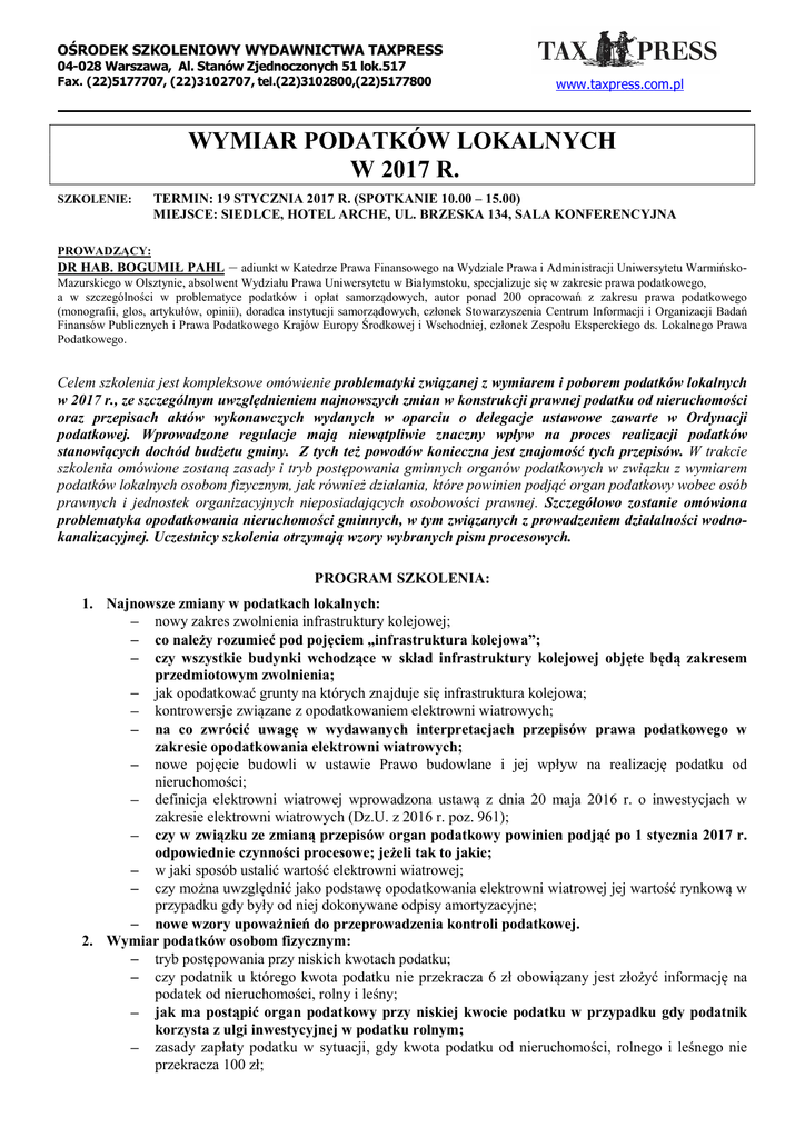OŚRODEK SZKOLENIOWY WYDAWNICTWA TAXPRESS 04-028 Warszawa, Al. Stanów Zjednoczonych 51 lok.517 Fax. (22)5177707, (22)3102707, tel.(22)3102800,(22)5177800 www.taxpress.com.pl WYMIAR PODATKÓW LOKALNYCH W 2017 R. SZKOLENIE: TERMIN: 19 STYCZNIA 2017 R. (SPOTKANIE 10.00 – 15.00) MIEJSCE: SIEDLCE, HOTEL ARCHE, UL. BRZESKA 134, SALA KONFERENCYJNA PROWADZĄCY: – adiunkt w Katedrze Prawa Finansowego na Wydziale Prawa i Administracji Uniwersytetu WarmińskoMazurskiego w Olsztynie, absolwent Wydziału Prawa Uniwersytetu w Białymstoku, specjalizuje się w zakresie prawa podatkowego, a w szczególności w problematyce podatków i opłat samorządowych, autor ponad 200 opracowań z zakresu prawa podatkowego (monografii, glos, artykułów, opinii), doradca instytucji samorządowych, członek Stowarzyszenia Centrum Informacji i Organizacji Badań Finansów Publicznych i Prawa Podatkowego Krajów Europy Środkowej i Wschodniej, członek Zespołu Eksperckiego ds. Lokalnego Prawa Podatkowego. DR HAB. BOGUMIŁ PAHL Celem szkolenia jest kompleksowe omówienie problematyki związanej z wymiarem i poborem podatków lokalnych w 2017 r., ze szczególnym uwzględnieniem najnowszych zmian w konstrukcji prawnej podatku od nieruchomości oraz przepisach aktów wykonawczych wydanych w oparciu o delegacje ustawowe zawarte w Ordynacji podatkowej. Wprowadzone regulacje mają niewątpliwie znaczny wpływ na proces realizacji podatków stanowiących dochód budżetu gminy. Z tych też powodów konieczna jest znajomość tych przepisów. W trakcie szkolenia omówione zostaną zasady i tryb postępowania gminnych organów podatkowych w związku z wymiarem podatków lokalnych osobom fizycznym, jak również działania, które powinien podjąć organ podatkowy wobec osób prawnych i jednostek organizacyjnych nieposiadających osobowości prawnej. Szczegółowo zostanie omówiona problematyka opodatkowania nieruchomości gminnych, w tym związanych z prowadzeniem działalności wodnokanalizacyjnej. Uczestnicy szkolenia otrzymają wzory wybranych pism procesowych. PROGRAM SZKOLENIA: 1. Najnowsze zmiany w podatkach lokalnych: nowy zakres zwolnienia infrastruktury kolejowej; co należy rozumieć pod pojęciem „infrastruktura kolejowa”; czy wszystkie budynki wchodzące w skład infrastruktury kolejowej objęte będą zakresem przedmiotowym zwolnienia; jak opodatkować grunty na których znajduje się infrastruktura kolejowa; kontrowersje związane z opodatkowaniem elektrowni wiatrowych; na co zwrócić uwagę w wydawanych interpretacjach przepisów prawa podatkowego w zakresie opodatkowania elektrowni wiatrowych; nowe pojęcie budowli w ustawie Prawo budowlane i jej wpływ na realizację podatku od nieruchomości; definicja elektrowni wiatrowej wprowadzona ustawą z dnia 20 maja 2016 r. o inwestycjach w zakresie elektrowni wiatrowych (Dz.U. z 2016 r. poz. 961); czy w związku ze zmianą przepisów organ podatkowy powinien podjąć po 1 stycznia 2017 r. odpowiednie czynności procesowe; jeżeli tak to jakie; w jaki sposób ustalić wartość elektrowni wiatrowej; czy można uwzględnić jako podstawę opodatkowania elektrowni wiatrowej jej wartość rynkową w przypadku gdy były od niej dokonywane odpisy amortyzacyjne; nowe wzory upoważnień do przeprowadzenia kontroli podatkowej. 2. Wymiar podatków osobom fizycznym: tryb postępowania przy niskich kwotach podatku; czy podatnik u którego kwota podatku nie przekracza 6 zł obowiązany jest złożyć informację na podatek od nieruchomości, rolny i leśny; jak ma postąpić organ podatkowy przy niskiej kwocie podatku w przypadku gdy podatnik korzysta z ulgi inwestycyjnej w podatku rolnym; zasady zapłaty podatku w sytuacji, gdy kwota podatku od nieruchomości, rolnego i leśnego nie przekracza 100 zł; OŚRODEK SZKOLENIOWY WYDAWNICTWA TAXPRESS 04-028 Warszawa, Al. Stanów Zjednoczonych 51 lok.517 Fax. (22)5177707, (22)3102707, tel.(22)3102800,(22)5177800 www.taxpress.com.pl 3. 4. 5. 6. informacje na podatek od nieruchomości, rolny i leśny a obowiązek wydania postanowienia o wszczęciu postępowania i postanowienia o siedmiodniowym terminie do wypowiedzenia się w sprawie zebranego materiału dowodowego; jak postąpić w przypadku gdy wszyscy współwłaściciele nie złożyli informacji na podatek od nieruchomości; czy w tym przypadku można nie wydawać postanowienia o wszczęciu postępowania i postanowienia o siedmiodniowym terminie do wypowiedzenia się w sprawie zebranego materiału dowodowego; co z podpisywaniem decyzji ustalających wysokość zobowiązania podatkowego; kontrowersje związane z zasadami obliczania liczby hektarów przeliczeniowych w podatku rolnym. Zasady postępowania w stosunku do osób prawnych i jednostek organizacyjnych nieposiadających osobowości prawnej: czy osoby prawne mają obowiązek składania deklaracji przy „niskich” kwotach podatków; jak postąpić w przypadku gdy złożona deklaracja jest nieprawidłowa bądź też jej w ogóle nie złożono; w jakich przypadkach organ podatkowy może dokonać korekty deklaracji z urzędu; pełnomocnictwa do składania deklaracji na podatek od nieruchomości, rolny, leśny i od środków transportowych; kiedy podatnik zobowiązany jest przedstawić pełnomocnictwo do złożenia deklaracji; co z opłatą skarbową od pełnomocnictwa; tryb postępowania ze złożonymi wnioskami o stwierdzenie nadpłaty w podatkach lokalnych. Opodatkowanie nieruchomości gminnych: zakres zwolnienia z podatku od nieruchomości gruntów i budynków stanowiących własność gminy (art. 7 ust. 1 pkt. 15 u.p.o.l.); które grunty i budynki nie powinny być wykazywane przez gminę w składanej deklaracji na podatek od nieruchomości; czy takie obiekty jak: świetlice wiejskie, remizy strażackie, budynki GOPS-u, MOPS-u, Biblioteki Gminnej są zwolnione od podatku na podstawie nowego art. 7 ust. 1 pkt. 15 ustawy o podatkach i opłatach lokalnych; czy gmina powinna wykazywać do opodatkowania budowle kanalizacyj