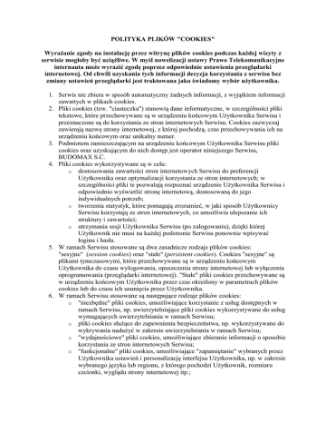 POLITYKA PLIKÓW "COOKIES" Wyrażanie zgody na instalację przez witrynę plików cookies podczas każdej wizyty z serwisie mogłoby być uciążliwe. W myśl nowelizacji ustawy Prawo Telekomunikacyjne internauta może wyrazić zgodę poprzez odpowiednie ustawienia przeglądarki internetowej. Od chwili uzyskania tych informacji decyzja korzystania z serwisu bez zmiany ustawień przeglądarki jest traktowana jako świadomy wybór użytkownika. 1. Serwis nie zbiera w sposób automatyczny żadnych informacji, z wyjątkiem informacji zawartych w plikach cookies. 2. Pliki cookies (tzw. "ciasteczka") stanowią dane informatyczne, w szczególności pliki tekstowe, które przechowywane są w urządzeniu końcowym Użytkownika Serwisu i przeznaczone są do korzystania ze stron internetowych Serwisu. Cookies zazwyczaj zawierają nazwę strony internetowej, z której pochodzą, czas przechowywania ich na urządzeniu końcowym oraz unikalny numer. 3. Podmiotem zamieszczającym na urządzeniu końcowym Użytkownika Serwisu pliki cookies oraz uzyskującym do nich dostęp jest operator niniejszego Serwisu, BUDOMAX S.C. 4. Pliki cookies wykorzystywane są w celu: o dostosowania zawartości stron internetowych Serwisu do preferencji Użytkownika oraz optymalizacji korzystania ze stron internetowych; w szczególności pliki te pozwalają rozpoznać urządzenie Użytkownika Serwisu i odpowiednio wyświetlić stronę internetową, dostosowaną do jego indywidualnych potrzeb; o tworzenia statystyk, które pomagają zrozumieć, w jaki sposób Użytkownicy Serwisu korzystają ze stron internetowych, co umożliwia ulepszanie ich struktury i zawartości; o utrzymania sesji Użytkownika Serwisu (po zalogowaniu), dzięki której Użytkownik nie musi na każdej podstronie Serwisu ponownie wpisywać loginu i hasła. 5. W ramach Serwisu stosowane są dwa zasadnicze rodzaje plików cookies: "sesyjne" (session cookies) oraz "stałe" (persistent cookies). Cookies "sesyjne" są plikami tymczasowymi, które przechowywane są w urządzeniu końcowym Użytkownika do czasu wylogowania, opuszczenia strony internetowej lub wyłączenia oprogramowania (przeglądarki internetowej). "Stałe" pliki cookies przechowywane są w urządzeniu końcowym Użytkownika przez czas określony w parametrach plików cookies lub do czasu ich usunięcia przez Użytkownika. 6. W ramach Serwisu stosowane są następujące rodzaje plików cookies: o "niezbędne" pliki cookies, umożliwiające korzystanie z usług dostępnych w ramach Serwisu, np. uwierzytelniające pliki cookies wykorzystywane do usług wymagających uwierzytelniania w ramach Serwisu; o pliki cookies służące do zapewnienia bezpieczeństwa, np. wykorzystywane do wykrywania nadużyć w zakresie uwierzytelniania w ramach Serwisu; o "wydajnościowe" pliki cookies, umożliwiające zbieranie informacji o sposobie korzystania ze stron internetowych Serwisu; o "funkcjonalne" pliki cookies, umożliwiające "zapamiętanie" wybranych przez Użytkownika ustawień i personalizację interfejsu Użytkownika, np. w zakresie wybranego języka lub regionu, z którego pochodzi Użytkownik, rozmiaru czcionki, wyglądu strony internetowej itp.; "reklamowe" pliki cookies, umożliwiające dostarczanie Użytkownikom treści reklamowych bardziej dostosowanych do ich zainteresowań. 7. W wielu przypadkach oprogramowanie służące do przeglądania stron internetowych (przeglądarka internetowa) domyślnie dopuszcza przechowywanie plików cookies w urządzeniu końcowym Użytkownika. Użytkownicy Serwisu mogą dokonać w każdym czasie zmiany ustawień dotyczących plików cookies. Ustawienia te mogą zostać zmienione w szczególności w taki sposób, aby blokować automatyczną obsługę plików cookies w ustawieniach przeglądarki internetowej bądź informować o ich każdorazowym zamieszczeniu w urządzeniu Użytkownika Serwisu. Informacje dotyczące sposobów zmian ustawienia cookies w najpopularniejszych przeglądarkach internetowych znajdują się w dalszej części niniejszego dokumentu. Szczegółowe informacje o możliwości i sposobach obsługi plików cookies dostępne są w ustawieniach oprogramowania (przeglądarki internetowej) oraz w plikach pomocy dostępnych w menu przeglądarki. 8. Operator Serwisu informuje, że ograniczenia stosowania plików cookies mogą wpłynąć na niektóre funkcjonalności dostępne na stronach internetowych Serwisu. 9. Pliki cookies zamieszczane w urządzeniu końcowym Użytkownika Serwisu wykorzystywane mogą być również przez współpracujących z operatorem Serwisu reklamodawców, partnerów oraz podmiotów trzecich (np. Facebook, Twitter, Google itp.). o Aplikacje mobilne a pliki cookies Podobnie, jak w przypadku witryny internetowej, Użytkownik aplikacji mobilnej Operatora Serwisu jest informowany o wykorzystywaniu plików działających podobnie do cookies w przeglądarce internetowej. Pliki takie mają za zadanie m. in. zapisywanie informacji o preferencjach Użytkownika, jak również ustawień aplikacji. Komunikat informujący o wykorzystywaniu takich plików widnieje na stronach, z których można legalnie aplikacje Operatora Serwisu pobrać, tj. w sklepach producentów mobilnych systemów operacyjnych. Instalacja i użytkowanie aplikacji mobilnych Operatora Serwisu pobranych z jakiegokolwiek źródła jest traktowana jako wyrażenie zgody na zapisywanie na urządzeniu końcowym Użytkownika plików działających podobnie do plików cookies. W przypadku braku zgody na ww. należy zaprzestać użytkowania aplikacji oraz usunąć ją z urządzenia końcowego. PLIKI COOKIES - INSTRUKCJA Usuwanie, wyłączanie przechowywania, przywracanie przechowywania plików cookies Sposób zmiany ustawień plików cookies może różnić się w zależności od przeglądarki internetowej, z której korzysta użytkownik. Informacje na temat plików cookies znajdują się w zakładce "Pomoc" w każdej przeglądarce internetowej. Pliki cookies w przeglądarkach int