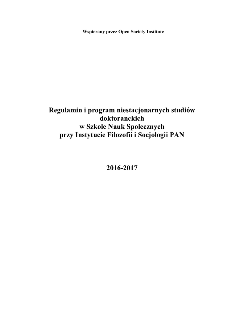 Wspierany przez Open Society Institute Regulamin i program niestacjonarnych studiów doktoranckich w Szkole Nauk Społecznych przy Instytucie Filozofii i Socjologii PAN 2016-2017 1. Szkoła Nauk Społecznych: studia doktoranckie 2. Wykłady i seminaria 2.1.Zajęcia z socjologii współczesnej/filozofii współczesnej 2.2. Ogólne zasady dotyczące zajęć 3. Konkurs na najlepszą pracę seminaryjną 4. Wybór opiekuna pracy doktorskiej 5. Wybór tematu pracy oraz seminaria doktorskie 6. Jak liczone są punkty? 6.1 Wykłady/ seminaria 6.1.1 Zapisy na wykłady i seminaria 6.1.2 Potwierdzenie zaliczenia – karty zaliczeń 6.2 Punkty za zajęcia w ramach programu MA 6.3 Absolwenci programu MA kontynuujący studia w programie doktorskim 6.4 Punkty dodatkowe 6 .4.1 Publikacje 6.4.2. Udział w projektach badawczych 6.4.3 Prowadzenie zajęć 6.4.4 Szkoły letnie 7. Kryteria oceny prac zaliczeniowych 7.1 Plagiaty 7. Opłaty. 9. Ocena postępów w pracy nad doktoratem 10.1 Ocena złożonych materiałów 10.2 Informacja dotycząca sposobu użytkowania środków finansowych 10. Uznawalność wykształcenia 11. Informacja o toku przewodu doktorskiego 12. Przerwy w studiach 13. Samorząd słuchaczy i jego rola 14. Ocena zajęć, informacja zwrotna od słuchaczy 15. Komisja dyscyplinarna do spraw doktorantów 2 1. Szkoła Nauk Społecznych: studia doktoranckie Szkoła Nauk Społecznych przy Instytucie Filozofii i Socjologii Polskiej Akademii Nauk we współpracy z partnerami prowadzi niestacjonarne, interdyscyplinarne studia doktoranckie w zakresie nauk o społeczeństwie i kulturze oraz filozofii i historii. Celem studiów jest przygotowanie teoretyczne i praktyczne słuchaczy do prowadzenia badań naukowych w wybranych przez nich dziedzinach, a także pomoc w przygotowaniu rozprawy doktorskiej. O przyjęcie na niestacjonarne studia doktoranckie w Szkole Nauk Społecznych może ubiegać się każdy absolwent wyższej uczelni polskiej lub zagranicznej, posiadający stopień magistra lub równorzędny. Kandydaci na studia wykazać się winni kwalifikacjami naukowymi, przygotowaniem do prowadzenia badań oraz znajomością języka angielskiego pozwalającą na uczestnictwo w zajęciach prowadzonych w tym języku. O przyjęciu na studia doktoranckie decyduje Komisja Rekrutacyjna postępująca zgodnie z trybem przyjętym przez Radę Naukową IFiS PAN. Warunki rekrutacji podawane są do wiadomości publicznej za pomocą internetu lub innych środków masowego przekazu oraz udostępniane w formie ogłoszeń wywieszanych w siedzibie Szkoły przynajmniej na 5 miesięcy przed terminem rozpoczęcia zajęć. Słuchacze programu doktoranckiego Szkoły otrzymują legitymacje doktoranta Instytutu Filozofii i Socjologii PAN. Uzyskują oni wszystkie uprawnienia, jakie wynikają z ustawodawstwa polskiego Przełożonym słuchaczy jest Kierownik Szkoły. Studia doktoranckie w Szkole nie mogą trwać dłużej niż cztery lata (z możliwością przedłużenia o jeden rok i ewentualny urlop macierzyński). Kończą się obroną rozprawy doktorskiej. Przewody doktorskie przeprowadzane będą we właściwych instytutach PAN lub na uczelniach wyższych zgodnie z obowiązującymi przepisami prawnymi. 2. Wykłady i seminaria Lista wykładów i seminariów oferowanych w danym roku akademickim dostępna jest na stronie internetowej http://www.css.edu.pl/programmes/phd-programme/ Słuchacze Szkoły objęci są indywidualnym tokiem studiów. Wybierają zajęcia spośród wymienionych poniżej 6 bloków tematycznych, stanowiących ofertę programową Szkoły. 3 Są to: I. II. III. IV. V. VI. Filozofia współczesna Teorie i metodologia nauk społecznych Polityka i społeczeństwo obywatelskie Kultura, komunikacja, ideologia i tożsamość Struktury, instytucje i zmiany społeczne Kursy podstawowe Słuchacz wpisuje do deklaracji zajęć online te zajęcia, w których zobowiązuje się uczestniczyć. Począwszy od drugiego roku studiów wybór zajęć wymaga uzgodnienia z opiekunem pracy doktorskiej lub opiekunem w SNS. Możliwy jest również udział w zajęciach poza SNS, co wymaga jednak pisemnej zgody Kierownika Szkoły. Prośby o zezwolenie zaliczania zajęć poza SNS powinny być złożone w formie pisemnej, z dołączonym opisem zajęć (sylabus), określeniem ich charakteru (wykład, seminarium, inne) oraz liczbą godzin w poszczególnych semestrach. 2.1 Zajęcia z socjologii Słuchacze, którzy wcześniej nie studiowali socjologii, a zamierzają przygotować rozprawę doktorską z tej dziedziny, zobowiązani są do zaliczenia zajęć ze współczesnych teorii socjologicznych oraz metodologii badań do końca trzeciego roku studiów. Udział w tym wykładzie zalecamy tym słuchaczom, którzy ukończyli studia socjologiczne za granicą, a przygotowują rozprawę z socjologii. Listy lektur obowiązkowych i uzupełniających, pomocnych w przygotowaniu do egzaminów doktorskich dostępne są na intranecie (info.sns.edu.pl). 2.2 Ogólne zasady dotyczące zajęć Wykładowcy mogą określać wstępne warunki uczestnictwa w prowadzonych przez siebie zajęciach. Uruchomiane są tylko te zajęcia, na które zapisze się minimum 8 słuchaczy. W sytuacji, gdy na zajęcia zapisze się nadmierna liczba chętnych, ostateczną decyzję o przyjęciu oraz warunkach zaliczenia określa prowadzący (patrz katalog SNS) Więcej niż dwie nieusprawiedliwione nieobecności w semestrze na wybranych przez słuchacza zajęciach lub lektoratach, powodować mogą skreślenie z listy uczestników 4 (dotyczy to również wszystkich lektoratów, do udziału w których student został zobowiązany). Słuchacze, którzy z powodów zdrowotnych lub innych uzasadnionych przyczyn nie mogą uczestniczyć w zajęciach, zobowiązani są do niezwłocznego poinformowania o tym fakcie sekretariatu Szkoły. W przypadku choroby niezbędne jest dostarczenie zwolnienia lekarskiego z adnotacją, że choroba uniemożliwia udział w zajęciach. Każde końcowe zaliczenie, aby