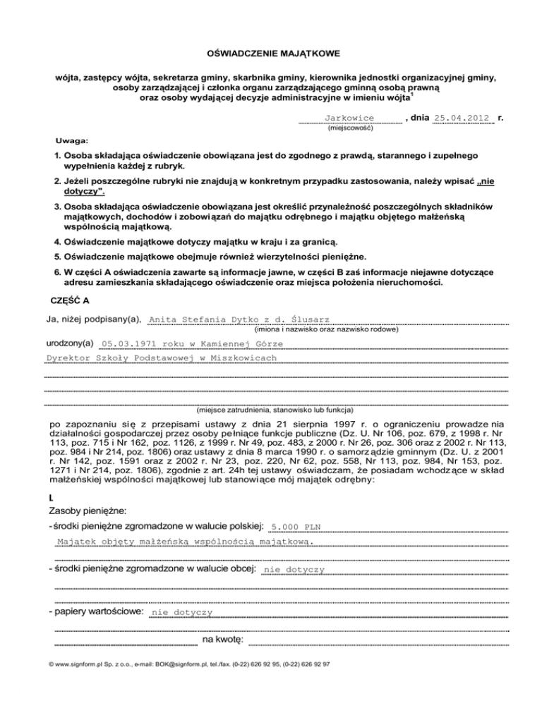 OŚWIADCZENIE MAJĄTKOWE wójta, zastępcy wójta, sekretarza gminy, skarbnika gminy, kierownika jednostki organizacyjnej gminy, osoby zarządzającej i członka organu zarządzającego gminną osobą prawną oraz osoby wydającej decyzje administracyjne w imieniu wójta1 Jarkowice , dnia 25.04.2012 r. (miejscowość) Uwaga: 1. Osoba składająca oświadczenie obowiązana jest do zgodnego z prawdą, starannego i zupełnego wypełnienia każdej z rubryk. 2. Jeżeli poszczególne rubryki nie znajdują w konkretnym przypadku zastosowania, należy wpisać „nie dotyczy". 3. Osoba składająca oświadczenie obowiązana jest określić przynależność poszczególnych składników majątkowych, dochodów i zobowiązań do majątku odrębnego i majątku objętego małżeńską wspólnością majątkową. 4. Oświadczenie majątkowe dotyczy majątku w kraju i za granicą. 5. Oświadczenie majątkowe obejmuje również wierzytelności pieniężne. 6. W części A oświadczenia zawarte są informacje jawne, w części B zaś informacje niejawne dotyczące adresu zamieszkania składającego oświadczenie oraz miejsca położenia nieruchomości. CZĘŚĆ A Ja, niżej podpisany(a), Anita Stefania Dytko z d. Ślusarz (imiona i nazwisko oraz nazwisko rodowe) urodzony(a) 05.03.1971 roku w Kamiennej Górze Dyrektor Szkoły Podstawowej w Miszkowicach (miejsce zatrudnienia, stanowisko lub funkcja) po zapoznaniu si ę z przepisami ustawy z dnia 21 sierpnia 1997 r. o ograniczeniu prowadze nia działalności gospodarczej przez osoby pe łniące funkcje publiczne (Dz. U. Nr 106, poz. 679, z 1998 r. Nr 113, poz. 715 i Nr 162, poz. 1126, z 1999 r. Nr 49, poz. 483, z 2000 r. Nr 26, poz. 306 oraz z 2002 r. Nr 113, poz. 984 i Nr 214, poz. 1806) oraz ustawy z dnia 8 marca 1990 r. o samorz ądzie gminnym (Dz. U. z 2001 r. Nr 142, poz. 1591 oraz z 2002 r. Nr 23, poz. 220, Nr 62, poz. 558, Nr 113, poz. 984, Nr 153, poz. 1271 i Nr 214, poz. 1806), zgodnie z art. 24h tej ustawy oświadczam, że posiadam wchodz ące w skład małżeńskiej wspólności majątkowej lub stanowiące mój majątek odrębny: I. Zasoby pieniężne: - środki pieniężne zgromadzone w walucie polskiej: 5.000 PLN Majątek objęty małżeńską wspólnością majątkową. - środki pieniężne zgromadzone w walucie obcej: nie dotyczy - papiery wartościowe: nie dotyczy na kwotę: © www.signform.pl Sp. z o.o., e-mail: [email protected], tel./fax. (0-22) 626 92 95, (0-22) 626 92 97 II. 150 m 2, o wartości: 100.000 PLN 1. Dom o powierzchni: tytuł prawny: własność współmałżeńska 2. Mieszkanie o powierzchni: nie dotyczy m 2, o wartości: tytuł prawny: 3. Gospodarstwo rolne: rodzaj gospodarstwa: nie dotyczy , powierzchnia: o wartości: rodzaj zabudowy: tytuł prawny: Z tego tytułu osiągnąłem(ęłam) w roku ubiegłym przychód i dochód w wysokości: 4. Inne nieruchomości: powierzchnia: 1. grunty rolne 0,95 arów (pod zabudowę domu) 2. garaż i budynki gospodarcze 150 m2 o wartości: 1. 10.000 PLN 2. 50.000 PLN tytuł prawny: 1. własność współmałżeńska 2. własność współmałżeńska III. 1. Posiadam udziały w spółkach handlowych — należy podać liczbę i emitenta udziałów: nie dotyczy udziały te stanowią pakiet większy niż 10% udziałów w spółce: Z tego tytułu osiągnąłem(ęłam) w roku ubiegłym dochód w wysokości: IV. 1. Posiadam akcje w spółkach handlowych — należy podać liczbę i emitenta akcji: nie dotyczy akcje te stanowią pakiet większy niż 10% akcji w spółce: Z tego tytułu osiągnąłem(ęłam) w roku ubiegłym dochód w wysokości: © www.signform.pl Sp. z o.o., e-mail: [email protected], tel./fax. (0-22) 626 92 95, (0-22) 626 92 97 V. Nabyłem(am) (nabył mój małżonek, z wyłączeniem mienia przynależnego do jego majątku odrębnego) od Skarbu Państwa, innej państwowej osoby prawnej, jednostek samorządu terytorialnego, ich związków lub od komunalnej osoby prawnej następujące mienie, które podlegało zbyciu w drodze przetargu — należy podać opis mienia i datę nabycia, od kogo: nie dotyczy VI. 1. Prowadzę działalność gospodarczą2 (należy podać formę prawną i przedmiot działalności): nie dotyczy - osobiście: - wspólnie z innymi osobami: Z tego tytułu osiągnąłem(ęłam) w roku ubiegłym przychód i dochód w wysokości: 2. Zarządzam działalnością gospodarczą lub jestem przedstawicielem pełnomocnikiem takiej działalności (należy podać formę prawną i przedmiot działalności): nie dotyczy - osobiście: - wspólnie z innymi osobami: Z tego tytułu osiągnąłem(ęłam) w roku ubiegłym przychód i dochód w wysokości: VII. 1. W spółkach handlowych (nazwa, siedziba spółki): nie dotyczy - jestem członkiem zarządu (od kiedy): - jestem członkiem rady nadzorczej (od kiedy): - jestem członkiem komisji rewizyjnej (od kiedy): Z tego tytułu osiągnąłem(ęłam) w roku ubiegłym dochód w wysokości: 2. W spółdzielniach: © www.signform.pl Sp. z o.o., e-mail: [email protected], tel./fax. (0-22) 626 92 95, (0-22) 626 92 97 nie dotyczy - jestem członkiem zarządu (od kiedy): - jestem członkiem rady nadzorczej3 (od kiedy): - jestem członkiem komisji rewizyjnej (od kiedy): Z tego tytułu osiągnąłem(ęłam) w roku ubiegłym dochód w wysokości: 3. W fundacjach prowadzących działalność gospodarczą nie dotyczy - jestem członkiem zarządu (od kiedy): - jestem członkiem rady nadzorczej (od kiedy): - jestem członkiem komisji rewizyjnej (od kiedy): Z tego tytułu osiągnąłem(ęłam) w roku ubiegłym dochód w wysokości: VIII. Inne dochody osiągane z tytułu zatrudnienia lub innej działalności zarobkowej lub zajęć, z podaniem kwot uzyskiwanych z każdego tytułu: 1. umowa o pracę osoby składającej oświadczenie - 65.127,98 za 2011r. 2. świadczenie przedemerytalne współmałżonka - 12.271,02 za 2011r. Dochody objęte małżeńską wspólnością majątkową. IX. Składniki mienia ruchomego o wartości powyżej 10 000 złotych
