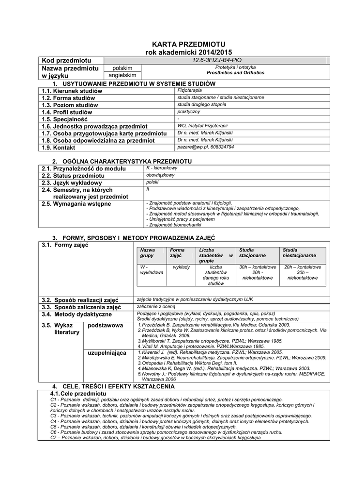 KARTA PRZEDMIOTU rok akademicki 2014/2015 12.6-3FIZJ-B4-PiO Protetyka i ortotyka polskim Prosthetics and Orthotics angielskim 1. USYTUOWANIE PRZEDMIOTU W SYSTEMIE STUDIÓW Fizjoterapia 1.1. Kierunek studiów studia stacjonarne / studia niestacjonarne 1.2. Forma studiów studia drugiego stopnia 1.3. Poziom studiów praktyczny 1.4. Profil studiów 1.5. Specjalność WO, Instytut Fizjoterapii 1.6. Jednostka prowadząca przedmiot Dr n. med. Marek Kiljański 1.7. Osoba przygotowująca kartę przedmiotu Dr n. med. Marek Kiljański 1.8. Osoba odpowiedzialna za przedmiot [email protected], 608324794 1.9. Kontakt Kod przedmiotu Nazwa przedmiotu w języku 2. OGÓLNA CHARAKTERYSTYKA PRZEDMIOTU K - kierunkowy 2.1. Przynależność do modułu obowiązkowy 2.2. Status przedmiotu polski 2.3. Język wykładowy II 2.4. Semestry, na których realizowany jest przedmiot - Znajomość podstaw anatomii i fizjologii, 2.5. Wymagania wstępne - Podstawowe wiadomości z kinezyterapii i zaopatrzenia ortopedycznego, - Znajomość metod stosowanych w fizjoterapii klinicznej w ortopedii i traumatologii, - Umiejętność pracy z pacjentem - Znajomość biomechaniki 3. FORMY, SPOSOBY I METODY PROWADZENIA ZAJĘĆ 3.1. Formy zajęć Nazwa grupy Wwykładowa 3.2. Sposób realizacji zajęć 3.3. Sposób zaliczenia zajęć 3.4. Metody dydaktyczne 3.5. Wykaz literatury podstawowa uzupełniająca Forma zajęć wykłady Liczba studentów w grupie liczba studentów danego roku studiów Studia stacjonarne 30h – kontaktowe 20h niekontaktowe Studia niestacjonarne 20h – kontaktowe 30h – niekontaktowe zajęcia tradycyjne w pomieszczeniu dydaktycznym UJK zaliczenie z oceną Podające i poglądowe (wykład, dyskusja, pogadanka, opis, pokaz) Środki dydaktyczne (slajdy, ryciny, sprzęt audiowizualny, pomoce techniczne) 1. Przeździak B. Zaopatrzenie rehabilitacyjne.Via Medica; Gdańska 2003. 2. Przeździak B, Nyka W. Zastosowanie kliniczne protez, ortoz i środków pomocniczych. Via Medica; Gdańsk 2008. 3. Myśliborski T. Zaopatrzenie ortopedyczne. PZWL; Warszawa 1985. 4. Vitali M. Amputacje i protezowanie. PZWLWarszawa 1985. 1. Kiwerski J. (red). Rehabilitacja medyczna. PZWL; Warszawa 2005. 2. Mikołajewska E. Neurorehabilitacja. Zaopatrzenie ortopedyczne. PZWL; Warszawa 2009. 3. Ortopedia i Rehabilitacja Wiktora Degi, tom II. 4. Milanowska K, Dega W. (red.). Rehabilitacja medyczna. PZWL; Warszawa 2003. 5. Nowotny J.: Podstawy kliniczne fizjoterapii w dysfunkcjach na-rządu ruchu. MEDIPAGE. Warszawa 2006 4. CELE, TREŚCI I EFEKTY KSZTAŁCENIA 4.1. Cele przedmiotu C1 - Poznanie definicji, podziału oraz ogólnych zasad doboru i refundacji ortez, protez i sprzętu pomocniczego. C2 - Poznanie wskazań, doboru, działania i budowy przedmiotów zaopatrzenia ortopedycznego kręgosłupa, kończyn górnych i kończyn dolnych w chorobach i następstwach urazów narządu ruchu. C3 - Poznanie wskazań, technik, poziomów amputacji kończyn górnych i dolnych oraz zasad postępowania usprawniającego. C4 - Poznanie wskazań, doboru, działania i budowy protez kończyn górnych, dolnych oraz innych elementów protetycznych. C5 - Poznanie wskazań, doboru, działania i konstrukcji obuwia i wkładek ortopedycznych. C6 - Poznanie budowy i zasad stosowania sprzętu pomocniczego stosowanego w dysfunkcjach narządu ruchu. C7 – Poznanie wskazań, doboru, działania i budowy gorsetów w bocznych skrzywieniach kręgosłupa 4.2. Treści programowe Lp. Tematy wykładów W1 W2 Rola przedmiotów ortopedycznych w rehabilitacji. Przedmioty ortopedyczne jako pomocniczy środek fizjoterapii. Zasady doboru przedmiotów ortopedycznych. Protezy, ortozy – zasady działania, zastosowanie, dobór. Przygotowanie amputowanego do zaprotezowania. Nauka właściwego posługiwania się protezami i ortozami (walor fizjoterapeutyczny działania). Zaburzenia i utrudnienia wynikające z nieprawidłowego posługiwania się protezą lub ortozą. Zaopatrzenie ortopedyczne – zasady refundacji, dystrybucja, odpłatność. Bariery architektoniczne dla osób niepełnosprawnych. Razem W3 W4 W5 Liczba godzin stacjonarne niestacjonarne 6 4 6 4 6 4 6 4 6 4 30 20 kod 4.3. Przedmiotowe efekty kształcenia (mała, średnia, duża liczba efektów) Student, który zaliczył przedmiot Stopień nasycenia efektu przedmiotowe go 1 [+] [++] [+++] Kod dla kierunku w zakresie WIEDZY: W01 Zna zasady budowy i działania sprzętu ortopedycznego FIZJ2P_W35 posiada wiedzę z zakresu przygotowania pacjentów po amputacjach do zaprotezowania oraz na temat doboru przedmiotów ortopedycznych stosownie do rodzaju dysfunkcji i potrzeb osoby rehabilitowanej FIZJ2P_U08 potrafi dokonać właściwego doboru przedmiotów ortopedycznych stosownie do rodzaju dysfunkcji i potrzeb pacjenta potrafi analizować jakość wykonywanych zabiegów terapeutycznych, identyfikować błędy i zaniedbania w praktyce +++ w zakresie UMIEJĘTNOŚCI: U01 Umie dopasować sprzęt ortopedyczny w różnych dysfunkcjach U02 Umie przeprowadzić fizjoterapię z zastosowaniem sprzętu ortopedycznego w zakresie KOMPETENCJI SPOŁECZNYCH: K01 Potrafi wykorzystać właściwości sprzętu dla konkretnego pacjenta w jego środowisku K02 Potrafi nauczyć pacjenta korzystania z dóbr kultury i możliwości zarobkowania +++ FIZJ2P_U32 + FIZJ2P_K06 ++ FIZJ2P_K09 + 4.4. Kryteria oceny osiągniętych efektów kształcenia na ocenę 3 na ocenę 3,5 na ocenę 4 Zna podstawowe pojęcia i definicje z zakresu protetyki i ortotyki Zna podstawowe pojęcia i definicje z zakresu protetyki i ortotyki Odniesienie do efektów kształcenia Zna podstawowe pojęcia i definicje z zakresu protetyki i ortotyki dla obszaru OM2_W10 OM2_U02 OM2_U07 przestrzega właściwych relacji OM2_K03 z pacjentem, z jego rodziną, z najbliższym otoczeniem i społeczeństwem w oparciu o zasady etyczne w decyzjach i działaniach OM2_K04 potrafi samodzielnie i odpowiedzialnie podejmować decyzje właściwie organizując pracę własną oraz wykonywać powierzone mu zadania na ocen