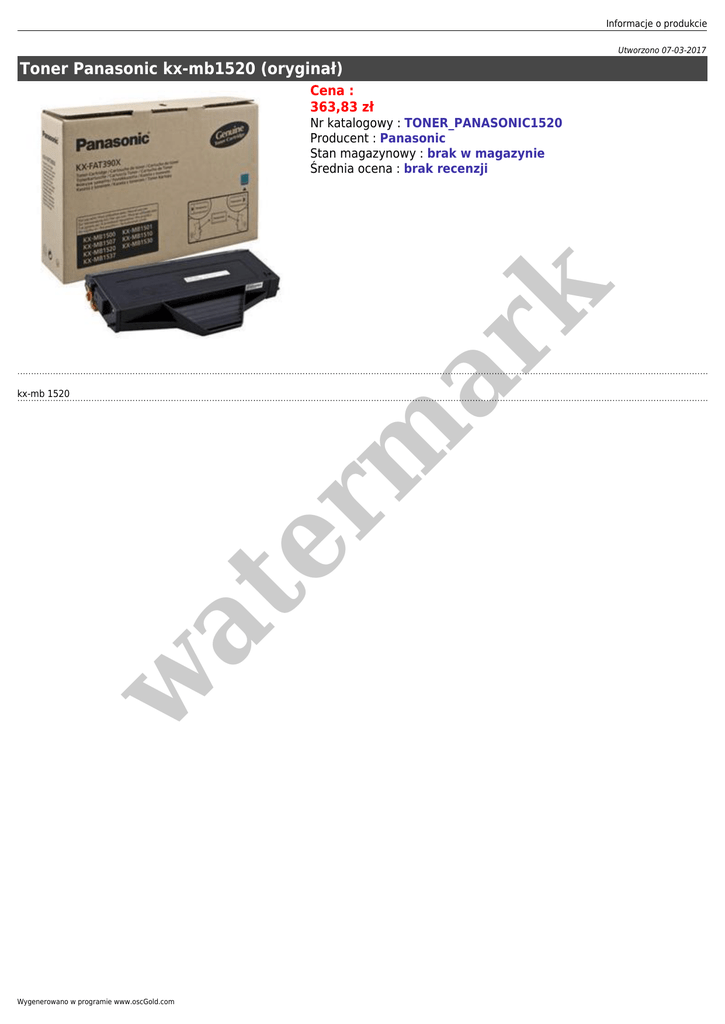 Informacje o produkcie Utworzono 07-03-2017 Toner Panasonic kx-mb1520 (oryginał) Cena : 363,83 zł er m ar k Nr katalogowy : TONER_PANASONIC1520 Producent : Panasonic Stan magazynowy : brak w magazynie Średnia ocena : brak recenzji w at kx-mb 1520 Wygenerowano w programie www.oscGold.com