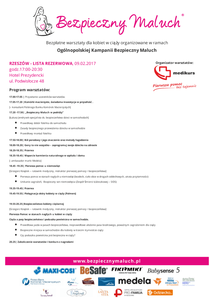 Bezpłatne warsztaty dla kobiet w ciąży organizowane w ramach Ogólnopolskiej Kampanii Bezpieczny Maluch RZESZÓW - LISTA REZERWOWA, 09.02.2017 godz.17:00-20:30 Hotel Prezydencki ul. Podwisłocze 48 Program warsztatów: 17.00-17.05 | Przywitanie uczestników warsztatów. 17.05-17.20 |Komórki macierzyste, świadoma inwestycja w przyszłość . [– konsultant Polskiego Banku Komórek Macierzystych] 17.20 -17.50| „Bezpieczny Maluch w podróży” [Łukasz Jendrysek-specjalista ds. bezpieczeństwa dzieci w samochodach] Prawidłowy dobór fotelika do samochodu Zasady bezpiecznego przewożenia dziecka w samochodzie Prawidłowy montaż fotelika 17.50-18.00| Ból porodowy i jego znaczenie oraz metody łagodzenia 18.00-18.20| Geny to nie wszystko – zaprogramuj swoje dziecko na zdrowie 18.20-18.35| Przerwa 18.35-18.45| Wsparcie karmienia naturalnego w szpitalu i domu [- ambasador marki Medela] 18.45 -19.35| Pierwsza pomoc u niemowląt [Grzegorz Książek – ratownik medyczny, instruktor pierwszej pomocy i bezpieczeństwa] Pierwsza pomoc w stanach nagłych u niemowląt (bezdech, ciało obce w drogach oddechowych, utrata przytomności) Unikanie zagrożeń, Bezpieczny sen niemowlęcia (Zespół Śmierci Łóżeczkowej – SIDS) 19.35-19.45| Przerwa 19.45-19.55| Pielęgnacja skóry kobiety w ciąży [Palmers] 19.55-20.25|Bezpieczeństwo kobiety ciężarnej [Grzegorz Książek – ratownik medyczny, instruktor pierwszej pomocy i bezpieczeństwa] Pierwsza Pomoc w stanach nagłych u kobiet w ciąży Ciąża a pasy bezpieczeństwa i poduszka powietrzna w samochodzie. Prawidłowa jazda w pasach bezpieczeństwa, nieprawidłowe ułożenie pasa biodrowego, poważnym zagrożeniem dla ciąży Bezpieczne miejsca w samochodzie dla kobiety w trzecim trymestrze ciąży Czy poduszka powietrzna jest bezpieczna w ciąży? 20.25| Zakończenie warsztatów i konkurs z nagrodami www. be zpie c zn ym alu c h . pl Organizator warsztatów: