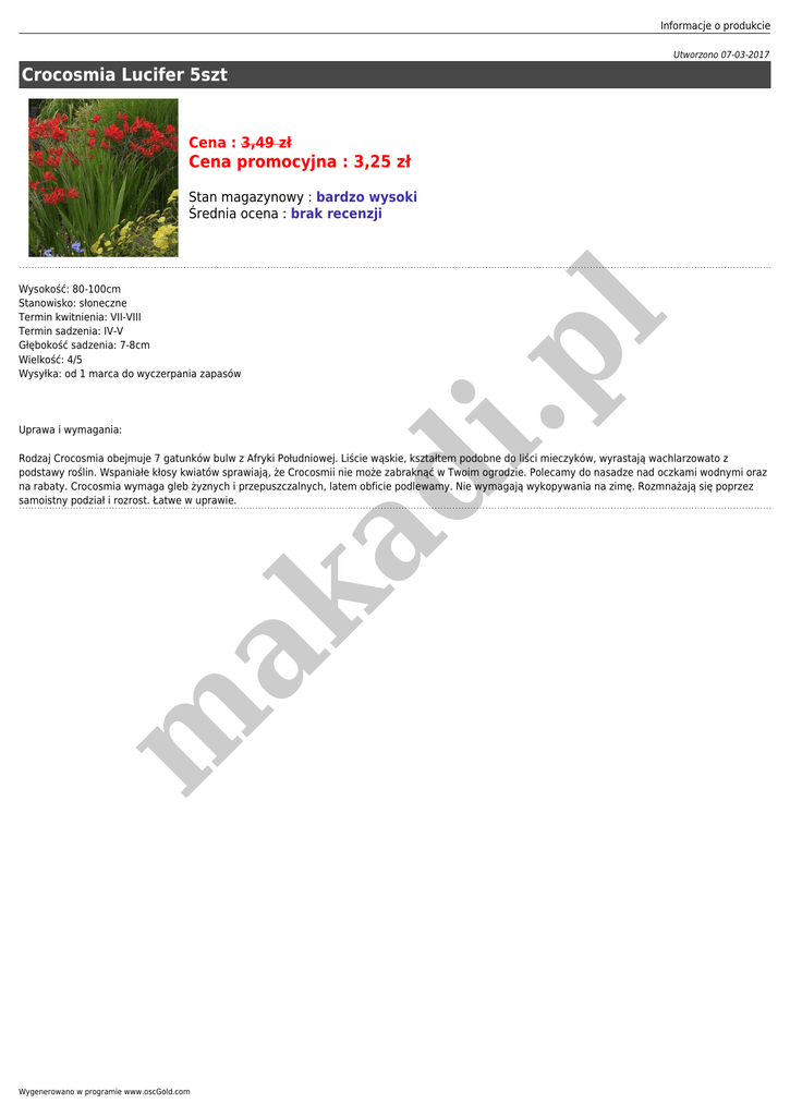 Informacje o produkcie Utworzono 07-03-2017 Crocosmia Lucifer 5szt Cena : 3,49 zł Cena promocyjna : 3,25 zł Stan magazynowy : bardzo wysoki Średnia ocena : brak recenzji i.p l Wysokość: 80-100cm Stanowisko: słoneczne Termin kwitnienia: VII-VIII Termin sadzenia: IV-V Głębokość sadzenia: 7-8cm Wielkość: 4/5 Wysyłka: od 1 marca do wyczerpania zapasów Uprawa i wymagania: m ak ad Rodzaj Crocosmia obejmuje 7 gatunków bulw z Afryki Południowej. Liście wąskie, kształtem podobne do liści mieczyków, wyrastają wachlarzowato z podstawy roślin. Wspaniałe kłosy kwiatów sprawiają, że Crocosmii nie może zabraknąć w Twoim ogrodzie. Polecamy do nasadze nad oczkami wodnymi oraz na rabaty. Crocosmia wymaga gleb żyznych i przepuszczalnych, latem obficie podlewamy. Nie wymagają wykopywania na zimę. Rozmnażają się poprzez samoistny podział i rozrost. Łatwe w uprawie. Wygenerowano w programie www.oscGold.com