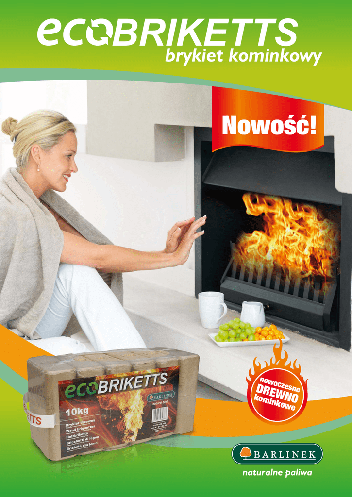 BRIKETTS brykiet kominkowy Nowość! nowo czes ne DREW komi NO nko we P rojektując nasz upragniony dom staramy się, by był on elegancki, reprezentacyjny, a zarazem praktyczny i przytulny. Niezbędnym elementem wyposażenia takiego domowego ogniska jest kominek. Do palenia w tym wyjątkowym miejscu naszego domu najczęściej używane jest drewno, którego jakości nigdy nie jesteśmy pewni, co bezpośrednio przekłada się na nasz komfort użytkowania kominka. Dostępne drewno kominkowe, to los na loterii i raz jesteśmy zadowoleni z jego jakości, a innym razem niestety nie, jak to z produktami pochodzącymi wprost z natury. Dlatego też, aby pogodzić oczekiwania naszych Klientów, które łączą ze sobą naturę i komfort użytkowania kominka powstał : BRIKETTS nowo czes ne DREW komi NO nko we To nic innego jak naturalne drewno w formie kostki, profesjonalnie przygotowane do spalania w domowych kominkach. Zasady, którymi kierowaliśmy się tworząc dla Państwa ten produkt, to: 1) 1 2) 2 Komfort użytkowania: W porównaniu do drewna, nie trzeba go sezonować przez parę lat, rąbać oraz magazynować na ogromnej powierzchni; Brykiet nie brudzi rąk, nie kruszy się; Brykiet jest bardzo łatwy w rozpalaniu, spalanie następuje efektywniej i wolniej niż drewna; Nie dymi podczas spalania, nie powoduje smolenia szyby kominka oraz osadzania się sadzy i wilgoci w przewodzie kominowym, co oznacza mniejsze koszty związane z czyszczeniem instalacji przez kominiarza, oraz własnym czasem jaki poświęcamy na utrzymanie kominka i jego otoczenia w czystości; Brykiet nie zawiera zanieczyszczeń w postaci kory czy piasku, co powoduje, że ze spalając go mamy mniej popiołu (około 0,5% masy przed spaleniem) niż spalając drewno; Jest łatwy w transporcie i przenoszeniu. Gwarancja jakości: Marka Barlinek synonimem powtarzalnej, gwarantowanej i najwyższej jakości wszystkich swoich produktów; Naturalne surowce do produkcji oparte na liściastych gatunkach drewna (buk i dąb); Produkcja oparta na najlepszej dostępnej technologii, przez co brykiet jest mocno sprasowany i nie rozpada się w rękach; EcoBriketts Barlinka jest dostępny w autoryzowanej sieci sprzedaży na terenie całego kraju oraz na stronie www.pelet.com.pl www.pelet.com.pl