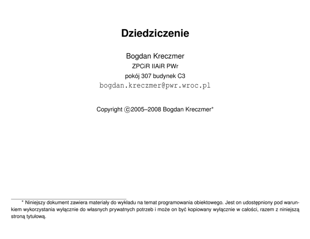 Dziedziczenie Bogdan Kreczmer ZPCiR IIAiR PWr pokój 307 budynek C3 [email protected] c 2005–2008 Bogdan Kreczmer? Copyright ? Niniejszy dokument zawiera materiały do wykładu na temat programowania obiektowego. Jest on udostepniony ˛ pod warun- kiem wykorzystania wyłacznie ˛ do własnych prywatnych potrzeb i może on być kopiowany wyłacznie ˛ w całości, razem z niniejsza˛ strona˛ tytułowa. ˛ Uszczegółowianie Figura geometryczna cechy: % Okrag ˛ cechy: • pole • obwód Kwadrat • jest figura˛ cechy: • jest figura˛ geometryczna˛ geometryczna˛ – pole – obwód – pole – obwód • promień c 2005–2008 Bogdan Kreczmer Copyright • długość boku Dziedziczenie 1 Zapis w UML Diagram klas w jezyku ˛ UML odzwierciedlajacy ˛ fakt dziedziczenia ˛ i Kwadrat. klasy Figura Geometryczna przez klasy Okrag c 2005–2008 Bogdan Kreczmer Copyright Dziedziczenie 2 Zapis w C++ struct Figura Geometryczna { // . . . . . . . . . . . . . . . . . . . . . . . . . . . . . . . . . . . . . . . . double pole; double obwod; }; // . . . . . . . . . . . . . . . . . . . . . . . . . . . . . . . . . . . . . . . . . . . . . . . . . . . . . . . . . . . . . . . . . . . . . . . struct Okrag: Figura Geometryczna { // . . . . . . . . . . . . . . . . . . . . . . . . . . . . . . . . . double promien; }; // . . . . . . . . . . . . . . . . . . . . . . . . . . . . . . . . . . . . . . . . . . . . . . . . . . . . . . . . . . . . . . . . . . . . . . . struct Kwadrat: Figura Geometryczna { // . . . . . . . . . . . . . . . . . . . . . . . . . . . . . . double dlugosc boku; }; // . . . . . . . . . . . . . . . . . . . . . . . . . . . . . . . . . . . . . . . . . . . . . . . . . . . . . . . . . . . . . . . . . . . . . . . c 2005–2008 Bogdan Kreczmer Copyright Dziedziczenie 3 Typy dziedziczenia Tryby dziedziczenia: • • • publiczny chroniony prywatny −→ −→ −→ class Klasa Pochodna: public Klasa Bazowa { ... }; class Klasa Pochodna: protected Klasa Bazowa { ... }; class Klasa Pochodna: private Klasa Bazowa { ... }; Klasa Pochodna: . . . Klasa Bazowa −→ class Klasa Pochodna: Klasa Bazowa { ... }; −→ class Klasa Pochodna: private Klasa Bazowa { ... }; struct Klasa Pochodna: Klasa Bazowa { ... }; −→ struct Klasa Pochodna: public Klasa Bazowa { ... }; c 2005–2008 Bogdan Kreczmer Copyright Dziedziczenie 4 Dziedziczenie w trybie publicznym Tryb dziedziczenia: • publiczny −→ class Klasa Pochodna: public Klasa Bazowa { ... }; Klasa Pochodna: public Klasa Bazowa −→ c 2005–2008 Bogdan Kreczmer Copyright Dziedziczenie 5 Dziedziczenie w trybie publicznym class KlasaBazowa { // . . . . . . . . . . . . . . . . . . . . . . . . . . . . . . . . . . . . . . . . . . . . . . . . . . int PolePryw KBaz; protected : int PoleChro KBaz; public : int PolePubl KBaz; }; //. . . . . . . . . . . . . . . . . . . . . . . . . . . . . . . . . . . . . . . . . . . . . . . . . . . . . . . . . . . . . . . . . . . . . . . class KlasaPochodna: public KlasaBazowa { // . . . . . . . . . . . . . . . . . . . . . . . public : void OdwolanieDoPol( ); }; //. . . . . . . . . . . . . . . . . . . . . . . . . . . . . . . . . . . . . . . . . . . . . . . . . . . . . . . . . . . . . . . . . . . . . . . void KlasaPochodna::OdwolanieDoPol( ) { hhhh h( hhh (((( ( h( hhhh = 0; ( h( hh ((( PolePubl KBaz = PoleChro KBaz =((PolePryw KBaz ((( h (h } Pola i metody prywatne klasy bazowej sa˛ niedostepne ˛ na poziomie metod klasy pochodnej. Dostepne ˛ sa˛ natomiast pola i metody znajdujace ˛ sie˛ w sekcji chronionej i publicznej. Własność ta nie zależy od sposobu dziedziczenia klasy bazowej. c 2005–2008 Bogdan Kreczmer Copyright Dziedziczenie 6 Dziedziczenie w trybie publicznym class KlasaBazowa { // . . . . . . . . . . . . . . . . . . . . . . . . . . . . . . . . . . . . int PolePryw KBaz; protected : int PoleChro KBaz; public : int PolePubl KBaz; }; // . . . . . . . . . . . . . . . . . . . . . . . . . . . . . . . . . . . . . . . . . . . . . . . . . . . . . . . . . class KlasaPochodna: public KlasaBazowa { . . . } // . . . . . int main( ) { KlasaBazowa hhh ObBa; int main( ) { KlasaPochodna hh h (( hh ((( ObBa. (PolePryw = 1; ((( hhhKBaz h hhhh ( ( h ((( KBaz = 2; ObBa. (PoleChro ((( hhh h ObBa. PolePubl KBaz = 3; } ObPo; (( h( h(( KBaz = 1; ObPo. ( PolePryw ((( hhh h hhhh ( ( h(( KBaz = 2; ( ObPo. ( PoleChro ((( hhh h ObPo. PolePubl KBaz = 3; } W przypadku dziedziczenia w trybie publicznym pola i metody klasy bazowej, które sa˛ niedostepne ˛ poza ta˛ klasa, ˛ sa˛ również niedostepne ˛ w przypadku obiektu klasy pochodnej. c 2005–2008 Bogdan Kreczmer Copyright Dziedziczenie 7 Dziedziczenie w trybie chronionym Tryb dziedziczenia: • chroniony −→ class Klasa Pochodna: protected Klasa Bazowa { ... }; Klasa Pochodna: protected Klasa Bazowa −→ c 2005–2008 Bogdan Kreczmer Copyright Dziedziczenie 8 Dziedziczenie w trybie chronionym class KlasaBazowa { // . . . . . . . . . . . . . . . . . . . . . . . . . . . . . . . . . . . . . . . . . . . . . . . . . . int PolePryw KBaz; protected : int PoleChro KBaz; public : int PolePubl KBaz; }; //. . . . . . . . . . . . . . . . . . . . . . . . . . . . . . . . . . . . . . . . . . . . . . . . . . . . . . . . . . . . . . . . . . . . . . . class KlasaPochodna: protected KlasaBazowa { // . . . . . . . . . . . . . . . . . . . . public : void OdwolanieDoPol( ); }; //. . . . . . . . . . . . . . . . . . . . . . . . . . . . . . . . . . . . . . . . . . . . . . . . . . . . . . . . . . . . . . . . . . . . . . . void KlasaPochodna::OdwolanieDoPol( ) { hhhh h( hhh (((( ( h( hhhh = 0; ( h( hh ((( PolePubl KBaz = PoleChro KBaz =((PolePryw KBaz ((( h (h } Dziedziczenie w trybie chronionym nie ogranicza dostepności ˛ pól i metod klasy bazowej na poziomie metod klasy pochodnej. Nie powoduje też, że pola i metody prywatne mogłyby stać sie˛ dostepne ˛ dla klasy pochodnej. c 2005–2008 Bogdan Kreczmer Copyright Dziedziczenie 9 Dziedziczenie w trybie chronionym class KlasaBaz