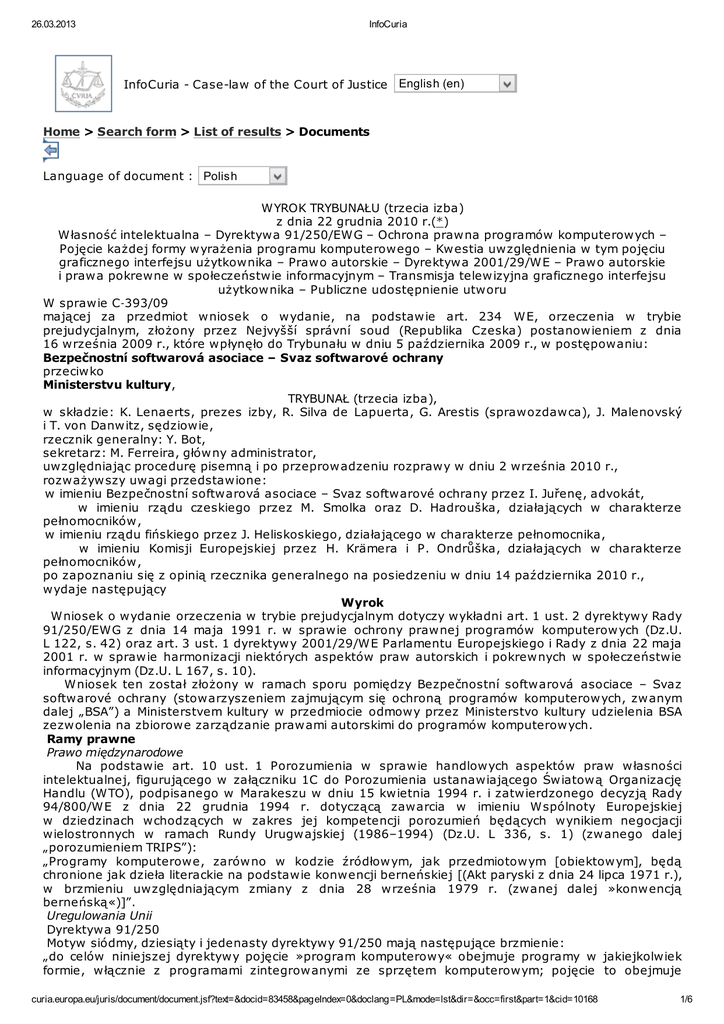 26.03.2013 InfoCuria InfoCuria - Case-law of the Court of Justice English (en) Home > Search form > List of results > Documents Language of document : Polish – – – – WYROK TRYBUNAŁU (trzecia izba) z dnia 22 grudnia 2010 r.(*) Własność intelektualna – Dyrektywa 91/250/EWG – Ochrona prawna programów komputerowych – Pojęcie każdej formy wyrażenia programu komputerowego – Kwestia uwzględnienia w tym pojęciu graficznego interfejsu użytkownika – Prawo autorskie – Dyrektywa 2001/29/WE – Prawo autorskie i prawa pokrewne w społeczeństwie informacyjnym – Transmisja telewizyjna graficznego interfejsu użytkownika – Publiczne udostępnienie utworu W sprawie C‑393/09 mającej za przedmiot wniosek o wydanie, na podstawie art. 234 WE, orzeczenia w trybie prejudycjalnym, złożony przez Nejvyšší správní soud (Republika Czeska) postanowieniem z dnia 16 września 2009 r., które wpłynęło do Trybunału w dniu 5 października 2009 r., w postępowaniu: Bezpečnostní softwarová asociace – Svaz softwarové ochrany przeciwko Ministerstvu kultury, TRYBUNAŁ (trzecia izba), w składzie: K. Lenaerts, prezes izby, R. Silva de Lapuerta, G. Arestis (sprawozdawca), J. Malenovský i T. von Danwitz, sędziowie, rzecznik generalny: Y. Bot, sekretarz: M. Ferreira, główny administrator, uwzględniając procedurę pisemną i po przeprowadzeniu rozprawy w dniu 2 września 2010 r., rozważywszy uwagi przedstawione: w imieniu Bezpečnostní softwarová asociace – Svaz softwarové ochrany przez I. Juřenę, advokát, w imieniu rządu czeskiego przez M. Smolka oraz D. Hadrouška, działających w charakterze pełnomocników, w imieniu rządu fińskiego przez J. Heliskoskiego, działającego w charakterze pełnomocnika, w imieniu Komisji Europejskiej przez H. Krämera i P. Ondrůška, działających w charakterze pełnomocników, po zapoznaniu się z opinią rzecznika generalnego na posiedzeniu w dniu 14 października 2010 r., wydaje następujący Wyrok Wniosek o wydanie orzeczenia w trybie prejudycjalnym dotyczy wykładni art. 1 ust. 2 dyrektywy Rady 91/250/EWG z dnia 14 maja 1991 r. w sprawie ochrony prawnej programów komputerowych (Dz.U. L 122, s. 42) oraz art. 3 ust. 1 dyrektywy 2001/29/WE Parlamentu Europejskiego i Rady z dnia 22 maja 2001 r. w sprawie harmonizacji niektórych aspektów praw autorskich i pokrewnych w społeczeństwie informacyjnym (Dz.U. L 167, s. 10). Wniosek ten został złożony w ramach sporu pomiędzy Bezpečnostní softwarová asociace – Svaz softwarové ochrany (stowarzyszeniem zajmującym się ochroną programów komputerowych, zwanym dalej „BSA”) a Ministerstvem kultury w przedmiocie odmowy przez Ministerstvo kultury udzielenia BSA zezwolenia na zbiorowe zarządzanie prawami autorskimi do programów komputerowych. Ramy prawne Prawo międzynarodowe Na podstawie art. 10 ust. 1 Porozumienia w sprawie handlowych aspektów praw własności intelektualnej, figurującego w załączniku 1C do Porozumienia ustanawiającego Światową Organizację Handlu (WTO), podpisanego w Marakeszu w dniu 15 kwietnia 1994 r. i zatwierdzonego decyzją Rady 94/800/WE z dnia 22 grudnia 1994 r. dotyczącą zawarcia w imieniu Wspólnoty Europejskiej w dziedzinach wchodzących w zakres jej kompetencji porozumień będących wynikiem negocjacji wielostronnych w ramach Rundy Urugwajskiej (1986–1994) (Dz.U. L 336, s. 1) (zwanego dalej „porozumieniem TRIPS”): „Programy komputerowe, zarówno w kodzie źródłowym, jak przedmiotowym [obiektowym], będą chronione jak dzieła literackie na podstawie konwencji berneńskiej [(Akt paryski z dnia 24 lipca 1971 r.), w brzmieniu uwzględniającym zmiany z dnia 28 września 1979 r. (zwanej dalej »konwencją berneńską«)]”. Uregulowania Unii Dyrektywa 91/250 Motyw siódmy, dziesiąty i jedenasty dyrektywy 91/250 mają następujące brzmienie: „do celów niniejszej dyrektywy pojęcie »program komputerowy« obejmuje programy w jakiejkolwiek formie, włącznie z programami zintegrowanymi ze sprzętem komputerowym; pojęcie to obejmuje curia.europa.eu/juris/document/document.jsf?text=&docid=83458&pageIndex=0&doclang=PL&mode=lst&dir=&occ=first&part=1&cid=10168 1/6 26.03.2013 InfoCuria również przygotowawcze prace projektowe prowadzące do rozwoju programu komputerowego, z zastrzeżeniem, że charakter prac przygotowawczych jest taki, że program komputerowy może korzystać z nich na późniejszym etapie; […] rolą programu komputerowego jest wejście w kontakt i wspólne funkcjonowanie z innymi częściami składowymi systemu komputerowego i użytkownikami; w tym celu logiczne i, w miarę potrzeb, fizyczne wzajemne połączenia i wzajemne oddziaływanie są wymagane, aby pozwolić wszystkim elementom oprogramowania i sprzętu komputerowego funkcjonować z innym oprogramowaniem, sprzętem komputerowym i użytkownikami we wszelkich formach działania do jakich są przeznaczone; części programu umożliwiające takie wzajemne połączenia i wzajemne oddziaływanie między elementami oprogramowania i sprzętu komputerowego są ogólnie znane pod nazwą »interfejsów«”. Artykuł 1 dyrektywy 91/250 stanowi: „1. Zgodnie z przepisami niniejszej dyrektywy państwa członkowskie chronią prawem autorskim programy komputerowe w taki sposób jak dzieła literackie w rozumieniu Konwencji berneńskiej o ochronie dzieł literackich i artystycznych. Do celów niniejszej dyrektywy termin »programy komputerowe« obejmuje ich przygotowawczy materiał projektowy. 2. Zgodnie z niniejszą dyrektywą ochronie podlega każda forma wyrażenia programu komputerowego. Koncepcje i zasady, na których opierają się wszystkie elementy programu komputerowego, włącznie z tymi, na których opierają się ich interfejsy, nie podlegają ochronie prawa autorskiego na podstawie niniejszej dyrektywy. 3. Program komputerowy podlega ochronie, jeżeli jest oryginalny w takim rozumieniu, że jest własną intelektualną twórczością jego autor