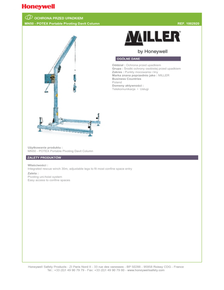 MN50 - POTEX Portable Pivoting Davit Column REF. 1002920 OGÓLNE DANE Oddział : Ochrona przed upadkiem Grupa : Środki ochrony osobistej przed upadkiem Zakres : Punkty mocowania i liny Marka znana poprzednio jako : MILLER Business Countries Poland Domeny aktywności : Telekomunikacja • Usługi Użytkowanie produktu : MN50 - POTEX Portable Pivoting Davit Column ZALETY PRODUKTÓW Właściwości : Integrated rescue winch 30m, adjustable legs to fit most confine space entry Zaleta : Pivoting uni-hoist system Easy access to confine spaces OPIS TECHNICZNY Wymiary Wysokość : Fully extended: Maximum outer height 2.25m Height below carabiner: 2.1m. Fully retracted: Minimum outer height: 2.05m Height below carabiner: 1.9m. Długość : Fully extended: 1.3m Fully retracted: 1.3m. Szerokość : Fully extended: Maximum outer width: 1.3m Width between feet: 1.11m. Fully retracted: Minimum outer width: 1m Width between feet: 0.81m. Jakość pracy Maks. obciążenie robocze : 165 kg Maks. bezpieczne obciążenie robocze : > 10 KN Waga (kg) : 40 kg Temperatura robocza : -30°C to +50°C Dane dodatkowe : Body : Aluminium Screwjack : Galvanised steel Winch : Galvanised steel sheet Wire : 30 meters - Ø4.8mm galvanised steel Reach of lifting wire : 395mm INFORMACJE DODATKOWE Numer instrukcji użytkownika : 90005150 Kod EAN : 7312559871899 CERTYFIKATY I ZGODNOŚĆ Dyrektywy Unii Europejskiej : 89/686/EEC Kategoria UE Środki ochrony osobistej* : Klasa 3 Normy : EN795(b) Zapewnienie jakości : ISO 9001 / 2000 Numer certyfikatu UE : 0333 AFAQ/CTH Numer atestu UE : 0082/042/160/11/98/0308 EXT N? 02/11/98 Laboratorium : APAVE Lyonnaise *PPE : Środki ochrony osobistej (ŚOO) DEKLARACJA ZGODNOŚCI UE Producent lub jego prawny przedstawiciel/dostawca z siedzibą na terenie Unii Europejskiej: Miller by Sperian Stwierdza, że opisane tutaj środki ochrony osobistej są zgodne z postaniowieniami Dyrektywy 89/686/CEE Rady Europy: Designation: MN50 - POTEX Portable Pivoting Davit Column Reference: 1002920 Standard(s): EN795(b) ŚOO podlega powyższemu typowi atestu UE: 0082/042/160/11/98/0308 EXT N? 02/11/98 Delivered by: APAVE Lyonnaise 177 route de Saint-Bel BP 3 69811 TASSIN CEDEX France Sporządzono w Vierzon, na 08/02/2006 przez: Yves Depin Oddział: Ochrona przed upadkiem "CE" Declaration The manufacturer : SPERIAN FALL PROTECTION FRANCE 35/37 rue de la Bidauderie 18100 VIERZON Declare that the next PPE described hereafter : standard 1002920 SAP reference Old reference 79MN50 EN795 item DALLOZ SAFETY #: 9879MN50 PIVOTING UNI-HOIST SYSTEM EC type examination : 0082/042/160/11/98/0308 ext. EXT N°02/11/98 Is in conformity with the provisions of Council Directive 89/686/EEC and is the subject of the above EC type examination certificate delivered by: APAVE BP 193 13322 MARSEILLE CEDEX 16 And is subject to the procedure set out in Article 11B of Directive 89/686/EEC under the supervision of the notified body : N° 0333 AFAQ/AFNOR CERTIFICATION 116 Avenue Aristide Briand 92224 BAGNEUX CEDEX Fait à Vierzon le, Par : 01/01/2003 T.juillet Fonction: Plant Manager Signature: