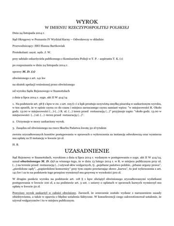 WYROK W IMIENIU RZECZYPOSPOLITEJ POLSKIEJ Dnia 24 listopada 2014 r. Sąd Okręgowy w Poznaniu IV Wydział Karny – Odwoławczy w składzie: Przewodniczący: SSO Hanna Bartkowiak Protokolant: asyst. sędz. J. W. przy udziale oskarżyciela publicznego z Komisariatu Policji w T. P. - aspiranta T. K. (1) po rozpoznaniu w dniu 24 listopada 2014 r. sprawy M. D. (1) obwinionego z art. 141 kw na skutek apelacji wniesionej przez obwinionego od wyroku Sądu Rejonowego w Szamotułach z dnia 9 lipca 2014 r. sygn. akt II W 414/14 1. Na podstawie art. 38 § 1 kpw w zw. z art. 105 § 1 i 2 kpk prostuje oczywistą omyłkę pisarską w zaskarżonym wyroku, w ten sposób, że w opisie czynu co do czasu i miejsca zarzucanego czynu zamiast wpisu: ”w miejscowości R. Około godz. 13:00 w miejscowości (...)-(...) R. ul. (...) teren przed restauracją (...)” przyjmuje zapis: ”około godz. 13.00 w miejscowości (...) ul. (...) -teren przed restauracją (...)”. 2. Utrzymuje w mocy zaskarżony wyrok. 3. Zasądza od obwinionego na rzecz Skarbu Państwa kwotę 50 zł tytułem zwrotu zryczałtowanych kosztów postępowania w sprawach o wykroczenia za instancję odwoławczą oraz wymierza mu opłatę za II instancję w kwocie 50 zł. H. B. UZASADNIENIE Sąd Rejonowy w Szamotułach, wyrokiem z dnia 9 lipca 2014 r. wydanym w postępowaniu o sygn. akt II W 414/14, uznał obwinionego M. D. (1) za winnego tego, że w dniu 13 lutego 2014 r. w R. w miejscu publicznym przy ul. (...) na terenie przed restauracją (...) używał słów wulgarnych, tj. „pojebane państwo polskie, „jebane organy prawa”, „pierdolone sądy”, „popierdoleni komornicy” przy tym często powtarzając słowo „kurwa”, to jest wykroczenia z art. 141 kw i za to na podstawie tego przepisu wymierzył mu grzywnę w wysokości 500 zł. W drugim punkcie wyroku na podstawie art. 118 § 1 kpw obciążył obwinionego zryczałtowanymi wydatkami postępowania w kwocie 100 zł, a na podstawie art. 3 ust. 1 ustawy o opłatach w sprawach karnych wymierzył mu opłatę w kwocie 50 zł. Powyższy wyrok zaskarżył w całości obwiniony. Zarzucił, że orzeczenie zostało wydane z naruszeniem zasady obiektywizmu, a także w oparciu o błędne ustalenia faktyczne. W konsekwencji czego zakwestionował ustalenie, że używał wulgaryzmów i to w miejscu publicznym. W oparciu o treść wniesionego środka odwoławczego uznać należało, że obwiniony wnosił o zmianę zaskarżonego wyroku i uniewinnienie. Sąd Okręgowy zważył, co następuje: Apelacja obwinionego była bezzasadna i z tego względu nie zasługiwała ona na uwzględnienie. Była jedynie o tyle celowa, iż w ramach przeprowadzonej kontroli instancyjnej zapadłego wyroku, dokonana została korekta opisu przypisanego sprawcy czynu. W pierwszej kolejności należało zatem stwierdzić, że w zaskarżonym wyroku dopuszczono się pomyłki w opisie czasu i miejsca wykroczenia. Omyłka ta miała charakter oczywisty, gdyż polegała na wadliwym pod względem stylistycznym, sformułowaniu elementów opisu wykroczenia w postaci czasu i miejsca jego popełnienia. Sąd Rejonowy mało uważnie przepisał zarzut stawiany obwinionemu we wniosku o ukaranie i to spowodowało konieczność stosownego przeredagowania tej części orzeczenia. Zgodnie z art. 38 § 1 kpw w zw. z art. 105 § 1 i 2 kpk oczywiste omyłki pisarskie w orzeczeniu można sprostować w każdym czasie. Wobec tego Sąd odwoławczy uczynił to z urzędu w stosunku do wyroku Sądu I instancji. Odnośnie zaś twierdzeń apelującego, Sąd Okręgowy uznał je za nietrafne stwierdzając, że postępowanie odwoławcze nie potwierdziło zaprezentowanej w apelacji tezy jakoby postępowanie pierwszoinstancyjne i wydany w jego ramach wyrok były dotknięte wadami. W konsekwencji Sąd II instancji stanął na stanowisku, że brak było jakichkolwiek podstaw do podważenia prawidłowości zaskarżonego rozstrzygnięcia, zarówno w zakresie uznania sprawstwa jak i winy M. D. (1). Logiczną i przemyślaną okazała się także ocena prawna jego czynu. Za trafną i w pełni adekwatną należało także uznać wymierzoną mu za wykroczenie z art. 141 kw karę. U. przedstawione wyżej stanowisko, wskazać trzeba w pierwszym rzędzie, że apelujący nie wykazał, aby Sąd niższej instancji przejawiał w toku rozpoznania sprawy stronniczość i był negatywnie ustosunkowany do podsądnego. Lektura uzasadnienia wyroku, poparta analizą akt sprawy pozwala stwierdzić, że uwagi organu orzekającego odnośnie możliwości dokonania przez M. D. (1) spłaty swego długu w gotówce oraz odbioru zajętego samochodu, w tym stwierdzenie:„Gdyby zatem obwiniony respektował prawo i spłacał na czas swoje zadłużenie, nie dopuściłby do konieczności prowadzenia egzekucji komorniczej”, odnosiły się ściśle do przedstawionej przez obwinionego linii obrony. Linii zaprezentowanej także w apelacji, gdyż i ona oparta została na twierdzeniu, że obwiniony stał się ofiarą nieprawidłowości w funkcjonowaniu organów państwa, a zarzucone mu we wniosku o ukaranie zachowanie było jedynie adekwatną reakcją pokrzywdzonego obywatela, formą protestu. Zdaniem Sądu Okręgowego natomiast powyżej podanym stwierdzeniem oraz innymi je poprzedzającymi, Sąd I instancji zasadnie wywodził, że obwiniony M. D. (1) pomija (nie przyjmuje do wiadomości), iż zdarzenie, które miało miejsce przy ul. (...) w R., zostało de facto zainicjowane jego własnym zaniechaniem. Jako dłużnik, nie wykonał on przecież swych obowiązków względem wierzyciela, który, w reakcji dopiero na brak dobrowolnego spełnienia świadczenia, sięgnął po środek przymusu w postaci egzekucji komorniczej. Jest też oczywistym, że w postępowaniu w sprawie o wykroczenie, gdzie czyn miał polegać na działaniu nieobyczajnym, nie było uzasadnionym zajmowanie się kwestią prawidłowości postępowania organów państwa i osób je reprezentujących, o której wspomina apelujący. 