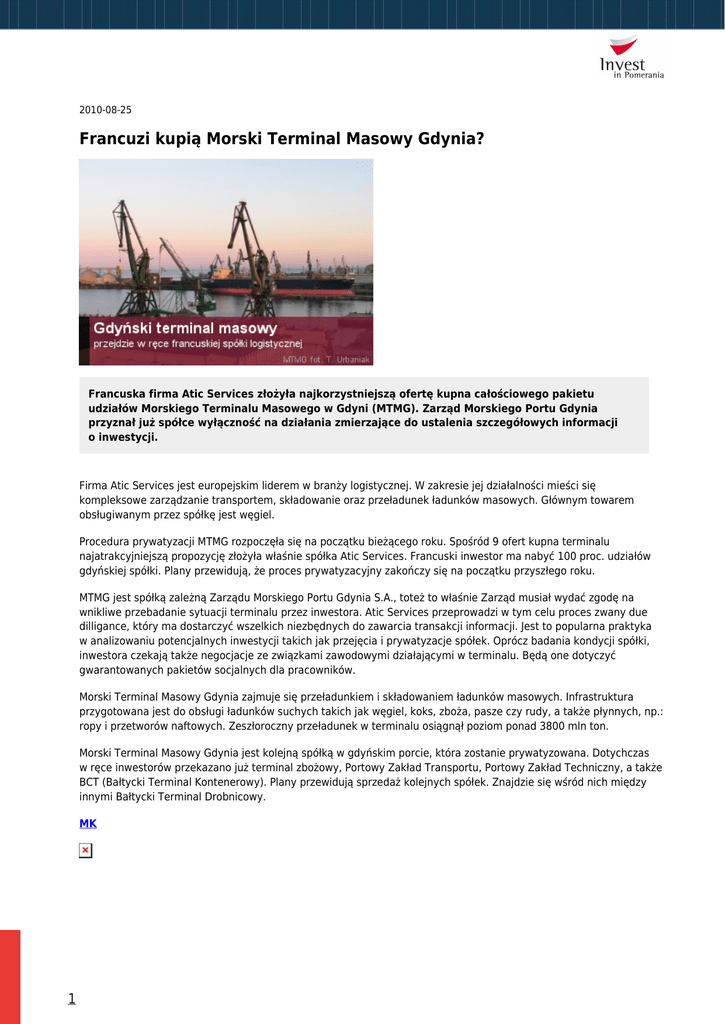 2010-08-25 Francuzi kupią Morski Terminal Masowy Gdynia? Francuska firma Atic Services złożyła najkorzystniejszą ofertę kupna całościowego pakietu udziałów Morskiego Terminalu Masowego w Gdyni (MTMG). Zarząd Morskiego Portu Gdynia przyznał już spółce wyłączność na działania zmierzające do ustalenia szczegółowych informacji o inwestycji. Firma Atic Services jest europejskim liderem w branży logistycznej. W zakresie jej działalności mieści się kompleksowe zarządzanie transportem, składowanie oraz przeładunek ładunków masowych. Głównym towarem obsługiwanym przez spółkę jest węgiel. Procedura prywatyzacji MTMG rozpoczęła się na początku bieżącego roku. Spośród 9 ofert kupna terminalu najatrakcyjniejszą propozycję złożyła właśnie spółka Atic Services. Francuski inwestor ma nabyć 100 proc. udziałów gdyńskiej spółki. Plany przewidują, że proces prywatyzacyjny zakończy się na początku przyszłego roku. MTMG jest spółką zależną Zarządu Morskiego Portu Gdynia S.A., toteż to właśnie Zarząd musiał wydać zgodę na wnikliwe przebadanie sytuacji terminalu przez inwestora. Atic Services przeprowadzi w tym celu proces zwany due dilligance, który ma dostarczyć wszelkich niezbędnych do zawarcia transakcji informacji. Jest to popularna praktyka w analizowaniu potencjalnych inwestycji takich jak przejęcia i prywatyzacje spółek. Oprócz badania kondycji spółki, inwestora czekają także negocjacje ze związkami zawodowymi działającymi w terminalu. Będą one dotyczyć gwarantowanych pakietów socjalnych dla pracowników. Morski Terminal Masowy Gdynia zajmuje się przeładunkiem i składowaniem ładunków masowych. Infrastruktura przygotowana jest do obsługi ładunków suchych takich jak węgiel, koks, zboża, pasze czy rudy, a także płynnych, np.: ropy i przetworów naftowych. Zeszłoroczny przeładunek w terminalu osiągnął poziom ponad 3800 mln ton. Morski Terminal Masowy Gdynia jest kolejną spółką w gdyńskim porcie, która zostanie prywatyzowana. Dotychczas w ręce inwestorów przekazano już terminal zbożowy, Portowy Zakład Transportu, Portowy Zakład Techniczny, a także BCT (Bałtycki Terminal Kontenerowy). Plany przewidują sprzedaż kolejnych spółek. Znajdzie się wśród nich między innymi Bałtycki Terminal Drobnicowy. MK 1 Autor MK 2