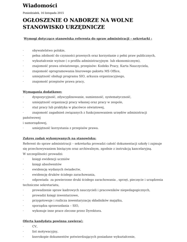 Wiadomości Poniedziałek, 16 listopada 2015 OGŁOSZENIE O NABORZE NA WOLNE STANOWISKO URZĘDNICZE Wymogi dotyczące stanowiska referenta do spraw administracji – sekretarki : · obywatelstwo polskie, · pełna zdolność do czynności prawnych oraz korzystanie z pełni praw publicznych, · wykształcenie wyższe ( o profilu administracyjnym lub ekonomicznym), · znajomość prawa oświatowego, przepisów: Kodeks Pracy, Karta Nauczyciela, · znajomość oprogramowania biurowego pakietu MS Office, · umiejętność obsługi programu SIO, arkusza organizacyjnego, · znajomość przepisów prawa pracy, Wymagania dodatkowe: · dyspozycyjność, zdyscyplinowanie, sumienność, systematyczność, · umiejętność organizacji pracy własnej oraz pracy w zespole, · staż pracy lub praktyka w placówce oświatowej, · znajomość zagadnień związanych z funkcjonowaniem urzędów administracji państwowej i samorządowej, · umiejętność korzystania z przepisów prawa. Zakres zadań wykonywanych na stanowisku: Referent do spraw administracji – sekretarka prowadzi całość dokumentacji szkoły i zajmuje się przechowywaniem bieżącym oraz archiwalnym, zgodnie z instrukcją kancelaryjną. W szczególności prowadzi: · księgi ewidencji uczniów · księgi absolwentów · ewidencję wydanych świadectw, · ewidencję druków ścisłego zarachowania, · odpowiada za powierzone druki ścisłego zarachowania , sprzęt, pieczęcie i urządzenia techniczne sekretariatu, · prowadzenie spraw kadrowych nauczycieli i pracowników niepedagogicznych, · prowadzi księgi inwentarzowe, · przygotowuje i rozlicza inwentaryzację składników majątku, · sporządza sprawozdania – SIO, · wykonuje inne prace zlecone przez Dyrektora. Oferta kandydata powinna zawierać: · CV, · list motywacyjny, · kserokopie dokumentów potwierdzających posiadane wykształcenie, · kserokopie dokumentów potwierdzających staż pracy, · oświadczenie kandydata o pełnej zdolności do czynności prawnych oraz o braku ograniczeń w korzystaniu w pełni z praw publicznych i niekaralności za przestępstwa popełnione umyślnie, · kserokopie innych dokumentów potwierdzających posiadane kwalifikacje i umiejętności (jeśli kandydat takie posiada), CV oraz list motywacyjny należy opatrzyć podpisem oraz oświadczeniem, że kandydat wyraża zgodę na przetwarzanie danych osobowych na potrzeby rekrutacji, zgodnie z ustawą z dnia 29 sierpnia 1997 r . o ochronie danych osobowych (Dz. U. z 2002r Nr 101, poz. 929 z późn. zm.) oraz ustawą z dnia 22 marca 1990 r. o pracownikach samorządowych (j.t. Dz. U. z 2001 r. Nr 142, poz. 1593 z późn. zm), Wymienione wyżej dokumenty należy składać w sekretariacie Szkoły Podstawowej im. Artura Grottgera w Porębie Wielkiej, Al. Parkowa 1 , 32-600 Oświęcim w zaklejonej kopercie z dopiskiem: „Nabór na stanowisko referent do spraw administracji - sekretarka” Ostateczny termin składania dokumentów określa się na 27.11. 2015 r. do godziny 1200. Aplikacje, które wpłyną po tym terminie nie będą rozpatrywane. Rozmowy kwalifikacyjne odbędą się w dniu 30.11. 2015 r. Dodatkowych informacji udziela: Dyrektor Szkoły Podstawowej im. Artura Grottgera w Porębie Wielkiej, Tel. 33 842 83 17 Informujemy, że w celu przeprowadzenia dalszego etapu rekrutacji skontaktujemy się z wybranymi osobami. Informacja o wynikach naboru zostanie ogłoszona po zakończeniu postępowania kwalifikacyjnego w Biuletynie Informacji Publicznej SP w Porębie Wielkiej i na stronie internetowej szkoły. Dokumenty niewykorzystane w procesie rekrutacji będzie można odebrać w sekretariacie szkoły, dokumenty nieodebrane po 30 dniach zostaną zniszczone. Dyrektor Małgorzata Bucka