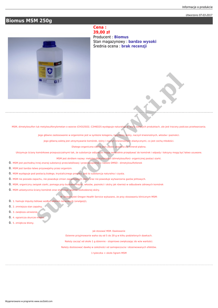 Informacje o produkcie Utworzono 07-03-2017 Biomus MSM 250g Cena : 39,00 zł w ki .p l Producent : Biomus Stan magazynowy : bardzo wysoki Średnia ocena : brak recenzji MSM, dimetylosulfon lub metylosulfonylometan o wzorze (CH3)2SO2, C2H6O2S występuje naturalnie w wielu świeżych produktach, ale jest tracony podczas przetwarzania. ro dz y Jego główne zastosowanie w organizmie jest w syntezie kolagenu, tworzeniu skóry, naczyń krwionośnych, włosów i paznokci. Jego główną zaletą jest utrzymywanie komórek, skóry i naczyń krwionośnych elastycznymi, co jest cechą młodości. Dlatego organiczna siarka jest często uważana za minerał piękna. Utrzymuje ściany komórkowe przepuszczalnymi tak, że substancje odżywcze mogą swobodnie przepływać do komórek i odpady i toksyny mogą być łatwo usuwane. MSM jest skrótem nazwy: metylosulfonylometan (dimetylosulfon)- organicznej postaci siarki. MSM jest pochodną innej znanej substancji przeciwbólowej i przeciwzapalnej o nazwie DMSO - dimetylosulfotlenek 0. MSM jest bardzo łatwo przyswajalny przez organizm. 0. MSM występuje pod postacią białego, krystalicznego proszku. Jest to substancja naturalna i czysta. 0. MSM nie posiada zapachu, nie powoduje zmian zapachowych skóry oraz nie powoduje wytwarzania gazów jelitowych. 0. MSM, organiczny związek siarki, pomaga przy budowie mięśni, włosów, paznokci i skóry jak również w odbudowie zdrowych komórek 0. MSM uelastycznia ściany komórek oraz stymuluje gojenie uszkodzonej skóry. 0. 1. hamuje impulsy bólowe wzdłuż włókien nerwowych (analgezji), 0. 2. zmniejsza stan zapalny, 0. 3. zwiększa ukrwienie, 0. 4. ogranicza skurcze mięśni 0. 5. zmiękcza blizny. pe 0. su W Uniwersytet Oregon Health Service wykazano, że przy stosowaniu klinicznym MSM: Jak stosować MSM. Dawkowanie Dzienne przyjmowanie waha się od 5 do 20 g w kilku podzielonych dawkach. Należy zacząć od około 1 g dziennie - stopniowo zwiększając do w/w wartości. Należy dostosować dawkę w zależności od samopoczucia i obserwowanych efektów. 1 łyżeczka = około 5gram MSM Wygenerowano w programie www.oscGold.com