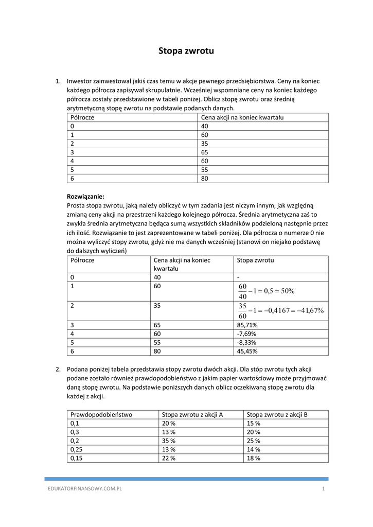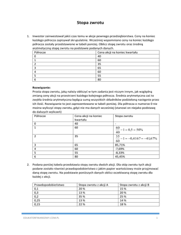 Stopa zwrotu 1. Inwestor zainwestował jakiś czas temu w akcje pewnego przedsiębiorstwa. Ceny na koniec każdego półrocza zapisywał skrupulatnie. Wcześniej wspomniane ceny na koniec każdego półrocza zostały przedstawione w tabeli poniżej. Oblicz stopę zwrotu oraz średnią arytmetyczną stopę zwrotu na podstawie podanych danych. Półrocze Cena akcji na koniec kwartału 0 40 1 60 2 35 3 65 4 60 5 55 6 80 Rozwiązanie: Prosta stopa zwrotu, jaką należy obliczyć w tym zadania jest niczym innym, jak względną zmianą ceny akcji na przestrzeni każdego kolejnego półrocza. Średnia arytmetyczna zaś to zwykła średnia arytmetyczna będąca sumą wszystkich składników podzieloną następnie przez ich ilość. Rozwiązanie to jest zaprezentowane w tabeli poniżej. Dla półrocza o numerze 0 nie można wyliczyć stopy zwrotu, gdyż nie ma danych wcześniej (stanowi on niejako podstawę do dalszych wyliczeń) Półrocze Cena akcji na koniec Stopa zwrotu kwartału 0 40 1 60 60 2 35 1 0,5 50% 40 35 1 0,4167 41,67% 60 3 4 5 6 65 60 55 80 85,71% -7,69% -8,33% 45,45% 2. Podana poniżej tabela przedstawia stopy zwrotu dwóch akcji. Dla stóp zwrotu tych akcji podane zostało również prawdopodobieństwo z jakim papier wartościowy może przyjmować daną stopę zwrotu. Na podstawie poniższych danych oblicz oczekiwaną stopę zwrotu dla każdej z akcji. Prawdopodobieństwo 0,1 0,3 0,2 0,25 0,15 EDUKATORFINANSOWY.COM.PL Stopa zwrotu z akcji A 20 % 13 % 35 % 13 % 22 % Stopa zwrotu z akcji B 15 % 20 % 25 % 14 % 18 % 1 Rozwiązanie: W tym przypadku należy skorzystać ze wzoru na oczekiwaną stopę zwrotu. Jak wiadomo oczekiwaną stopę zwrotu z danych zaprezentowanych poniżej można wyliczyć jako średnią ważoną stopy zwrotu i prawdopodobieństwa danej akcji. Wzór ten prezentuje się następująco: n E(r) p i ri i 1 pi- prawdopodobieństwo zajścia danego zdarzenia ri – możliwa do zrealizowania stopa zwrotu 1 Oczekiwana stopa zwrotu dla akcji A wygląda następująco: E (r ) 0,1 * 0,2 0,3 * 0,13 0,2 * 0,35 0,25 * 0,13 0,15 * 0,22 0,1945 19,45% Oczekiwana stopa zwrotu dla akcji B jest następująca: E (r ) 0,1 * 0,15 0,3 * 0,2 0,2 * 0,25 0,25 * 0,14 0,15 * 0,18 0,187 18,7% 3. Inwestor znając oczekiwane stopy zwrotu powyższych spółek postanowił skonstruować z nich portfel, w którym obydwie akcje mają równe udziały. Inwestor kierował się zasadami teorii portfela dwóch spółek. Mając na uwadze powyższe oblicz oczekiwaną stopę zwrotu dla portfela zbudowanego przez inwestora. Rozwiązanie: Zadanie daje wyraźną wskazówkę, iż inwestor zbudował portfel dwóch akcji, których udziały kształtują się następująco: dla akcji A 50% i dla akcji B 50%. Mając na uwadze to, że inwestor kierował się zasadami teorii portfela dwóch spółek należy tutaj skorzystać z odpowiedniego wzoru. rp w1 E(r1 ) w2 E(r2 ) 2 Jak doskonale widać w tym przypadku oczekiwana stopa zwrotu będzie również średnią ważoną udziałów spółek i ich oczekiwanych stóp zwrotu obliczonych w zadaniu drugim. rp 0,5 * 0,1945 0,5 * 0,187 19,08% 1 Haugen R.A., Teoria nowoczesnego inwestowania. Obszerny podręcznik analizy portfelowej, WIG Press, Warszawa, 1996, s.70 2 Jajuga K., Jajuga T., Inwestycje wyd. 3 zm., Wydawnictwo Naukowe PWN, Warszawa 2012, s.209 EDUKATORFINANSOWY.COM.PL 2
