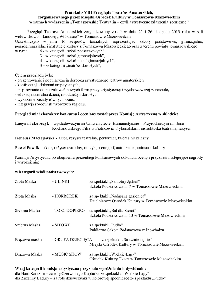 Protokół z VIII Przeglądu Teatrów Amatorskich, zorganizowanego przez Miejski Ośrodek Kultury w Tomaszowie Mazowieckim w ramach wydarzenia „Tomaszowskie Teatralia – czyli artystyczne zdarzenia sceniczne” Przegląd Teatrów Amatorskich zorganizowany został w dniu 25 i 26 listopada 2013 roku w sali widowiskowo – kinowej „Włókniarz” w Tomaszowie Mazowieckim. Uczestniczyło w nim 16 zespołów teatralnych reprezentując szkoły podstawowe, gimnazjalne, ponadgimnazjalne i instytucje kultury z Tomaszowa Mazowieckiego oraz z terenu powiatu tomaszowskiego w tym: 6 - w kategorii „szkół podstawowych”. 3 - w kategorii „szkół gimnazjalnych”, 4 - w kategorii „szkół ponadgimnazjalnych”, 3 – w kategorii „teatrów dorosłych”, Celem przeglądu było: - prezentowanie i popularyzacja dorobku artystycznego teatrów amatorskich - konfrontacja dokonań artystycznych, - inspirowanie do poszukiwań nowych form pracy artystycznej i wychowawczej w zespole, - edukacja teatralna dzieci, młodzieży i dorosłych - wykazanie zasady równych szans, - integracja środowisk twórczych regionu. Przegląd miał charakter konkursu i oceniony został przez Komisję Artystyczną w składzie: Lucyna Jakubczyk - wykładowczyni na Uniwersytecie Humanistyczno – Przyrodniczym im. Jana Kochanowskiego Filia w Piotrkowie Trybunalskim, instruktorka teatralna, reżyser Ireneusz Maciejewski - aktor, reżyser teatralny, performer, twórca niezależny Paweł Pawlik – aktor, reżyser teatralny, muzyk, scenograf, autor sztuk, animator kultury Komisja Artystyczna po obejrzeniu prezentacji konkursowych dokonała oceny i przyznała następujące nagrody i wyróżnienia: w kategorii szkół podstawowych: Złota Maska - ULINKI za spektakl „Samotny Jędruś” Szkoła Podstawowa nr 7 w Tomaszowie Mazowieckim Złota Maska - HORROREK za spektakl „Nadąsana gąsienica” Dzielnicowy Ośrodek Kultury w Tomaszowie Mazowieckim Srebrna Maska - TO CI DOPIERO za spektakl „Bal dla Sierot” Szkoła Podstawowa nr 13 w Tomaszowie Mazowieckim Srebrna Maska - SITOWE za spektakl „Pudło” Publiczna Szkoła Podstawowa w Inowłodzu Brązowa maska - GRUPA DZIECIĘCA za spektakl „Strasznie fajnie” Miejski Ośrodek Kultury w Tomaszowie Mazowieckim Brązowa Maska - MUSIC SHOW za spektakl „Wielkie Łapy” Ośrodek Kultury Tkacz w Tomaszowie Mazowieckim W tej kategorii komisja artystyczna przyznała wyróżnienia indywidualne dla Hani Karazim – za rolę Czerwonego Kapturka ze spektaklu „Wielkie Łapy” dla Zuzanny Badury – za rolę dziewczynki w kolorowej spódniczce ze spektaklu „Pudło” w kategorii szkół gimnazjalnych: Brązowa Maska - Grupa Teatralna INNI za spektakl „Świteź i Anka, czyli zdrada zły koniec miewa” Gimnazjum nr 6 im. Ks. Jana Twardowskiego w Tomaszowie Mazowieckim Wyróżnienie - SZERY MERY za spektakl „Kim jesteś człowieku i dokąd zmierzasz?” Gimnazjum nr 8 w Tomaszowie Mazowieckim W kategorii szkół gimnazjalnych komisja artystyczna przyznała wyróżnienie indywidualne dla Damiana Pieczyńskiego z zespołu POTWORY z Gimnazjum nr 6 im. Ks. Jana Twardowskiego w Tomaszowie Mazowieckim w kategorii szkół ponadgimnazjalnych: Srebrna Maska - Nieformalna Grupa „MIG-AWKA" za spektakl „Bajek ze współczesnością potyczka …” II Liceum Ogólnokształcące im. S. Żeromskiego w Tomaszowie Mazowieckim Brązowa Maska - Teatr szkolny MECHANIK za spektakl „Wariacje na temat RYBKI” Zespół Szkół Ponadgimnazjalnych nr 1 W kategorii szkół ponadgimnazjalnych komisja artystyczna przyznała nagrody aktorskie - dla Martyny Plichty za rolę „Dilerki” ze spektaklu „Bajek ze współczesnością potyczka …” i za rolę „Dilerki” ze spektaklu „Kopciuszek – historia prawdziwa” - dla Damiana Zawadzkiego za rolę „Księcia” ze spektaklu „Bajek ze współczesnością potyczka …” - dla Zuzanny Pełki za rolę „Macochy” ze spektaklu „Kopciuszek – historia prawdziwa” w kategorii teatrów dorosłych: Złota Maska - MIĘDZYPOKOLENIOWA GRUPA TEATRALNA za spektakl „Wizyta” Miejski Ośrodek Kultury w Tomaszowie Mazowieckim Złota Maska - MIĘDZYPOKOLENIOWA GRUPA TEATRALNA p. Elżbieta Ołubek za spektakl „Shirley-ka” Miejski Ośrodek Kultury w Tomaszowie Mazowieckim Złota maska - TEATR MŁODYCH im. Wojciecha Bogusławskiego w Lubochni za spektakl „Jasio się żyni” Gminny Ośrodek Kultury w Lubochni W tej kategorii komisja artystyczna przyznała indywidualną nagrodę aktorską - dla p. Barbary Skawińskiej za rolę „Starszej Pani” ze spektaklu „Wizyta” Przegląd Teatrów Amatorskich oraz wydarzenia towarzyszące „VIII Tomaszowskim Teatraliom” zostały sfinansowane ze środków Miejskiego Ośrodka Kultury w Tomaszowie Mazowieckim i pozyskanych przez Ośrodek. Patronat nad imprezą objął Prezydent Miasta Tomaszowa Mazowieckiego oraz Starosta Tomaszowski. Sponsorem przeglądu była firma Ceramika Paradyż Sp. z o.o. i firma Eurobox Polska Sp. z o.o. Fundatorem nagród w konkursie było Starostwo Powiatowe w Tomaszowie Mazowieckim. Opieka medialna: Dziennik Łódzki Tygodnik 7 Dni, Tomaszowski Informator Tygodniowy, Nasz Tomaszów.pl codzienna gazeta internetowa, Radio Fama. Uwagi: Komisja artystyczna „VIII TOMASZOWSKICH TEATRALIÓW – czyli artystycznych zdarzeń scenicznych” w składzie: Lucyna Jakubczyk, Ireneusz Maciejewski oraz Paweł Pawlik pragnie gorąco podziękować wszystkim wykonawcom, instruktorom i opiekunom, a także organizatorom za zaangażowanie w przygotowaniu przeglądu. Chcemy podkreślić wysoki poziom prezentacji w kategorii dziecięcej. Zespoły chętnie i z powodzeniem sięgały po nowe formy teatralne przełamując schematy. W efekcie powstały spektakle nowoczesne a jednocześnie bliskie dziecięcemu postrzeganiu świata. Na szczególna uwagę zasługują prezentacje w kategorii dorosłych. To wielka wartość zarówno w wymiarze artystycznym jak i społecznym. Zachęcamy zespoły w 