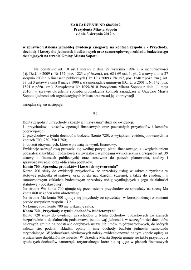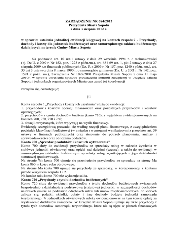 ZARZĄDZENIE NR 684/2012 Prezydenta Miasta Sopotu z dnia 3 sierpnia 2012 r. w sprawie: ustalenia jednolitej ewidencji księgowej na kontach zespołu 7 - Przychody, dochody i koszty dla jednostek budżetowych oraz samorządowego zakładu budżetowego działających na terenie Gminy Miasta Sopotu Na podstawie art. 10 ust.1 ustawy z dnia 29 września 1994 r. o rachunkowości ( tj. Dz.U. z 2009 r. Nr 152, poz. 1223 z późn.zm.), art. 68 i 69 ust. 1, pkt 2 ustawy z dnia 27 sierpnia 2009 r. o finansach publicznych (Dz. U. z 2009 r. Nr 157, poz. 1240 z późn. zm.), art. 33 ust 3 ustawy z dnia 8 marca 1990 r. o samorządzie gminnym (Dz. U. z 2001 r. Nr 142, poz. 1591 z późn. zm.), Zarządzenia Nr 1099/2010 Prezydenta Miasta Sopotu z dnia 11 maja 2010r. w sprawie określenia sposobu prowadzenia kontroli zarządczej w Urzędzie Miasta Sopotu i jednostkach organizacyjnych Miasta oraz zasad jej koordynacji zarządza się, co następuje; §1 Konta zespołu 7 „Przychody i koszty ich uzyskania” służą do ewidencji: 1. przychodów i kosztów operacji finansowych oraz pozostałych przychodów i kosztów operacyjnych; 2. przychodów z tytułu dochodów budżetu (konto 720), z wyjątkiem ewidencjonowanych na kontach 700, 730, 750 i 760; 3. dotacji otrzymanych, które wpływają na wynik finansowy. Ewidencję szczegółową prowadzi się według pozycji planu finansowego, z uwzględnieniem podziałek klasyfikacji budżetowej (w związku z wymogami wynikającymi z przepisów art. 39 ustawy o finansach publicznych) oraz stosownie do potrzeb planowania, analizy i sprawozdawczości oraz obliczania podatków. Konto 700 „Sprzedaż produktów i koszt ich wytworzenia” Konto 700 służy do ewidencji przychodów ze sprzedaży usług w zakresie żywienia w stołówce jednostki oświatowej oraz opieki nad dziećmi (czesne), a także do ewidencji w samorządowym zakładzie budżetowym sprzedaży usług wynikających z jego działalności statutowej (podstawowej). Na stronie Wn konta 700 ujmuje się przeniesienie przychodów ze sprzedaży na stronę Ma konta 860 w końcu roku obrotowego. Na stronie Ma konta 700 ujmuje się przychody ze sprzedaży, w korespondencji z kontami przede wszystkim zespołu 1 i 2. Na koniec roku konto 700 nie wykazuje salda. Konto 720 „Przychody z tytułu dochodów budżetowych” Konto 720 służy do ewidencji przychodów z tytułu dochodów budżetowych związanych bezpośrednio z działalnością podstawową (statutową) jednostki, w szczególności dochodów należnych gminie na podstawie odrębnych ustaw lub umów międzynarodowych, do których zalicza się: podatki, składki, opłaty i inne dochody budżetu jednostki samorządu terytorialnego. W jednostkach oświatowych należy ewidencjonować na tym koncie opłatę za wystawienie duplikatów świadectw. W Urzędzie Miasta Sopotu ujmuje się także przychody z tytułu tych dochodów samorządu terytorialnego, które nie są ujęte w planach finansowych 2 innych samorządowych jednostek budżetowych i wpływają bezpośrednio na rachunek budżetu (konto 133). Na stronie Wn konta 720 ujmuje się odpisy z tytułu dochodów budżetowych, a na stronie Ma konta 720 ujmuje się przychody z tytułu dochodów budżetowych. Ewidencja szczegółowa prowadzona do konta 720 powinna zapewnić wyodrębnienie przychodów z tytułu dochodów budżetowych według pozycji planu finansowego. Na koniec roku obrotowego saldo konta 720 przenosi się na konto 860. Na stronie Ma konta 720 ujmuje się w szczególności przychody z tytułu dochodów budżetowych przypisanych kontrahentom w korespondencji z kontem 221 oraz odsetki od zaległości we wpłacie podatków lokalnych i inne należności uboczne w kwocie wpłaconej, co wynika wprost z § 20 rozporządzenia Ministra Finansów z dnia 25 października 2010 r. w sprawie zasad rachunkowości oraz planów kont dla organów podatkowych jednostek samorządu terytorialnego (Dz. U. Nr 208, poz. 1375). Odsetki od zaległości z tytułu płatności innych dochodów budżetowych niż podatki księguje się na koncie 750 i zalicza do dochodów budżetowych. Na koniec roku konto 720 nie wykazuje salda. Konto 730 „Sprzedaż towarów i wartość ich zakupu” Konto 730 służy do ewidencji w samorządowym zakładzie budżetowym przychodów ze sprzedaży towarów oraz ich wartości w cenie nabycia. Za cenę nabycia (zakupu) uważa się również cenę ewidencyjną skorygowaną o odchylenia od ceny. Na stronie Wn konta 730 ujmuje się wartość sprzedanych towarów a na stronie Ma tego konta ewidencjonowane są przychody ze sprzedaży. Ewidencję analityczną do konta 730 należy prowadzić zależnie od potrzeb jednostki. Na koniec roku obrotowego przenosi się przychody ze sprzedaży towarów na stronę Ma konta 860 a wartość sprzedanych towarów w cenie zakupu na stronę Wn konta 860. Na koniec roku obrotowego na koncie 730 nie występuje saldo. Konto 740 „Dotacje i środki na inwestycje” Konto 740 służy do ewidencji dotacji otrzymanych z budżetu jednostki samorządu terytorialnego oraz innych środków na finansowanie działalności podstawowej samorządowych zakładów budżetowych, a także do ujęcia środków pieniężnych przeznaczonych na inwestycje gromadzonych na wydzielonym rachunku bankowym samorządowych jednostek budżetowych prowadzących działalność oświatową. Na koncie 740 nie ewidencjonuje się dotacji otrzymanych na finansowanie inwestycji samorządowego zakładu budżetowego, bo te księguje się na podstawie przelewu Wn 131, Ma 800. W końcu roku obrotowego saldo Ma (dotacje otrzymane na finansowanie działalności podstawowej) przenosi się na stronę Ma konta 860. Na koniec roku saldo na koncie 740 nie może występować. Konto 750 „Przychody finansowe” Konto 750 służy do ewidencji przychodów finansowych. Na stronie Ma konta 750 ujmuje się przychody z tytułu operacji finansowych, a w szczególności przychody z tytułu odsetek za zwłokę w zapłacie należnośc