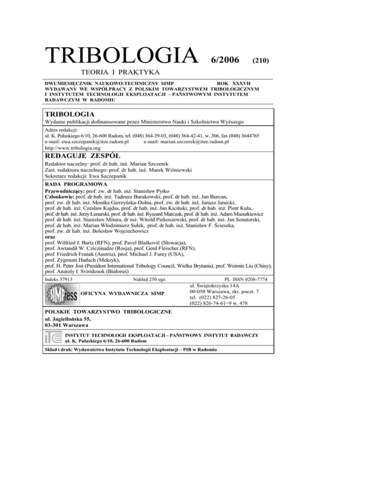 6-2006 TRIBOLOGIA 1 TRIBOLOGIA 6/2006 (210) TEORIA I PRAKTYKA DWUMIESIĘCZNIK NAUKOWO-TECHNICZNY SIMP ROK XXXVII WYDAWANY WE WSPÓŁPRACY Z POLSKIM TOWARZYSTWEM TRIBOLOGICZNYM I INSTYTUTEM TECHNOLOGII EKSPLOATACJI – PAŃSTWOWYM INSTYTUTEM BADAWCZYM W RADOMIU TRIBOLOGIA Wydanie publikacji dofinansowane przez Ministerstwo Nauki i Szkolnictwa Wyższego Adres redakcji: ul. K. Pułaskiego 6/10, 26-600 Radom, tel. (048) 364-39-03, (048) 364-42-41, w. 306, fax (048) 3644765 e-mail: [email protected] e-mail: [email protected] http://www.tribologia.org REDAGUJE ZESPÓŁ Redaktor naczelny: prof. dr hab. inż. Marian Szczerek Zast. redaktora naczelnego: prof. dr hab. inż. Marek Wiśniewski Sekretarz redakcji: Ewa Szczepanik RADA PROGRAMOWA Przewodniczący: prof. zw. dr hab. inż. Stanisław Pytko Członkowie: prof. dr hab. inż. Tadeusz Burakowski, prof. dr hab. inż. Jan Burcan, prof. zw. dr hab. inż. Monika Gierzyńska-Dolna, prof. zw. dr hab. inż. Janusz Janecki, prof. dr hab. inż. Czesław Kajdas, prof. dr hab. inż. Jan Kiciński, prof. dr hab. inż. Piotr Kula, prof. dr hab. inż. Jerzy Łunarski, prof. dr hab. inż. Ryszard Marczak, prof. dr hab. inż. Adam Mazurkiewicz prof. dr hab. inż. Stanisław Mitura, dr inż. Witold Piekoszewski, prof. dr hab. inż. Jan Senatorski, prof. dr hab. inż. Marian Włodzimierz Sułek, prof. dr hab. inż. Stanisław F. Ścieszka, prof. zw. dr hab. inż. Bolesław Wojciechowicz oraz prof. Wilfried J. Bartz (RFN), prof. Pavel Blaškovič (Słowacja), prof. Awtandił W. Cziczinadze (Rosja), prof. Gerd Fleischer (RFN), prof. Friedrich Franek (Austria), prof. Michael J. Furey (USA), prof. Zygmunt Haduch (Meksyk), prof. H. Peter Jost (President International Tribology Council, Wielka Brytania), prof. Weimin Liu (Chiny), prof. Anatoly I. Sviridenok (Białoruś) Indeks 37913 Nakład 250 egz. OFICYNA WYDAWNICZA SIMP PL ISSN 0208-7774 ul. Świętokrzyska 14A 00-050 Warszawa, skr. poczt. 7 tel. (022) 827-26-05 (022) 826-74-61÷9 w. 478 POLSKIE TOWARZYSTWO TRIBOLOGICZNE ul. Jagiellońska 55, 03-301 Warszawa INSTYTUT TECHNOLOGII EKSPLOATACJI – PAŃSTWOWY INSTYTUT BADAWCZY ul. K. Pułaskiego 6/10, 26-600 Radom Skład i druk: Wydawnictwo Instytutu Technologii Eksploatacji – PIB w Radomiu 2 TRIBOLOGIA 6-2006 6-2006 TRIBOLOGIA 3 TREŚĆ F. WILTORD, J.-M. MARTIN, T. Le MOGNE, F. JARNIAS, M. QUERRY, P. VERGNE Mechanizmy reakcji alkoholi na powierzchni aluminium............................................................................. 7 Agnieszka KARPIŃSKA, Czesław KAJDAS, Ken’ichi HIRATSUKA Generowanie wodoru podczas tribo-degradacji związków organicznych ................................................. 21 Waldemar TUSZYŃSKI Starzenie samochodowych olejów przekładniowych, cz. III. Wpływ na zużycie modelowego węzła tarcia ... 39 Ewa PAWELEC, Jolanta DRABIK Wpływ rodzaju fazy dyspergującej smaru na skuteczność działania nieorganicznych napełniaczy w ślizgowych skojarzeniach trących ............................. 57 Jadwiga BAJER Wpływ dodatku smarnego na charakterystyki tribologiczne niskotemperaturowego smaru plastycznego ... 67 Vladimir P. SERGIENKO, Alexei V. KUPREEV, Sergei N. BUKHAROV Właściwości tribologiczne i strukturalne materiałów ciernych z matrycą polimerową przeznaczonych do pracy w środowisku smarnym olejowym ..................... 81 Zbigniew PAWELEC, Janusz DASIEWICZ Oligomery poliuretanowe jako modyfikatory właściwości ślizgowych kompozytów polimerowych......... 91 4 TRIBOLOGIA 6-2006 Marian SZCZEREK, Jacek PRZEPIÓRKA, Maria CZERSKA Poprawa charakterystyk tribologicznych polimerowo-metalowych węzłów tarcia z wykorzystaniem modyfikowanych poromerycznych powłok polimerowych ............................................................................. 105 Karol KRZEMIŃSKI Model diatermiczny łożyska porowatego ..................... 115 Bogdan WARDA Stanowisko do badania trwałości zazębienia obiegowej przekładni cykloidalnej....................................... 131 Małgorzata WRONA Charakterystyka barwy cząstek zużycia z zastosowaniem cyfrowej analizy obrazu................................... 141 Piotr KOSTENCKI, Piotr BOROWIAK Problemy pomiaru nacisku gleby na powierzchnię roboczą lemiesza płużnego............................................. 151 Jan WALKOWICZ, Aleksandr ZYKOV, Stanislav DUDIN, Stanislav YAKOVIN, Rafał BRUDNIAS Układ reaktywnego rozpylania magnetronowego do osadzania powłok tlenku aluminium wspomagany wyładowaniem indukcyjnym RF ............................. 163 Komunikaty .................................................................... 175 6-2006 TRIBOLOGIA 5 CONTENTS F. WILTORD, J.-M. MARTIN, T. Le MOGNE, F. JARNIAS, M. QUERRY, P. VERGNE Reaction mechanisms of alcohols on aluminum surfaces.................................................................................. 7 Agnieszka KARPIŃSKA, Czesław KAJDAS, Ken’ichi HIRATSUKA On hydrogen generation during tribo-degradation of organic compounds .................................................... 21 Waldemar TUSZYŃSKI Degradation of automotive gear oils, part III. An influence on sliding wear of a model tribosystem........... 39 Ewa PAWELEC, Jolanta DRABIK Influence of dispersing phase type on the efficiency of inorganic fillers in sliding friction couples .............. 57 Jadwiga BAJER The influence of lubricating additive on tribological characteristics of low-temperature grease ................... 67 Vladimir P. SERGIENKO, Alexei V . KUPREEV, Sergei N. BUKHAROV Triboengineering and structural peculiarities of frictional materials with a polymer matrix aimed at operation with lubrication ............................................. 81 Zbigniew PAWELEC, Janusz DASIEWICZ Polyurethane oligomers as modifiers sliding properties of polymer composites ............................................. 91 6 TRIBOLOGIA 6-2006 Marian SZCZEREK, Jacek PRZEPIÓRKA, Maria CZERSKA An improvement of tribological characteristics of po
