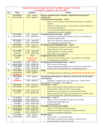 Zajęcia teoretyczne maja charakter wykładów (grupy I i II) oraz warsztatów ( grupa IA, IB , IIA, IIB ). Lp. Data Godzina Temat 1. 26.10.2015 poniedziałek 17.00 - grupa I 19.00 - grupa II 2. 02.11.2015 poniedziałek 17.00 – grupa IA 19.00 – grupa IIA 3. 05.11.2015 czwartek 09.11.2015 poniedziałek 17.00 – grupa IB 19.00 – grupa IIB 17.00 – grupa IA 19.00 – grupa IIA 12.11.2015 czwartek 17.00 – grupa IB 19.00 – grupa IIB Sprawy organizacyjne związane z zajęciami teoretycznymi i ruchowymi Przygotowanie do porodu - część I • Kiedy wybrać położną środowiskową dla mamy a kiedy dla dziecka • Wybór warunków porodu - poród domowy, poród rodzinny w warunkach szpitalnych • Co jest potrzebne dziecku po przyjściu na świat • Jak spakować torbę do szpitala Przygotowanie do porodu - część II • Prawidłowy przebieg III trymestru ciąży oraz dolegliwości ostatnich tygodni ciąży • Styl życia ciężarnej i opieka medyczna • Jak rozpoznać początek porodu Przebieg porodu fizjologicznego – część I • Przebieg poszczególnych okresów porodu • Droga dziecka przez kanał rodny • Rola hormonów w trakcie porodu • Rola bólu w czasie porodu Zaplanowane cięcie cesarskie • jak sie przygotować fizycznie i emocjonalnie do zabiegu • przebieg cięcia cesarskiego Przebieg porodu fizjologicznego – część II • Rola osoby towarzyszącej • Metody łagodzenia dolegliwości związanych ze skurczami porodowymi- farmakologiczne i niefarmakologiczne Połóg • przebieg połógu prawidłowego-SPOTKANIE TYLKO DLA PAŃ 13.11.2015 piątek 4. 5. 16.11.2015 poniedziałek 19.11.2015 czwartek 23.11.2015 poniedziałek 18.00 Spotkanie dla chętnych 17.00 – grupa IA 19.00 – grupa IIA 17.00 – grupa IB 19.00 – grupa IIB 17.00 - grupa I 19.00 - grupa II Wyjątkowo 6. 7. 8. 9. 10. 25.11.2015 środa 17.00 - grupa I Wyjątkowo 19.00 - grupa II 30.11.2015 poniedziałek 17.00 - grupa IA 19.00 - grupa IIA 03.12.2015 czwartek 17.00 - grupa I B 19.00 - grupa II B 07.12.2015 poniedziałek 10.12.2015 czwartek 14.12.2015 poniedziałek 17.12.2015 czwartek 21.12.2015 poniedziałek 17.00 – grupa I A 19.00 - grupa II A 17.00 - grupa I B 19.00 - grupa II B 17.00 - grupa IA 19.00 - grupa IIA 17.00 - grupa I B 19.00 - grupa II B 17.00 - grupa I 19.00 - grupa II Szczepienia obowiązkowe i zalecane w pierwszych dwóch latach życia dziecka • Spotkanie z pediatrą lek. med. Marcinem Dymkowskim pracującym w Przychodni “Na Wzgórzu” Noworodek – część I • Ocena stanu dziecka bezpośrednio po urodzeniu • Rola kontaktu "skóra do skóry" po porodzie • Szpitalne zwyczaje dotyczace opieki nad dzieckiem • Stany przejściowe dziecka (np. pourodzeniowy spadek wagi, odczyny hormonalne, żółtaczka fizjologiczna) Noworodek – część II • Miejsce, pora i częstotliwość kąpieli noworodka • Pielęgnacja kikuta pępowiny • Zmiana pieluszki Prawidłowe żywienie noworodka • Zalety i wady karmienia naturalnego • Warunki prawidłowej laktacji i techniki karmienia • Najczęstsze problemy laktacyjne Rodzicielstwo • Plan porodu – czy jest potrzebny • Obowiązki i uprawnienia związane z rodzicelstwem • podsumowanie I zakończenie zajęć Zajęcia są prowadzone jako zajęcia ruchowe ( grupa 1, 2, 3 ) Zajęcia ruchowe- ćwiczenia ogólno kondycyjne, wzmacniające mięśnie przykręgosłupowe, zawierające ćwiczenia rozciągające, korygujące postawę, uelastyczniające mięśnie dna miednicy, krocza i stawów biodrowych, nauka prawidłowego oddychania. Zajęcia przygotowują cały organizm do sprawnego przebiegu ciąży i do porodu. Ćwiczenia pomagają w zmniejszeniu bólów pleców towarzyszących często podczas ciąży, odciążają i relaksują stawy, wspomagają powrót do formy po porodzie oraz poprawiają samopoczucie. Zajęcia przeznaczone dla Pań, u których ciąża rozwija się bez żadnych powikłań i nie ma żadnych przeciwwskazań od lekarza prowadzącego ciążę. Dzień tygodnia Godzina Grupa Wtorek 15.00 1 16.00 2 17.00 3 Zajęcia dodatkowe dla chętnych liczba miejsc ograniczona. 1. Produkty wspierające karmienie naturalne – 18.11.2015 (środa) godz.16.30 Spotkanie z przedstawicielem medycznym firmy Medela Udział bezpłatny 2. Kaloria Zdrowia na Start – 18.11.2015 (środa) godz.18.00 Szkolenie dotyczące zasad prawidłowego żywienia kobiet w ciąży i podczas laktacji. Na zajęciach zostaną omówione tematy związane m.in. z programowaniem żywieniowym oraz stosowaniem dobrych praktyk żywieniowych w życiu codziennym. Na spotkanie zaprasza dietetyk Natalia Rykowska. Koszt 20 złotych/osoba (płatne przy zgłoszeniu) 3. Dziecko i chusta – 04.12.2015 (piątek) godz.17.30 O czym warto wiedzieć jeszcze przed narodzinami dziecka – Spotkanie z Martą Alabrudzińska doradcą noszenia w chustach i nosidłach miękkich. Koszt 20 złotych/osoba (płatne przy zgłoszeniu) 4. Pierwsza Przedmedyczna Pomoc – termin do ustalenia (środa) godz.17.00 Spotkanie z ratownikami dotyczące poznania zasad udzielenia pierwszej pomocy oraz umiejetności udzielania jej (część teoretyczna + ćwiczenia na fantomach) Koszt 50 złotych/ciężarna + osoba towarzyszaca (płatne przy zgłoszeniu) nabycia 5. Warsztaty psychologiczne dla kobiet w ciąży- termin do ustalenia Świat zmienia się po narodzinach dziecka – jak zadbać o siebie i dziecko w procesie ciąży, porodu i połogu? Jak przygotować się do tego nowego doświadczenia, jak aktywnie rodzić i świadomie wychowywać? Jak odnaleźć równowagę pomiędzy macierzyństwem a innymi rolami życiowymi?Proponowane zajęcia ułatwiają adaptację do nowej sytuacji, jaką jest ciąża i opieka nad niemowlęciem. Zajęcia prowadzą psychoterapeutki Stowarzyszenia ProMama wspierającego wczesną relację z dzieckiem: Anna Szulc – Cieplicka i Katarzyna Krysztop. Cykl warsztatów obejmuje 4 spotkania. Warsztaty są współfinansowane przez Stowarzyszenie ProMama, a koszt dla u