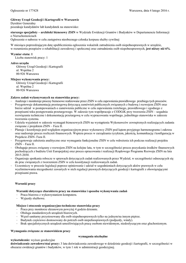 Ogłoszenie nr 177428 Warszawa, dnia 4 lutego 2016 r. Główny Urząd Geodezji i Kartografii w Warszawie Dyrektor Generalny poszukuje kandydatów lub kandydatek na stanowisko: starszego specjalisty – architekt biznesowy ZSIN w Wydziale Ewidencji Gruntów i Budynków w Departamencie Informacji o Nieruchomościach Ogłoszenie o naborze w celu zastępstwa nieobecnego członka korpusu służby cywilnej W miesiącu poprzedzającym datę upublicznienia ogłoszenia wskaźnik zatrudnienia osób niepełnosprawnych w urzędzie, w rozumieniu przepisów o rehabilitacji zawodowej i społecznej oraz zatrudnieniu osób niepełnosprawnych, jest niższy niż 6%. Wymiar etatu: 1 Liczba stanowisk pracy: 1 Adres urzędu Główny Urząd Geodezji i Kartografii ul. Wspólna 2 00-926 Warszawa Miejsce wykonywania pracy: Główny Urząd Geodezji i Kartografii ul. Wspólna 2 00-926 Warszawa Zakres zadań wykonywanych na stanowisku pracy: Analizuje i monitoruje procesy biznesowe realizowane przez ZSIN w celu zapewnienia prawidłowego przebiegu tych procesów. Przygotowuje dokumentację przetargową dotyczącą zamówień publicznych związanych z budową i rozwojem ZSIN oraz bierze udział w postepowaniach o zamówienia publiczne w celu zapewnienia rzetelnego, prawidłowego i zgodnego z przepisami toku postępowania przetargowego. W zakresie tym współpracuje z CODGiK przy tworzeniu ZSIN – uzgadnia rozwiązania techniczne i dokumentację przetargową w celu wypracowania wspólnego, jednolitego stanowiska w zakresie tworzenia systemu. − Udziela wyjaśnień w zakresie wymagań biznesowych ZSIN na wystąpienia Wykonawców zewnętrznych realizujących zadania związane z projektem ZSIN – Faza II. − Planuje i koordynuje pod względem organizacyjnym prace wykonawcy ZSIN pod kątem przyjętego harmonogramu i zakresu oraz nadzoruje proces rozliczeń finansowych. Wspiera proces w zarządzania ryzykiem, jakością, komunikacją i konfiguracją w Projekcie ZSIN- Faza II. − Przygotowuje założenia analityczne oraz wymagania funkcjonalne ZSIN w celu wdrożenia ich podczas realizacji projektu ZSIN – Faza II. − Obsługuje proces związany z rozwojem ZSIN na kolejne lata, w tym w szczególności proces pozyskania środków finansowych pochodzących z budżetu Unii Europejskiej oraz proces opracowania i realizacji Rządowego Programu Rozwoju ZSIN na lata 2015-2030. − Organizuje spotkania robocze w sprawach dotyczących zadań realizowanych przez Wydział, w szczególności odnoszących się do prac związanych z tworzeniem ZSIN w celu koordynacji realizowanych zadań. − Uczestniczy w procesie legislacji poprzez opiniowanie i udział w uzgodnieniach dotyczących aktów prawnych w celu wyeliminowania niezgodności zawartych w nich regulacji prawnych dotyczących geodezji i kartografii z obowiązującymi przepisami prawa. − − Warunki pracy Warunki dotyczące charakteru pracy na stanowisku i sposobu wykonywania zadań − Praca biurowa z wykorzystaniem komputera. − Wyjazdy służbowe. Miejsce i otoczenie organizacyjno-techniczne stanowiska pracy − Praca przy monitorze ekranowym powyżej 4 godzin dziennie. − Obsługa standardowych urządzeń biurowych. − Węzeł sanitarny przystosowany dla osób niepełnosprawnych tylko na jednym/na innym piętrze. − Budynek częściowo dostosowany do potrzeb osób niepełnosprawnych (podjazdy, windy). − Brak specjalistycznych urządzeń umożliwiających pracę osobom niewidomym, niedosłyszącym oraz głuchoniemym. Wymagania związane ze stanowiskiem pracy wymagania niezbędne wykształcenie: wyższe geodezyjne doświadczenie zawodowe/staż pracy: 3 lata doświadczenia zawodowego w dziedzinie geodezji i kartografii, w szczególności w obszarze ewidencji gruntów i budynków, w tym 1 rok w administracji geodezyjnej. pozostałe wymagania niezbędne: − Bardzo dobra znajomość przepisów ustawy Prawo geodezyjne i kartograficzne oraz Dyrektywy INSPIRE wraz z przepisami wykonawczymi do tych ustaw oraz przepisami powiązanymi. − Bardzo dobra znajomość standardów technicznych dotyczących ewidencji gruntów i budynków oraz nieruchomości. − Dobra znajomość przepisów ustawy Prawo zamówień publicznych. − Umiejętności analityczne. − Umiejętność obsługi komputera w zakresie MS Office. − Samodzielność i inicjatywa. − Umiejętność organizacji pracy własnej. − Umiejętność współpracy. − Znajomość języka angielskiego na poziomie komunikatywnym. Wymagania dodatkowe: − Znajomość metodyki Togaf. − Znajomość notacji BPMN. − Znajomość standardu UML 2.0. Wymagane dokumenty i oświadczenia: − życiorys i list motywacyjny, − oświadczenie kandydata o wyrażeniu zgody na przetwarzanie danych osobowych do celów rekrutacji, − oświadczenia kandydata o korzystaniu z pełni praw publicznych − oświadczenie kandydata o nieskazaniu prawomocnym wyrokiem za umyślne przestępstwo lub umyślne przestępstwo skarbowe, − kopie dokumentów potwierdzających wykształcenie, − kopie dokumentów potwierdzających wymagane doświadczenie zawodowe/staż pracy, − kopia dokumentu potwierdzającego posiadanie polskiego obywatelstwa lub oświadczenie o posiadaniu obywatelstwa polskiego. Kopie innych dokumentów i oświadczenia: − kopia dokumentu potwierdzającego niepełnosprawność – w przypadku kandydatów i kandydatek, którzy zamierzają skorzystać z pierwszeństwa w zatrudnieniu, w przypadku, gdy znajdą się w gronie najlepszych kandydatów i kandydatek, − inne kopie dokumentów potwierdzających umiejętności i zdobyte kwalifikacje. Termin składania dokumentów: 09-02-2016 Miejsce składania dokumentów: Główny Urząd Geodezji i Kartografii ul. Wspólna 2 00-926 Warszawa z dopiskiem „Ogłoszenie nr 177428 - starszy specjalista KN/EGB/ZSIN/2.3” Inne informacje: Nasz urząd jest pracodawcą równych szans i wszystkie aplikacje są rozważane z równą uwagą bez względu na płeć, wiek, niepełnosprawność, rasę,