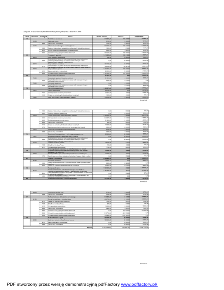 Załącznik Nr 2 do Uchwały Nr XII/80/08 Rady Gminy Obrzycko z dnia 14.04.2008 Dział Rozdział Paragraf Treść Przed zmianą Rolnictwo i łowiectwo 010 01008 Melioracje wodne 4300 01010 Zakup usług pozostałych Infrastruktura wodociągowa i sanitacyjna wsi 4360 Opłaty z tytułu zakupu usług telekomunikacyjnych telefonii komórkowej 4610 Koszty postępowania sądowego i prokuratorskiego 6050 Wydatki inwestycyjne jednostek budżetowych Transport i łączność 600 60013 6300 60014 2710 60016 Drogi publiczne wojewódzkie Dotacja celowa na pomoc finansową udzielaną między jednostkami samorządu terytorialnego na dofinansowanie własnych zadań inwestycyjnych i zakupów inwestycyjnych Drogi publiczne powiatowe Dotacja celowa na pomoc finansową udzielaną między jednostkami samorządu terytorialnego na dofinansowanie własnych zadań bieżących Drogi publiczne gminne 4210 Zakup materiałów i wyposażenia 6050 Wydatki inwestycyjne jednostek budżetowych 700 70005 4600 70095 4600 750 Po zmianie Zmiana 515 596,00 136 270,00 5 100,00 8 000,00 651 866,00 13 100,00 1 000,00 8 000,00 9 000,00 502 239,00 128 270,00 630 509,00 1 200,00 270,00 1 470,00 3 300,00 3 000,00 6 300,00 150 000,00 125 000,00 275 000,00 1 414 259,00 126 013,00 1 540 272,00 284,00 15 000,00 15 284,00 0,00 15 000,00 15 000,00 151 120,00 - 24 987,00 126 133,00 148 000,00 - 24 987,00 123 013,00 1 262 855,00 136 000,00 1 398 855,00 20 000,00 21 800,00 41 800,00 1 142 000,00 114 200,00 1 256 200,00 Gospodarka mieszkaniowa 51 210,00 0,00 51 210,00 Gospodarka gruntami i nieruchomościami Kary i odszkodowania wypłacane na rzecz osób prawnych i innych jednostek organizacyjnych Pozostała działalność Kary i odszkodowania wypłacane na rzecz osób prawnych i innych jednostek organizacyjnych Administracja publiczna 51 210,00 - 4 530,00 46 680,00 4 530,00 - 4 530,00 0,00 0,00 4 530,00 4 530,00 0,00 4 530,00 4 530,00 1 480 375,00 7 390,66 1 487 765,66 Urzędy wojewódzkie 43 700,00 0,00 43 700,00 4010 Wynagrodzenia osobowe pracowników 32 543,00 93,39 32 636,39 4440 Odpisy na zakładowy fundusz świadczeń socjalnych 1 000,00 - 93,39 906,61 123 000,00 2 900,00 125 900,00 75011 75022 Rady gmin (miast i miast na prawach powiatu) Strona 1 z 2 4360 Opłaty z tytułu zakupu usług telekomunikacyjnych telefonii komórkowej 0,00 900,00 900,00 4420 Podróże służbowe zagraniczne 0,00 2 000,00 2 000,00 75023 Urzędy gmin (miast i miast na prawach powiatu) 4010 Wynagrodzenia osobowe pracowników 4040 Dodatkowe wynagrodzenie roczne 4280 Zakup usług zdrowotnych 4440 Odpisy na zakładowy fundusz świadczeń socjalnych 4750 Zakup akcesoriów komputerowych, w tym programów i licencji 75075 Promocja jednostek samorządu terytorialnego 4300 754 6300 75412 Komendy powiatowe Państwowej Straży Pożarnej Dotacja celowa na pomoc finansową udzielaną między jednostkami samorządu terytorialnego na dofinansowanie własnych zadań inwestycyjnych i zakupów inwestycyjnych Ochotnicze straże pożarne 4120 Składki na Fundusz Pracy 4170 Wynagrodzenia bezosobowe Dochody od osób prawnych, od osób fizycznych i od innych jednostek nieposiadających osobowości prawnej oraz wydatki związane z ich poborem Pobór podatków, opłat i niepodatkowych należności budżetowych 756 75647 4700 801 Szkolenia pracowników niebędących członkami korpusu służby cywilnej Oświata i wychowanie 80195 4400 4440 852 85212 2910 4560 900 1 300 115,66 9 165,00 849 835,00 51 800,00 - 9 165,00 42 635,00 500,00 500,00 1 000,00 18 305,00 990,66 19 295,66 6 250,00 2 000,00 8 250,00 8 000,00 Zakup usług pozostałych Bezpieczeństwo publiczne i ochrona przeciwpożarowa 75411 3 490,66 840 670,00 1 296 625,00 Pozostała działalność Opłaty za administrowanie i czynsze za budynki, lokale i pomieszczenia garażowe Odpisy na zakładowy fundusz świadczeń socjalnych Pomoc społeczna Świadczenia rodzinne, zaliczka alimentacyjna oraz składki na ubezpieczenia emerytalne i rentowe z ubezpieczenia społecznego Zwrot dotacji wykorzystanych niezgodnie z przeznaczeniem lub pobranych w nadmiernej wysokości Odsetki od dotacji wykorzystanych niezgodnie z przeznaczeniem lub pobranych w nadmiernej wysokości Gospodarka komunalna i ochrona środowiska 1 000,00 9 000,00 3 000,00 1 000,00 4 000,00 92 000,00 20 830,00 112 830,00 0,00 20 000,00 20 000,00 0,00 20 000,00 20 000,00 79 000,00 830,00 79 830,00 100,00 30,00 130,00 7 750,00 800,00 8 550,00 32 600,00 700,00 33 300,00 32 600,00 700,00 33 300,00 0,00 700,00 700,00 2 406 939,42 0,00 2 406 939,42 19 625,42 0,00 19 625,42 8 920,00 - 8 920,00 0,00 10 704,00 8 920,00 19 624,00 1 789 909,00 382,00 1 790 291,00 1 287 300,00 382,00 1 287 682,00 0,00 376,00 376,00 0,00 6,00 6,00 227 750,00 3 000,00 230 750,00 Strona 2 z 2 90003 4300 921 92109 8 750,00 Oczyszczanie miast i wsi 5 750,00 3 000,00 Zakup usług pozostałych 2 100,00 3 000,00 5 100,00 Kultura i ochrona dziedzictwa narodowego 546 850,00 8 100,00 554 950,00 Domy i ośrodki kultury, świetlice i kluby 498 750,00 8 100,00 506 850,00 1 050,00 500,00 200,00 100,00 300,00 13 000,00 3 000,00 16 000,00 4 400,00 3 000,00 7 400,00 4110 Składki na ubezpieczenia społeczne 4120 Składki na Fundusz Pracy 4170 Wynagrodzenia bezosobowe 4300 Zakup usług pozostałych 1 550,00 6050 Wydatki inwestycyjne jednostek budżetowych 0,00 442 500,00 442 500,00 6058 Wydatki inwestycyjne jednostek budżetowych 315 700,00 - 315 700,00 0,00 6059 Wydatki inwestycyjne jednostek budżetowych 125 300,00 - 125 300,00 0,00 Kultura fizyczna i sport 152 500,00 20 000,00 172 500,00 926 152 500,00 20 000,00 172 500,00 4210 Zakup materiałów i wyposażenia 0,00 10 000,00 10 000,00 4300 Zakup usług pozostałych 0,00 10 000,00 10 000,00 8 843 644,42 322 685,66 9 166 330,08 92605 Zadania w zakresie kultury fizycznej i sportu Razem: Strona 3 z 2 PDF stworzony przez wersję demonstracyjną pdfFactory www.pdffactory.pl/
