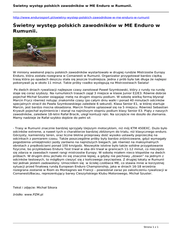 Świetny występ polskich zawodników w ME Enduro w Rumunii. http://www.endurosport.pl/swietny-wystep-polskich-zawodnikow-w-me-enduro-w-rumunii Świetny występ polskich zawodników w ME Enduro w Rumunii. W miniony weekend pięciu polskich zawodników wystartowało w drugiej rundzie Mistrzostw Europy Enduro, która została rozegrana w Comanesti w Rumunii. Organizator przygotował bardzo ciężką trasą która po opadach deszczu stała się jeszcze trudniejsza. Jedna z prób była tak długa że najlepsi pokonywali ją w około 11 minut. Takie próby rzadko występują na Mistrzostwach Świata! Po dwóch dniach rywalizacji najlepsze czasy zanotował Paweł Szymkowski, który z rundy na rundę staje się coraz szybszy. Na rumuńskich trasach zajął 3 miejsce w klasie Junior E2/E3. Równie dobrze pojechał Michał Szuster osiągając metę na drugim stopniu podium. W sobotę wielką formą błysnął Marcin Frycz również notując znakomite czasy (po całym dniu walki i ponad 40 minutach odcinków specjalnych stracił do Pawła Szymkowskiego zaledwie 6 sekund). Klasa Senior E1, w której startuje Marcin, jest bardzo mocna obsadzona. Marcin finalnie uplasował się na 5 miejscu. Również Sebastian Krywult pojechał wyśmienicie i stanął na najniższym stopniu podium klasy Senior E3. Piąty z naszych zawodników, zaledwie 18-letni Rafał Bracik, uległ kontuzji ręki. Na szczęście nie doszło do złamania. Mamy nadzieje że Rafał szybko dojdzie do pełni sił. - Trasy w Rumunii znacznie bardziej sprzyjały lżejszym motocyklom, niż mój KTM 450EXC. Dużo było odcinków extreme, a nawet tych o charakterze bardziej zbliżonym do trialu, niż klasycznego enduro. Górzysty, kamienisty teren, oraz liczne błotne przeprawy dość wysoko ustawiły poprzeczkę na odcinkach z pomiarem czasu. Także poszczególne próby były bardzo zróżnicowane, gdyż wymagały pogodzenia umiejętności jazdy zarówno na najniższych biegach, jak również na maksymalnych obrotach z prędkościami ponad 100 km/godz. Niezwykle istotne było także solidne przygotowanie fizyczne, bo przykładowo Enduro Test trwał w oba dni trwał w granicach 11-12 minut, co nieczęsto się zdarza w zawodach nawet rangi mistrzostw Europy. W sobotę miałem nieco kłopotów na dwóch próbach. W drugim dniu jechało mi się znacznie lepiej, a gdyby nie pechowy „dzwon” na jednym z odcinków testowych, to mógłbym cieszyć się z końcowego zwycięstwa. Z drugiej lokaty w Rumunii też jednak jestem zadowolony. Umocniłem się w ścisłej czołówce ME, co stawia mnie w korzystnej sytuacji przed finałową rundą European Enduro Championship, jaka w dniach 16-18 września rozegrana zostanie w Riom es Montagnes we Francji – powiedział zaraz po zakończeniu rywalizacji w Comanesti/Bacau, reprezentujący barwy Cieszyńskiego Klubu Motorowego, Michał Szuster. Tekst i zdjęcie: Michał Sikora źródło: www.PZM.pl Strona 1 z 1 Powered by TCPDF (www.tcpdf.org)