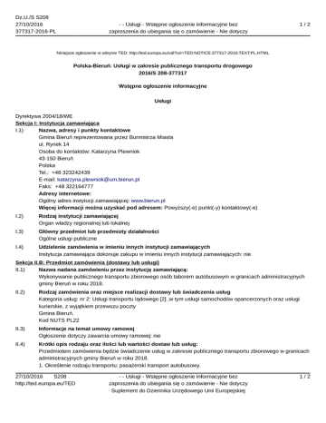 Dz.U./S S208 27/10/2016 377317-2016-PL - - Usługi - Wstępne ogłoszenie informacyjne bez zaproszenia do ubiegania się o zamówienie - Nie dotyczy 1/2 Niniejsze ogłoszenie w witrynie TED: http://ted.europa.eu/udl?uri=TED:NOTICE:377317-2016:TEXT:PL:HTML Polska-Bieruń: Usługi w zakresie publicznego transportu drogowego 2016/S 208-377317 Wstępne ogłoszenie informacyjne Usługi Dyrektywa 2004/18/WE Sekcja I: Instytucja zamawiająca I.1) Nazwa, adresy i punkty kontaktowe Gmina Bieruń reprezentowana przez Burmistrza Miasta ul. Rynek 14 Osoba do kontaktów: Katarzyna Plewniok 43-150 Bieruń Polska Tel.: +48 323242439 E-mail: [email protected] Faks: +48 322164777 Adresy internetowe: Ogólny adres instytucji zamawiającej: www.bierun.pl Więcej informacji można uzyskać pod adresem: Powyższy(-e) punkt(-y) kontaktowy(-e) I.2) Rodzaj instytucji zamawiającej Organ władzy regionalnej lub lokalnej I.3) Główny przedmiot lub przedmioty działalności Ogólne usługi publiczne I.4) Udzielenie zamówienia w imieniu innych instytucji zamawiających Instytucja zamawiająca dokonuje zakupu w imieniu innych instytucji zamawiających: nie Sekcja II.B: Przedmiot zamówienia (dostawy lub usługi) II.1) Nazwa nadana zamówieniu przez instytucję zamawiającą: Wykonywanie publicznego transportu zbiorowego osób taborem autobusowym w granicach administracyjnych gminy Bieruń w roku 2018. II.2) Rodzaj zamówienia oraz miejsce realizacji dostawy lub świadczenia usług Kategoria usług: nr 2: Usługi transportu lądowego [2] ,w tym usługi samochodów opancerzonych oraz usługi kurierskie, z wyjątkiem przewozu poczty Gmina Bieruń. Kod NUTS PL22 II.3) Informacje na temat umowy ramowej Ogłoszenie dotyczy zawarcia umowy ramowej: nie II.4) Krótki opis rodzaju oraz ilości lub wartości dostaw lub usług: Przedmiotem zamówienia będzie świadczenie usług w zakresie publicznego transportu zbiorowego w granicach administracyjnych gminy Bieruń w roku 2018. 1. Określenie rodzaju transportu: pasażerski transport autobusowy. 27/10/2016 S208 http://ted.europa.eu/TED - - Usługi - Wstępne ogłoszenie informacyjne bez zaproszenia do ubiegania się o zamówienie - Nie dotyczy Suplement do Dziennika Urzędowego Unii Europejskiej 1/2 Dz.U./S S208 27/10/2016 377317-2016-PL - - Usługi - Wstępne ogłoszenie informacyjne bez zaproszenia do ubiegania się o zamówienie - Nie dotyczy 2/2 2. Określenie linii komunikacyjnych: — Czarnuchowice – Ściernie – Bijasowice; — Czarnuchowice – Bieruń Szkoła Podstawowa nr 3; — Jajosty – Domy Polne; — Czarnuchowice – Bijasowice – Jajosty – Domy Polne. 3. Tryb udzielenia zamówienia: Postępowanie o udzielenie zamówienia w trybie, o którym mowa w art. 19 ust. 1 pkt 1 lub pkt 3 ustawy z 16.12.2010 o publicznym transporcie zbiorowym (Dz.U. 2015 poz. 1440 z późn zm.). Na podstawie art. 23 ust. 5 ustawy z 16.12.2010 o publicznym transporcie zbiorowym (Dz.U. 2015 poz. 1440 z późn. zm.) zastrzega się możliwość zmiany powyższych informacji. Części To zamówienie podzielone jest na części: nie II.5) Wspólny Słownik Zamówień (CPV) 60112000 II.6) Planowana data rozpoczęcia procedury udzielania zamówienia 6.11.2017 II.7) Informacje na temat Porozumienia w sprawie zamówień rządowych (GPA) Zamówienie jest objęte Porozumieniem w sprawie zamówień rządowych (GPA): nie II.8) Informacje dodatkowe: Sekcja III: Informacje o charakterze prawnym, ekonomicznym, finansowym i technicznym III.1) Warunki dotyczące zamówienia III.1.1) Główne warunki finansowe i uzgodnienia płatnicze i/lub odniesienie do odpowiednich przepisów je regulujących: III.2) Warunki udziału III.2.1) Informacje o zamówieniach zastrzeżonych Sekcja VI: Informacje uzupełniające VI.1) Informacje o funduszach Unii Europejskiej Zamówienie dotyczy projektu/programu finansowanego ze środków Unii Europejskiej: nie VI.2) Informacje dodatkowe: Ogłoszenie zamieszczone na podstawie art. 7 ust. 2 Rozporządzenia (WE) nr 1370/2007 Parlamentu Europejskiego i Rady z 23.10.2007 dotyczącego usług publicznych w zakresie kolejowego i drogowego transportu pasażerskiego oraz uchylające rozporządzenia Rady (EWG) nr 1191/69 i (EWG) nr 1107/70. VI.3) Informacje na temat ogólnych ram prawnych VI.4) Data wysłania niniejszego ogłoszenia: 24.10.2016 27/10/2016 S208 http://ted.europa.eu/TED - - Usługi - Wstępne ogłoszenie informacyjne bez zaproszenia do ubiegania się o zamówienie - Nie dotyczy Suplement do Dziennika Urzędowego Unii Europejskiej 2/2