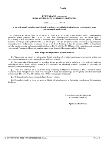 Projekt UCHWAŁA NR .................... RADY MIEJSKIEJ W DĄBROWIE GÓRNICZEJ z dnia .................... 2014 r. w sprawie zasad wynajmowania lokali wchodzących w skład mieszkaniowego zasobu gminy oraz tymczasowych pomieszczeń Na podstawie art. 18 ust. 2 pkt 15, art. 40 ust. 1 i 2 pkt 3, art. 42 ustawy z dnia 8 marca 1990 r. o samorządzie gminnym (tekst jednolity Dz. U. z 2013 r. poz. 594 z późniejszymi zmianami) oraz art. 21 ust. 1 pkt 2, ust. 3 ustawy z dnia 21 czerwca 2001 r. o ochronie praw lokatorów, mieszkaniowym zasobie gminy i o zmianie Kodeksu cywilnego (tekst jednolity Dz. U. z 2014 r. poz. 150) po przeprowadzeniu konsultacji z organizacjami pozarządowymi i podmiotami, o których mowa w art. 3 ust. 3 ustawy z dnia 24 kwietnia 2003r. o działalności pożytku publicznego i o wolontariacie (tekst jednolity Dz. U. z 2010r. Nr 234 poz. 1536 z późniejszymi zmianami) - na wniosek Prezydenta Miasta po zaopiniowaniu przez Komisję Mieszkaniową Rady Miejskiej Rada Miejska w Dąbrowie Górniczej uchwala § 1. Wprowadza się zasady wynajmowania lokali wchodzących w skład mieszkaniowego zasobu gminy oraz tymczasowych pomieszczeń wg załącznika do niniejszej uchwały. § 2. Do osób zakwalifikowanych do wynajmu lokalu socjalnego w dniu wejścia w życie niniejszej uchwały znajdujących się na liście, o której mowa w § 29 załącznika do niniejszej uchwały, przepisu § 5 załącznika do niniejszej uchwały nie stosuje się. § 3. Traci moc uchwała nr XVI/294/12 Rady Miejskiej w Dąbrowie Górniczej z dnia 4 kwietnia 2012r. w sprawie zasad wynajmowania lokali wchodzących w skład mieszkaniowego zasobu gminy oraz tymczasowych pomieszczeń /Dz. Urz. Woj. Śl. z 2012r. poz. 1978 z późniejszymi zmianami/. § 4. Wykonanie uchwały powierza się Prezydentowi Miasta. § 5. Uchwała wchodzi w życie po upływie 14 dni od jej ogłoszenia w Dzienniku Urzędowym Województwa Śląskiego. Przewodnicząca Rady Miejskiej w Dąbrowie Górniczej Agnieszka Pasternak Id: 096976DD-8AB6-4DD2-9C39-987DE8DB333D. Projekt Strona 1 Załącznik do Uchwały Nr .................... Rady Miejskiej w Dąbrowie Górniczej z dnia....................2014 r. Rozdział 1. POSTANOWIENIA OGÓLNE § 1. Uchwała ma zastosowanie do zasobów gminy, o których mowa w art. 20 ust. 1 oraz w art. 25a ustawy o ochronie praw lokatorów, mieszkaniowym zasobie gminy i o zmianie Kodeksu cywilnego /tekst jednolity Dz. U. z 2014 r. poz. 150/. § 2. W skład zasobu gminy wchodzą: 1. lokale mieszkalne, 2. lokale socjalne, 3. tymczasowe pomieszczenia. § 3. Lokale mieszkalne znajdujące się w budynkach szkół i placówek oświatowych należących do gminy, jak również lokale w budynkach użytkowanych przez szkoły i placówki oświatowe, mogą być zajmowane tylko przez nauczycieli i pracowników niebędących nauczycielami, zatrudnionych w szkołach i placówkach oświatowych na czas trwania stosunku pracy w tej placówce, przy czym zachowują oni prawo zajmowania i użytkowania tych lokali również po przejściu na emeryturę lub rentę. § 4. Prezydent Miasta na pisemny i umotywowany wniosek jednostki organizacyjnej pomocy społecznej może przeznaczyć z komunalnego zasobu mieszkaniowego lokale mieszkalne na rzecz tej jednostki z przeznaczeniem na mieszkania chronione. Jednostka organizacyjna pomocy społecznej będzie dysponować przekazanymi lokalami na cele określone w ustawie o pomocy społecznej. Zasady ich wynajmu oraz odpłatności określa umowa najmu zawarta na czas nieoznaczony na podstawie upoważnienia Prezydenta Miasta. Rozdział 2. WARUNKI ZAMIESZKIWANIA KWALIFIKUJĄCE DO ICH POPRAWY, ZASADY I KRYTERIA WYNAJMOWANIA LOKALI § 5. Przez warunki zamieszkiwania kwalifikujące wnioskodawcę do ich poprawy należy rozumieć zamieszkiwanie w lokalu, w którym na jednego członka gospodarstwa domowego przypada mniej niż 7m2 powierzchni pokoi lub w lokalu niespełniającym wymogów pomieszczeń przeznaczonych na stały pobyt ludzi, a wnioskodawca nie posiada tytułu prawnego do zajmowania lokalu lub budynku mieszkalnego. Jeżeli wnioskodawca ubiegający się o wynajem lokalu mieszkalnego udokumentuje, że w lokalu lub budynku, do którego posiada tytuł prawny nie jest możliwe zaspokojenie jego potrzeb mieszkaniowych może w tym przypadku czynić starania o poprawę warunków zamieszkiwania. § 6. Pierwszeństwo wynajmu lokalu stanowiącego mieszkaniowy zasób gminy przysługuje osobom, które: 1. zamieszkują w budynkach, w których organ nadzoru budowlanego stwierdził konieczność opróżnienia z powodu zagrożenia bezpieczeństwa ludzi i mienia lub w budynkach gminy przeznaczonych do wykwaterowania lub straciły mieszkania wskutek klęski żywiołowej, 2. utraciły tytuł prawny do lokalu socjalnego w związku z przekroczeniem dochodu, który kwalifikuje do lokalu mieszkalnego, 3. opuściły placówki opiekuńczo-wychowawcze lub rodziny zastępcze w związku z uzyskaniem pełnoletności, jeśli ich ostatnim miejscem zamieszkania przed umieszczeniem w placówce lub rodzinie zastępczej była Dąbrowa Górnicza, 4. pozostają w wyjątkowo trudnej sytuacji zdrowotnej, rodzinnej, mieszkaniowej bądź społecznej w szczególności z powodu orzeczonego znacznego lub umiarkowanego stopnia niepełnosprawności, jak również z powodu występowania przemocy bądź innej patologii w rodzinie. § 7. Osoby ubiegające się o wynajem lokalu zobowiązane są do udokumentowania okoliczności wymienionych w § 6. Id: 096976DD-8AB6-4DD2-9C39-987DE8DB333D. Projekt Strona 1 § 8. Lokale mieszkalne mogą być wynajmowane osobom, których średni miesięczny dochód w okresie 6 m-cy poprzedzających jego zakwalifikowanie nie przekracza 150% najniższej emerytury na członka rodziny ubiegającej się o wynajem i 180% w przypadku osoby samotnej. § 9. Lokale socjalne mogą być wynajmowane osobom, których średni miesięczny dochód w okresie 6 m-cy poprzedzających jego zakwalifikowanie nie przekracza 75% najniższej e