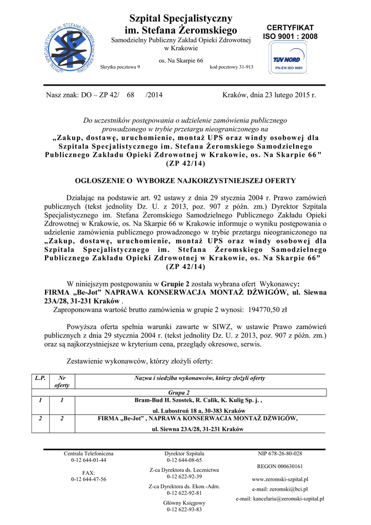 Szpital Specjalistyczny im. Stefana Żeromskiego CERTYFIKAT ISO 9001 : 2008 Samodzielny Publiczny Zakład Opieki Zdrowotnej w Krakowie os. Na Skarpie 66 Skrytka pocztowa 9 Nasz znak: DO – ZP 42/ 68 kod pocztowy 31-913 /2014 Kraków, dnia 23 lutego 2015 r. Do uczestników postępowania o udzielenie zamówienia publicznego prowadzonego w trybie przetargu nieograniczonego na „Zakup, dostawę, uruchomienie, montaż UPS oraz w indy osobow ej dla Szpitala Specjalistycznego im. Stefana Żeromskiego Samodzielnego Publicznego Zakładu Opieki Zdrowotnej w Krakowie, os. Na Skarpie 66 " (ZP 42/14) OGŁOSZENIE O WYBORZE NAJKORZYSTNIEJSZEJ OFERTY Działając na podstawie art. 92 ustawy z dnia 29 stycznia 2004 r. Prawo zamówień publicznych (tekst jednolity Dz. U. z 2013, poz. 907 z późn. zm.) Dyrektor Szpitala Specjalistycznego im. Stefana Żeromskiego Samodzielnego Publicznego Zakładu Opieki Zdrowotnej w Krakowie, os. Na Skarpie 66 w Krakowie informuje o wyniku postępowania o udzielenie zamówienia publicznego prowadzonego w trybie przetargu nieograniczonego na „Zakup, dostaw ę, uruchomienie, montaż UPS oraz windy osobowej dla Szpitala Specjalistycznego im. Stefana Żeromskiego Samodzielnego Publicznego Zakładu Opieki Zdrow otnej w Krakow ie, os. Na Skarpie 66" (ZP 42/14) W niniejszym postępowaniu w Grupie 2 została wybrana ofert Wykonawcy: FIRMA „Be-Jot” NAPRAWA KONSERWACJA MONTAŻ DŹWIGÓW, ul. Siewna 23A/28, 31-231 Kraków . Zaproponowana wartość brutto zamówienia w grupie 2 wynosi: 194770,50 zł Powyższa oferta spełnia warunki zawarte w SIWZ, w ustawie Prawo zamówień publicznych z dnia 29 stycznia 2004 r. (tekst jednolity Dz. U. z 2013, poz. 907 z późn. zm.) oraz są najkorzystniejsze w kryterium cena, przeglądy okresowe, serwis. Zestawienie wykonawców, którzy złożyli oferty: L.P. Nr oferty Nazwa i siedziba wykonawców, którzy złożyli oferty 1 1 Grupa 2 Bram-Bud H. Szostek, R. Calik, K. Kulig Sp. j. , 2 2 ul. Lubostroń 18 a, 30-383 Kraków FIRMA „Be-Jot” , NAPRAWA KONSERWACJA MONTAŻ DŹWIGÓW, ul. Siewna 23A/28, 31-231 Kraków Centrala Telefoniczna 0-12 644-01-44 FAX: 0-12 644-47-56 Dyrektor Szpitala 0-12 644-08-65 Z-ca Dyrektora ds. Lecznictwa 0-12 622-92-39 Z-ca Dyrektora ds. Ekon.-Adm. 0-12 622-92-81 Główny Księgowy 0-12 622-93-83 NIP 678-26-80-028 REGON 000630161 www.zeromski-szpital.pl e-mail: [email protected] e-mail: [email protected] Szpital Specjalistyczny im. Stefana Żeromskiego CERTYFIKAT ISO 9001 : 2008 Samodzielny Publiczny Zakład Opieki Zdrowotnej w Krakowie os. Na Skarpie 66 Skrytka pocztowa 9 kod pocztowy 31-913 Zestawienie wykonawców, którzy złożyli oferty wraz ze streszczeniem oceny i porównaniem złożonych ofert: L.P. Nr oferty 1 2 grupa 2 Nazwa i siedziba wykonawców, którzy złożyli oferty Punktacja w kryterium cena FIRMA „Be-Jot” , NAPRAWA 70 pkt Punktacja w kryterium przeglądy okresowe 15 pkt Punktacja w kryterium serwis Łączna punktacja 15 pkt 100 pkt KONSERWACJA MONTAŻ DŹWIGÓW, ul. Siewna 23A/28, 31-231 Kraków Ogłoszenie powyższe przekazane zostanie wszystkim uczestnikom postępowania, zamieszczone na stronie internetowej Szpitala oraz umieszczone na tablicy ogłoszeń w siedzibie Zamawiającego od dnia 23 lutego 2015 r. Dziękujemy za udział w procedurze przetargowej. ZATWIERDZIŁ Dr med. Zbigniew J. Król Dyrektor Szpitala Centrala Telefoniczna 0-12 644-01-44 FAX: 0-12 644-47-56 Dyrektor Szpitala 0-12 644-08-65 Z-ca Dyrektora ds. Lecznictwa 0-12 622-92-39 Z-ca Dyrektora ds. Ekon.-Adm. 0-12 622-92-81 Główny Księgowy 0-12 622-93-83 NIP 678-26-80-028 REGON 000630161 www.zeromski-szpital.pl e-mail: [email protected] e-mail: [email protected] Szpital Specjalistyczny im. Stefana Żeromskiego CERTYFIKAT ISO 9001 : 2008 Samodzielny Publiczny Zakład Opieki Zdrowotnej w Krakowie os. Na Skarpie 66 Skrytka pocztowa 9 kod pocztowy 31-913 Prosimy o potwierdzenie otrzymania w dniu 23 lutego 2015 r. niniejszego pisma na nr faxu 12/ 644 47 56 lub e-mail: [email protected] Centrala Telefoniczna 0-12 644-01-44 FAX: 0-12 644-47-56 Dyrektor Szpitala 0-12 644-08-65 Z-ca Dyrektora ds. Lecznictwa 0-12 622-92-39 Z-ca Dyrektora ds. Ekon.-Adm. 0-12 622-92-81 Główny Księgowy 0-12 622-93-83 NIP 678-26-80-028 REGON 000630161 www.zeromski-szpital.pl e-mail: [email protected] e-mail: [email protected]
