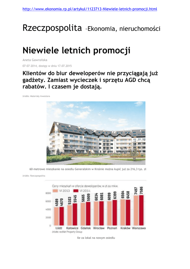 http://www.ekonomia.rp.pl/artykul/1123713-Niewiele-letnich-promocji.html Rzeczpospolita –Ekonomia, nieruchomości Niewiele letnich promocji Aneta Gawrońska 07-07-2014, dostęp w dniu 17.07.2015 Klientów do biur deweloperów nie przyciągają już gadżety. Zamiast wycieczek i sprzętu AGD chcą rabatów. I czasem je dostają. źródło: Materiały Inwestora 60-metrowe mieszkanie na osiedlu Generalskim w Krośnie można kupić już za 216,3 tys. zł źródło: Rzeczpospolita Ile za lokal na nowym osiedlu Do końca sierpnia mieszkania po niższych cenach oferuje Marvipol. Na warszawskim osiedlu Central Park Ursynów część dwu- i trzypokojowych lokali można kupić już w cenie niespełna 6,1 tys. zł za mkw. Na gotowym osiedlu Zielona Italia w stołecznych Włochach mieszkania z trzema, czterema i pięcioma pokojami są dostępne od niespełna 5,3 tys. zł za mkw. Wakacyjna cena trzypokojowych lokali w inwestycji Art Eco to 8,3 tys. zł za mkw. Nabywcy mieszkań na gotowych osiedlach Marvipolu na Bielanach i Mokotowie mogą liczyć na ich gratisowe wykończenie. Kto pierwszy, ten lepszy – Kupujący nie powinni się jednak spodziewać wysypu promocji. Mieszkania sprzedają się bardzo dobrze – tłumaczy Jacek Bielecki, dyrektor ds. jakości w spółce Marvipol. – Zachęty mogą się pojawić w okresie wakacyjnym, bo wtedy maleje z reguły aktywność kupujących. Promocje nie będą jednak ani powszechne, ani wielkie. Letniego wysypu promocji nie spodziewa się Roma Pikulska z poznańskiego Red Parku. – Większość inwestycji w Poznaniu jest objęta programem dopłat, co jest już dużą zachętą. Nieliczne promocje, jakich się można spodziewać, będą polegały na zaoferowaniu części mieszkań w specjalnej cenie, by wyróżnić inwestycję na tle konkurencji – prognozuje Roma Pikulska. Podkreśla, że klientom najbardziej zależy na realnych oszczędnościach. – Nie wycieczki i gadżety, lecz rabaty i bezpłatne wykończenie mieszkania to dobry sposób, by zachęcić klientów do zakupu – mówi przedstawicielka Red Parku. Opinię podziela Sławomir Horbaczewski, prezes spółki Wikana. – Samochody i egzotyczne wakacje nie cieszą się już wielkim zainteresowaniem klientów, którzy mają problemy z otrzymaniem kredytu. Dlatego też takie promocje nie są częste. Klienci oczekują konkretnych rabatów i dodatkowych korzyści, np. darmowego garażu lub komórki lokatorskiej – podkreśla Sławomir Horbaczewski. Z kolei Ewelina Juroszek, dyrektor ds. sprzedaży w spółce Atal, ocenia, że wakacje zawsze obfitują w promocje. – Na niektórych osiedlach mamy promocje na miejsca postojowe, np. w warszawskiej inwestycji Atal Marina i na łódzkim Nowym Polesiu garaż kosztuje 19 tys. zamiast 28 tys. zł – podaje Ewelina Juroszek. – Na innych osiedlach deweloperzy obniżają ceny ostatnich gotowych mieszkań. Przykładem są nasze krakowskie inwestycje City Towers Czyżyny oraz Nadwiślańska 11. Promocyjne ceny mieszkań to odpowiednio 5,5 tys. i 7,9 tys. zł za mkw. – dodaje. W promocji są oferowane także pakiety wykończenia wnętrz. W niektórych wrocławskich inwestycjach spółki Atal takie wykończenie jest tańsze o połowę, a na osiedlu Zielone Wojszyce kosztuje 100 zł za mkw. zamiast 300 zł. Ewelina Juroszek podkreśla, że klienci doceniają przede wszystkim promocje cenowe. – Najbardziej zależy im na obniżeniu ceny mieszkania, ale równie przychylnie patrzą na niższe ceny miejsca garażowego czy komórki lokatorskiej – mówi. Także w opinii Teresy Witkowskiej, dyrektor sprzedaży i marketingu RED Real Estate Development, wakacje to dobry czas na szukanie nieruchomości. – Jednym z kluczowych kryteriów wyboru jest cena – potwierdza Teresa Witkowska. – Ważnym elementem promocji są także elastyczne harmonogramy płatności. Dużą popularnością cieszą się propozycje odroczenia płatności, np. wpłata 10–20 proc. ceny przy podpisywaniu umowy, a reszty przy odbiorze kluczy. Wycieczka na Seszele RED Real Estate Development na gotowym warszawskim osiedlu Alpha część mieszkań oferuje w cenie od 6,1 tys. zł za mkw., co pozwala na zakup na preferencyjny kredyt. – W ramach naszego autorskiego programu „Rodzina na gotowym" oferujemy też możliwość bezpłatnego wykończenia lokalu – zachęca Teresa Witkowska. System płatności 10/90 jej firma proponuje kupującym mieszkania na nowo rozpoczętym osiedlu w stołecznym Ursusie. Promocja obowiązuje do końca sierpnia. Ceny zaczynają się od niespełna 6,5 tys. zł za mkw. Także tu można liczyć na darmowe wykończenie lokalu. Dom Development, budujący mieszkania w stolicy i we Wrocławiu, kusi ofertą finansowania nieruchomości. – Brak prowizji od kredytu, bezpłatne przygotowanie operatu szacunkowego i zero złotych za wcześniejszą spłatę kredytu – mówi Radosław Bieliński, rzecznik spółki. – Ci, którzy kupią mieszkanie w wakacje, mogą wygrać wycieczki na Seszele i Mauritiusa. Promocje obowiązują także na poznańskich osiedlach. Proxin Ogrody kupującym mieszkania z garażami na osiedlu Nowe Ogrody daje 5 proc. rabatu. Ceny zaczynają się od 5,9 tys. zł za mkw. Część lokali spełnia kryteria „MdM". Z kolei na gotowym poznańskim osiedlu Red Park spółka RED Real Estate Development obniżyła minimalne ceny z 6,2 do 5,9 tys. zł za mkw. Niektóre lokale są dostępne z darmowym wykończeniem. Promocyjna oferta Wikany, jak mówi Sławomir Horbaczewski, jest „dynamiczna". – Opracowaliśmy ją w myśl zasady: kto pierwszy, ten lepszy – tłumaczy szef Wikany. Z promocji mogą skorzystać nabywcy lokali na osiedlu Generalskim w Krośnie. W najnowszym etapie inwestycji powstanie 60 mieszkań. – Czterem pierwszym klientom proponujemy 10 proc. rabatu – mówi prezes Horbaczewski. – 60-metrowe mieszkanie można kupić za 216,3 tys. zł zamiast 240,3 tys. zł. Czterech kolejnych klientów dostanie 7 proc. rabatu. Kawalerkę można