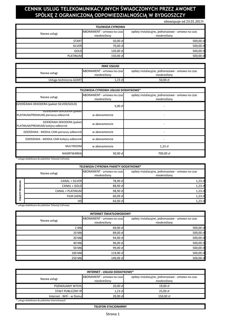 Cennik Usług Awonet, obowiązujący od 23 stycznia 2017