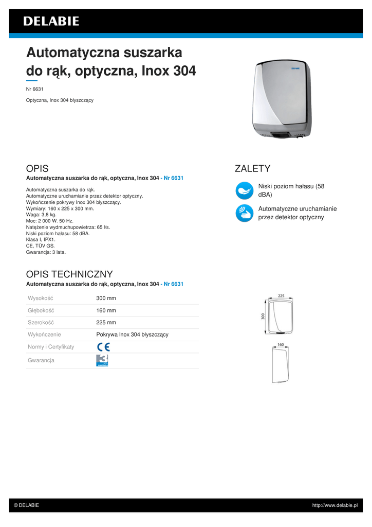 Automatyczna suszarka do rąk, optyczna, Inox 304 Nr 6631 Optyczna, Inox 304 błyszczący OPIS ZALETY Automatyczna suszarka do rąk, optyczna, Inox 304 - Nr 6631 Automatyczna suszarka do rąk. Automatyczne uruchamianie przez detektor optyczny. Wykończenie pokrywy Inox 304 błyszczący. Wymiary: 160 x 225 x 300 mm. Waga: 3,8 kg. Moc: 2 000 W. 50 Hz. Natężenie wydmuchupowietrza: 65 l/s. Niski poziom hałasu: 58 dBA. Klasa I, IPX1. CE, TÜV GS. Gwarancja: 3 lata. Niski poziom hałasu (58 dBA) Automatyczne uruchamianie przez detektor optyczny OPIS TECHNICZNY Automatyczna suszarka do rąk, optyczna, Inox 304 - Nr 6631 Wysokość 300 mm Głębokość 160 mm Szerokość 225 mm Wykończenie Pokrywa Inox 304 błyszczący Normy i Certyfikaty Gwarancja © DELABIE http://www.delabie.pl