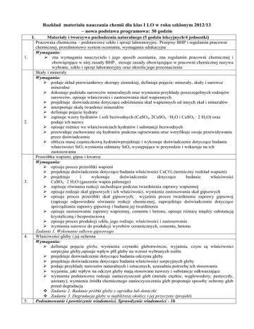 Rozkład materiału nauczania chemii dla klas I LO w roku szklonym 2012/13 – nowa podstawa programowa: 30 godzin I. 1. 2. 3. 4. 5. Materiały i tworzywa pochodzenia naturalnego (5 godzin lekcyjnych/4 jednostki) Pracownia chemiczna – podstawowe szkło i sprzęt laboratoryjny. Przepisy BHP i regulamin pracowni chemicznej, przedmiotowy system oceniania, wymagania edukacyjne Wymagania: zna wymagania nauczyciela i jego sposób oceniania, zna regulamin pracowni chemicznej i obowiązujące w niej zasady BHP, stosuje zasady obowiązujące w pracowni chemicznej nazywa wybrane, szkło i sprzęt laboratoryjny oraz określa jego przeznaczenie Skały i minerały Wymagania: podaje skład pierwiastkowy skorupy ziemskiej, definiuje pojęcia: minerały, skały i surowce mineralne dokonuje podziału surowców mineralnych oraz wymienia przykłady poszczególnych rodzajów surowców, opisuje właściwości i zastosowania skał wapiennych projektuje doświadczenie dotyczące odróżnienia skał wapiennych od innych skał i minerałów interpretuje skalę twardości minerałów definiuje pojęcie hydraty zapisuje wzory hydratów i soli bezwodnych (CaSO4, 2CaSO4 ∙ H2O i CaSO4 ∙ 2 H2O) oraz podaje ich nazwy opisuje różnice we właściwościach hydratów i substancji bezwodnych przewiduje zachowanie się hydratów podczas ogrzewania oraz weryfikuje swoje przewidywania przez doświadczenie oblicza masę cząsteczkową hydratówprojektuje i wykonuje doświadczenie dotyczące badania właściwości SiO2 wymienia odmiany SiO2 występujące w przyrodzie i wskazuje na ich zastosowania Przeróbka wapieni, gipsu i kwarcu Wymagania: opisuje proces przeróbki wapieni projektuje doświadczenie dotyczące badania właściwości CaCO3 (termiczny rozkład wapieni) projektuje i wykonuje doświadczenie dotyczące badania właściwości CaSO4 ∙ 2 H2O (gaszenie wapna palonego) zapisuje równania reakcji zachodzące podczas twardnienia zaprawy wapiennej opisuje rodzaje skał gipsowych i ich właściwości, wymienia zastosowania skał gipsowych opisuje proces przeróbki skał gipsowych, wyjaśnia proces twardnienia zaprawy gipsowej (zapisuje odpowiednie równanie reakcji chemicznej, zaprojektuje doświadczenie dotyczące sporządzania zaprawy gipsowej i badania jej twardnienia opisuje zastosowanie zaprawy wapiennej, cementu i betonu, opisuje różnicę między substancją krystaliczną i bezpostaciową opisuje proces produkcji szkła, jego rodzaje, właściwości i zastosowanie wymienia surowce do produkcji wyrobów ceramicznych, cementu, betonu Zadanie 1. Wykonanie odlewu gipsowego Właściwości gleby i jej ochrona Wymagania: definiuje pojęcie gleba, wymienia czynniki glebotwórcze, wyjaśnia, czym są właściwości sorpcyjne gleby,opisuje wpływ pH gleby na wzrost wybranych roślin projektuje doświadczenie dotyczące badania odczynu gleby projektuje doświadczenie dotyczące badania właściwości sorpcyjnych gleby podaje przykłady nawozów naturalnych i sztucznych, uzasadnia potrzebę ich stosowania wyjaśnia, jaki wpływ na odczyn gleby mają stosowane nawozy i substancje odkwaszające wymienia podstawowe rodzaje zanieczyszczeń gleb (metale ciężkie, węglowodory, pestycydy, azotany), wymienia źródła chemicznego zanieczyszczenia gleb proponuje sposoby ochrony gleb przed degradacją Zadanie 2. Badanie próbki gleby z ogródka lub doniczki Zadanie 3. Degradacja gleby w najbliższej okolicy i jej przyczyny (projekt) Podsumowanie i powtórzenie wiadomości. Sprawdzenie wiadomości - 1h II. Źródła energii (5 godzin lekcyjnych/5 jednostek) Rodzaje paliw kopalnych Wymagania: definiuje pojęcia: paliwa i węgle kopalne opisuje właściwości poszczególnych rodzajów paliw kopalnych (gazu ziemnego, ropy naftowej, węgli kopalnych) 6. wyjaśnia pojęcie alotropia pierwiastków chemicznych wymienia odmiany alotropowe węgla pierwiastkowego opisuje właściwości diamentu, grafitu i fulerenów na podstawie znajomości ich budowy wymienia zastosowania diamentu, grafitu i fulerenów wynikające z ich właściwości definiuje pojęcia: grafen, karbin i nanorurki oraz podaje ich właściwości i zastosowania podaje przykłady surowców naturalnych wykorzystywanych do uzyskiwania energii (bezpośrednio i po przetworzeniu) projektuje doświadczenie dotyczące badania właściwości ropy naftowej Zadanie 4. Odmiany alotropowe wybranego pierwiastka chemicznego (z wyjątkiem węgla)projekt) Przeróbka ropy naftowej i węgla kamiennego Wymagania: opisuje przebieg destylacji ropy naftowej opisuje przebieg pirolizy węgla kamiennego 7. wymienia nazwy produktów procesu destylacji ropy naftowej i pirolizy węgla kamiennego opisuje zastosowania produktów procesu destylacji ropy naftowej wymienia zastosowania produktów pirolizy węgla kamiennego proponuje rodzaje szkła laboratoryjnego niezbędnego do wykonania doświadczenia dotyczącego destylacji ropy naftowej projektuje doświadczenie dotyczące suchej destylacji węgla kamiennego opisuje proces zgazowania węgla kamiennego i otrzymania gazu syntezowego Zadanie 5. Właściwości i zastosowanie wybranej frakcji ropy naftowej (projekt) Benzyna – otrzymywanie i właściwości Wymagania: definiuje pojęcie benzyna, wymienia właściwości i zastosowania benzyny projektuje doświadczenie dotyczące badania właściwości benzyny opisuje sposób gaszenia palącej się benzyny, definiuje pojęcie liczba oktanowa (LO) 8. wymienia i opisuje sposoby zwiększania LO benzyny wyjaśnia, na czym polegają kraking i reforming wyjaśnia, w jakim celu przeprowadza się procesy krakingu i reformingu, zapisuje wzory półstrukturalne (grupowe) wybranych, prostych, węglowodorów rozgałęzionych i cyklicznych podaje przykłady, środków przeciwstukowych Sposoby pozyskiwania energii a środowisko przyrodnicze Wymagania: definiuje pojęcia: gazy cieplarniane, globalne ocieplenie, efekt cieplarniany, kwaśne opady, smog oraz podaje przyczyny występowania tych zjawisk 9. wymienia alternatywn